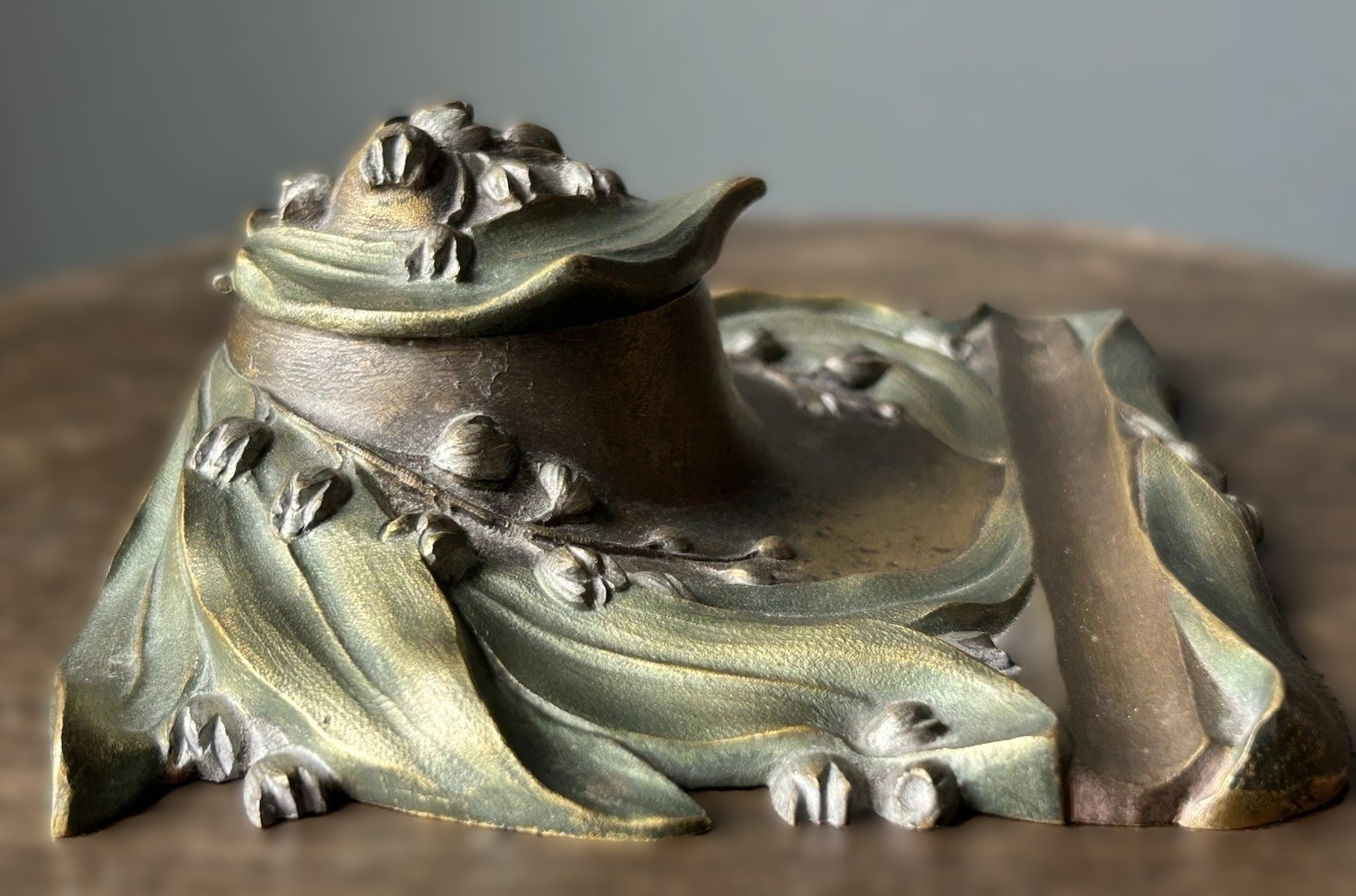 - Inkwell and Lid: The inkwell itself is subtly integrated into the raised section of the design, beneath a hinged lid. The lid is also shaped and decorated with organic lines, echoing the floral theme, and blends into the overall sculptural form.