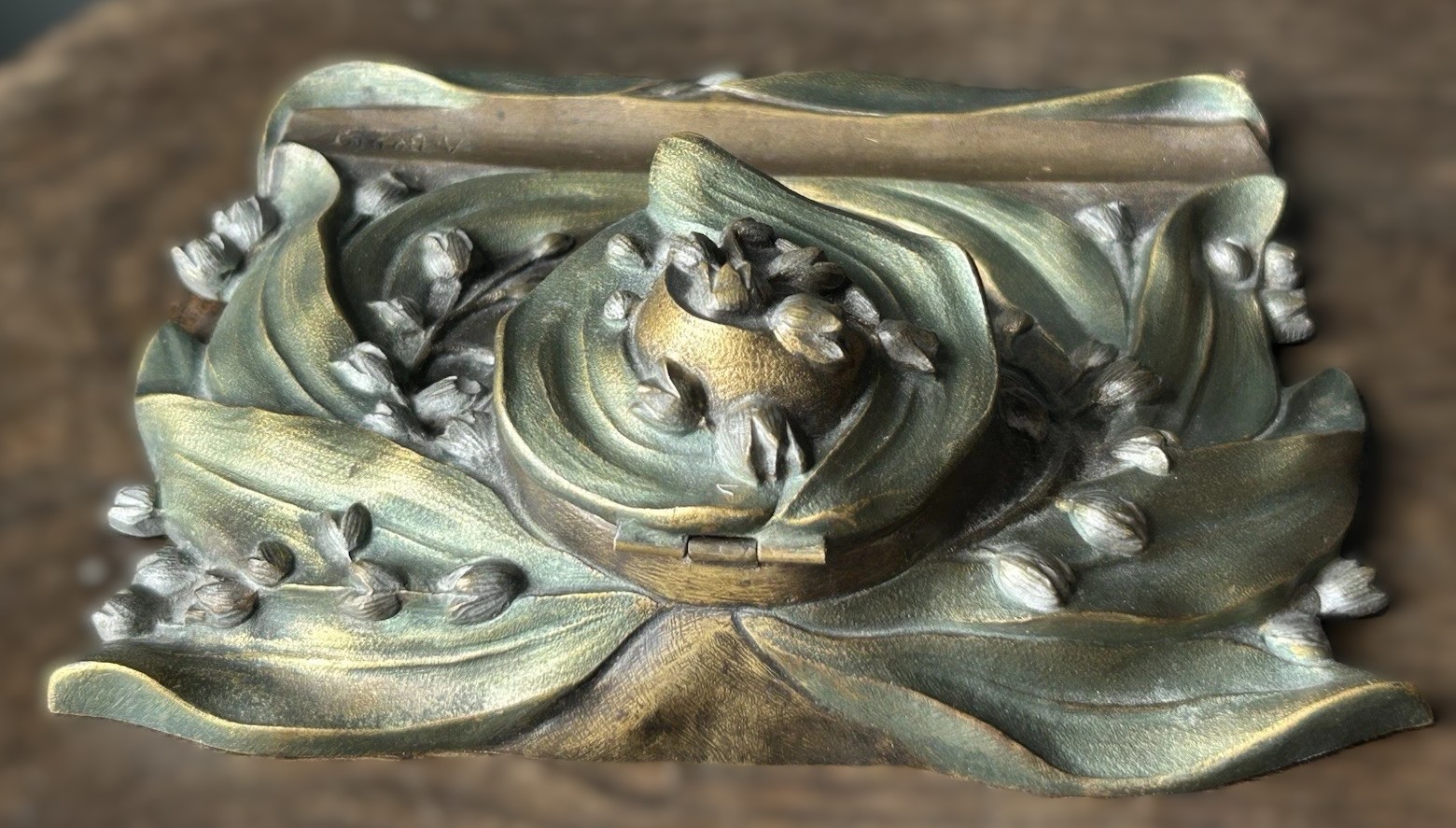 - Botanical Decoration: The inkstand is heavily adorned with finely modeled leaves and flowers. The prominent long, slender leaves and bell-shaped flowers are characteristic of lily of the valley (also known as convallaria majalis). These elements are rendered with a graceful, sinuous quality, typical of Art Nouveau’s embrace of natural forms.
