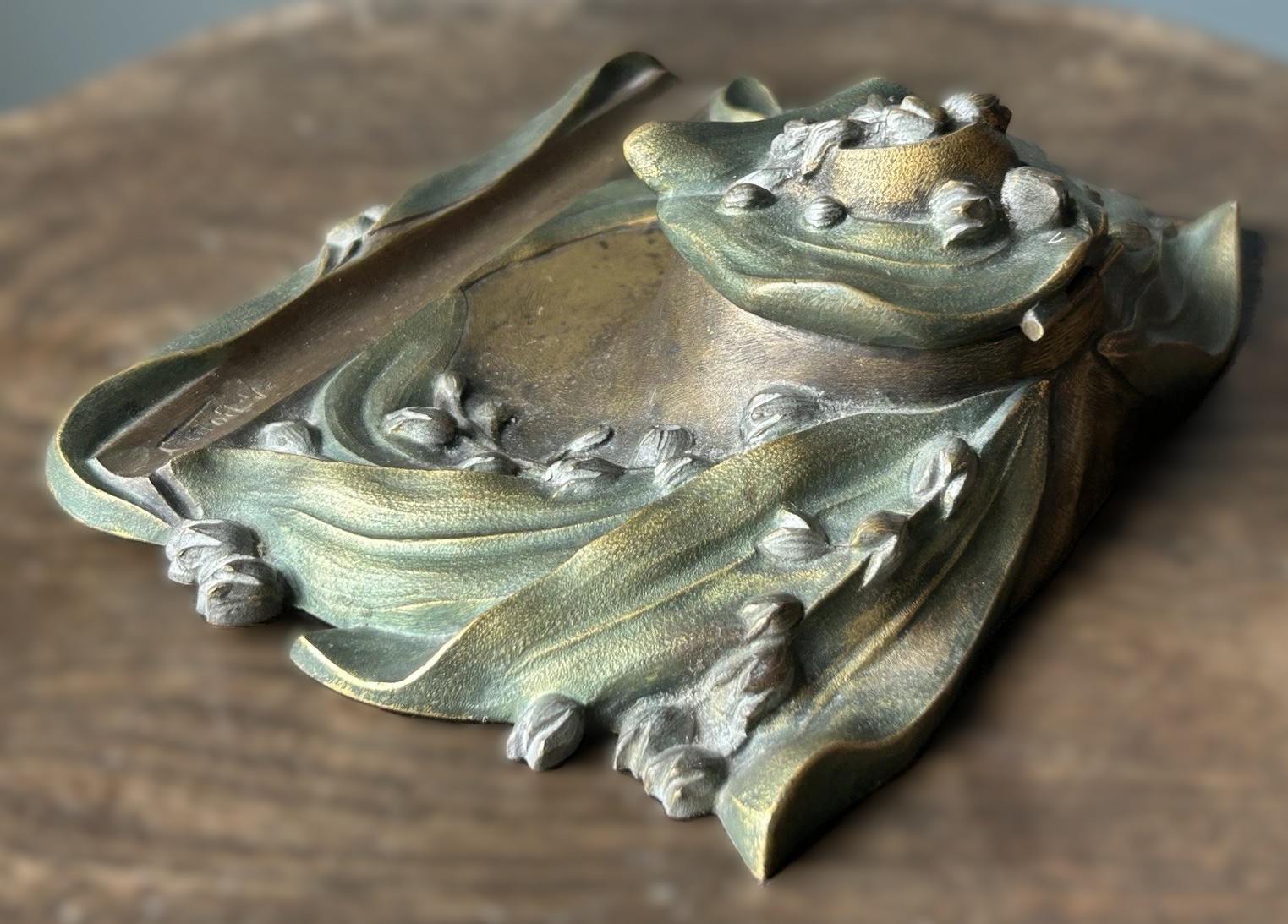 This bronze inkstand exemplifies the flowing, organic aesthetics of the Art Nouveau style.
