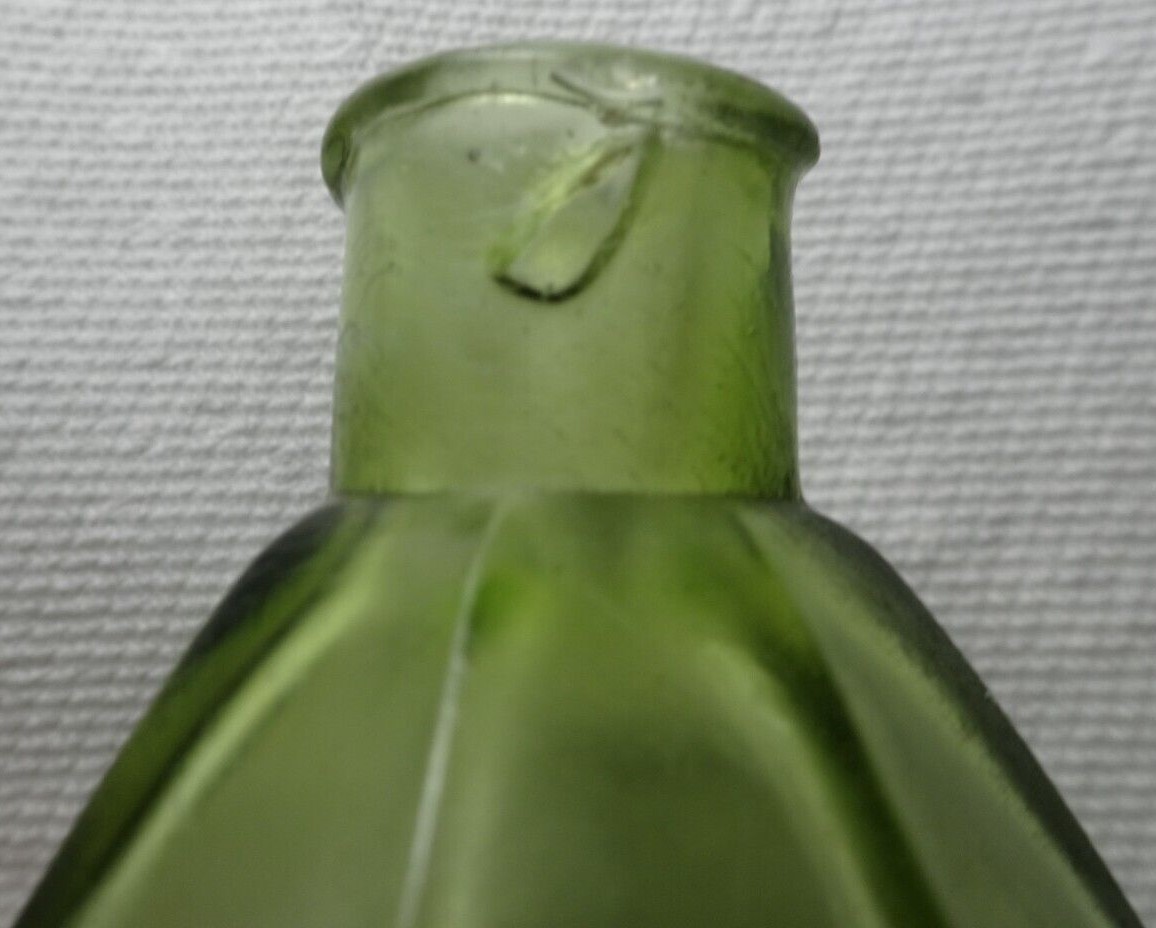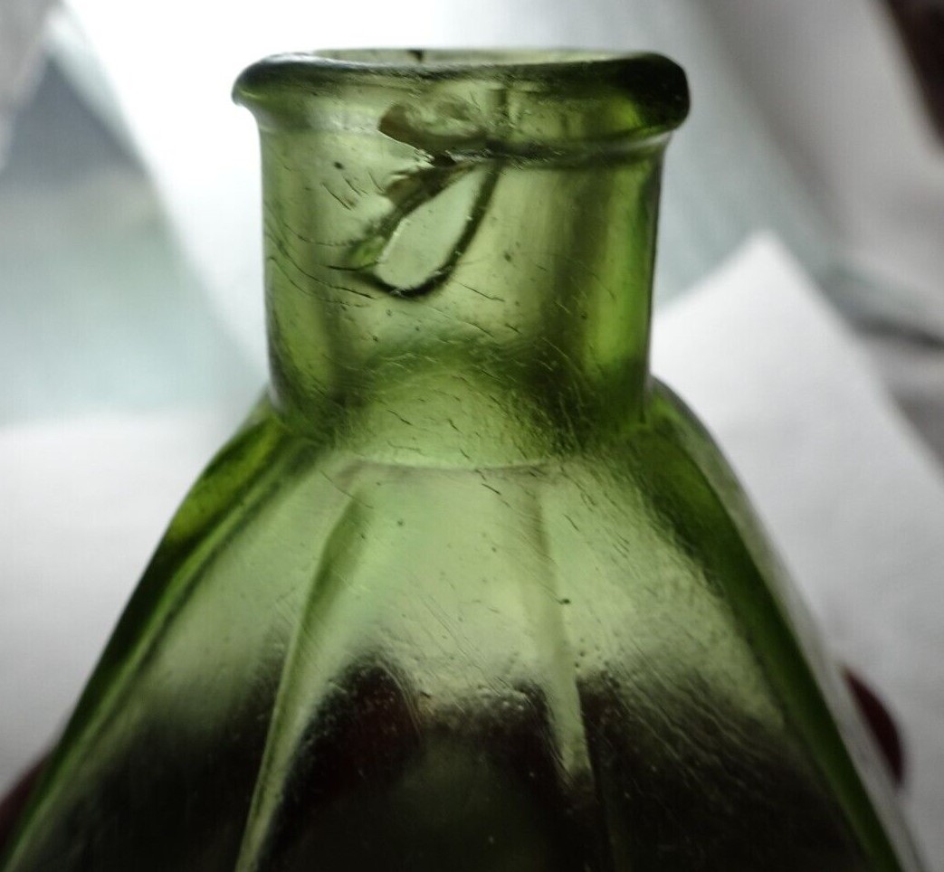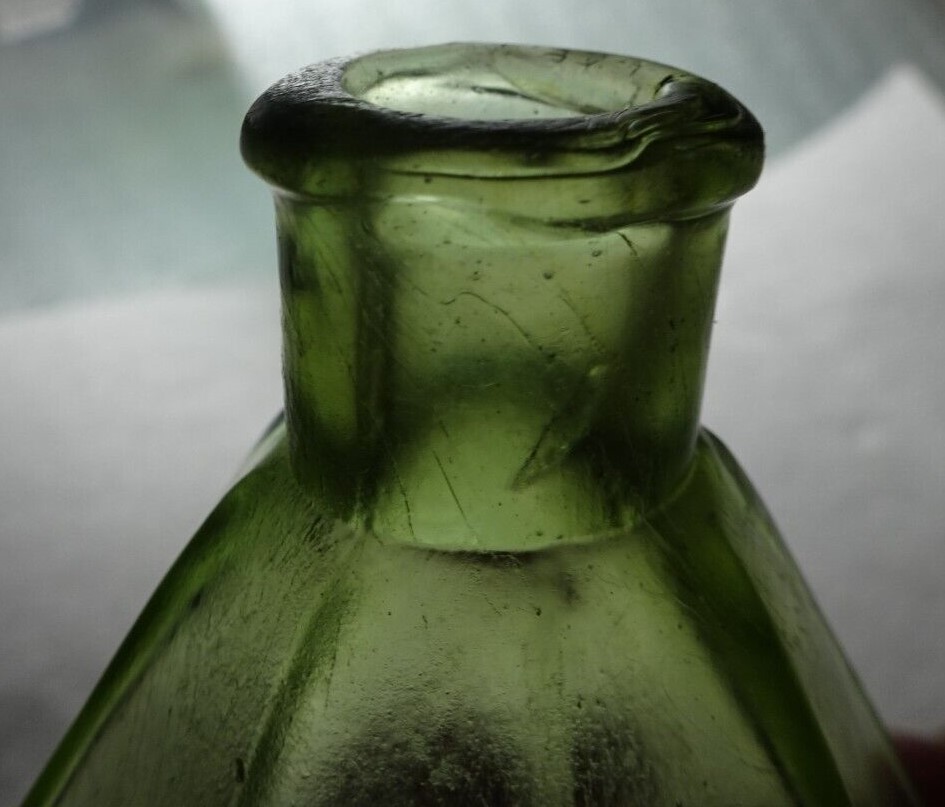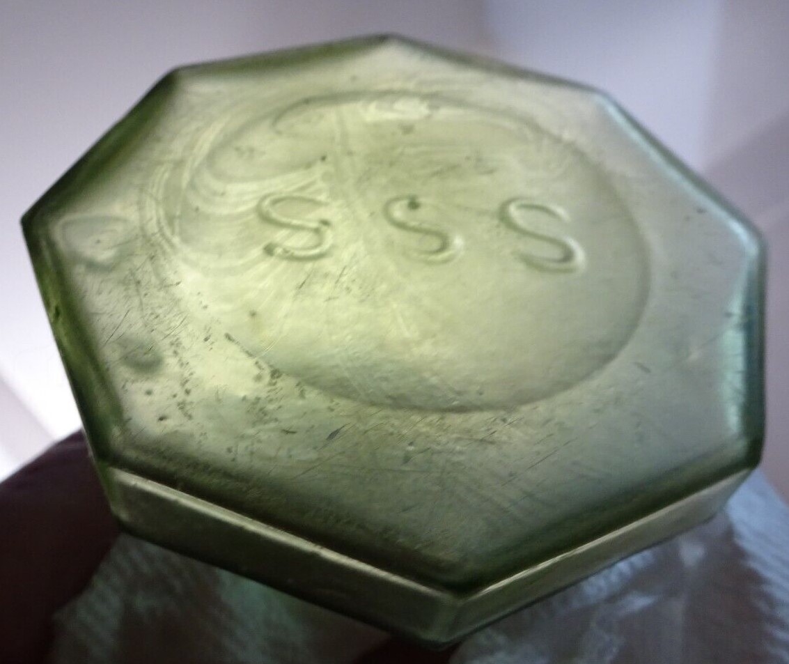 8-sided umbrella ink bottle with a roll lip and marked “S S S” on the base. It has an open bubble inside the lip. There’s an overall light dullness from being a dug bottle.