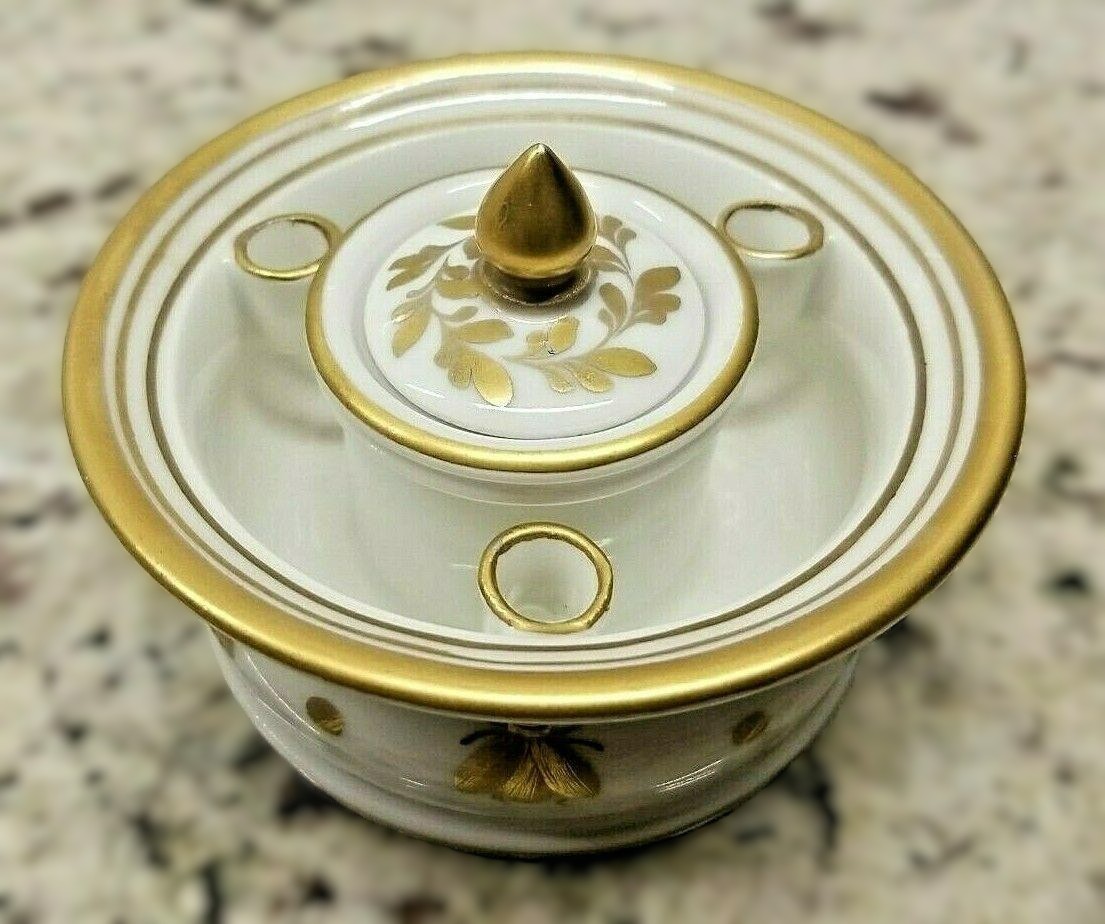 - Color Palette: Both inkwells utilize a classic Empire Style color scheme, combining bright white glazed porcelain with heavy 24k gold gilding on the rims, base, and decorative accents.