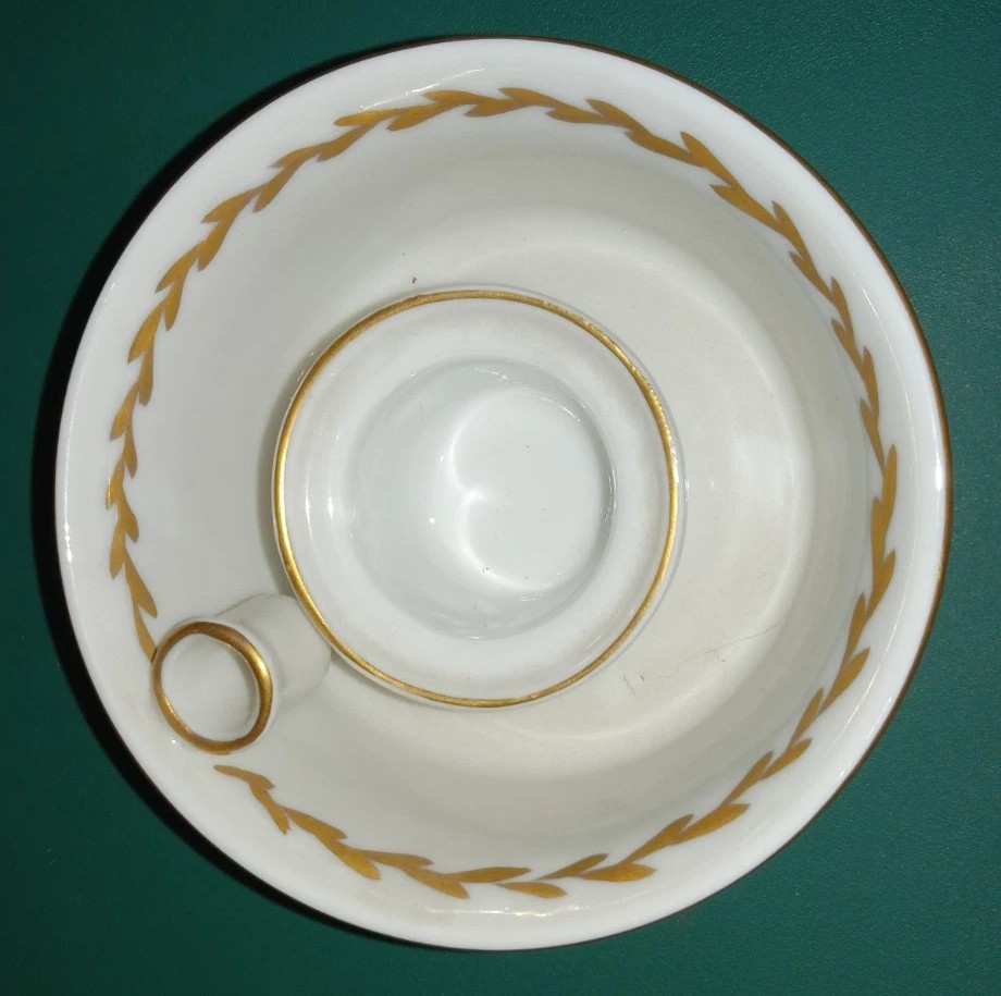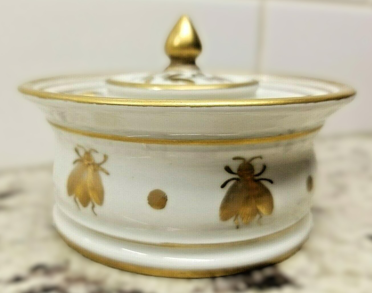 - Imperial Motif: Both pieces feature large, hand-painted or stenciled golden bees around the exterior of the main bowl. This symbol was famously adopted by Napoleon Bonaparte as a sign of industry and immortality.