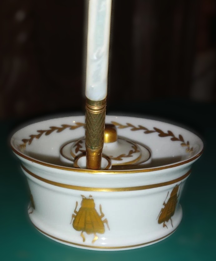 Pictured are two similar inkwells marked Limoges. Based on the bottom marks and the “bee design” motif (a symbol famously associated with Napoleon Bonaparte), these two inkwells come from different production eras and manufacturers.