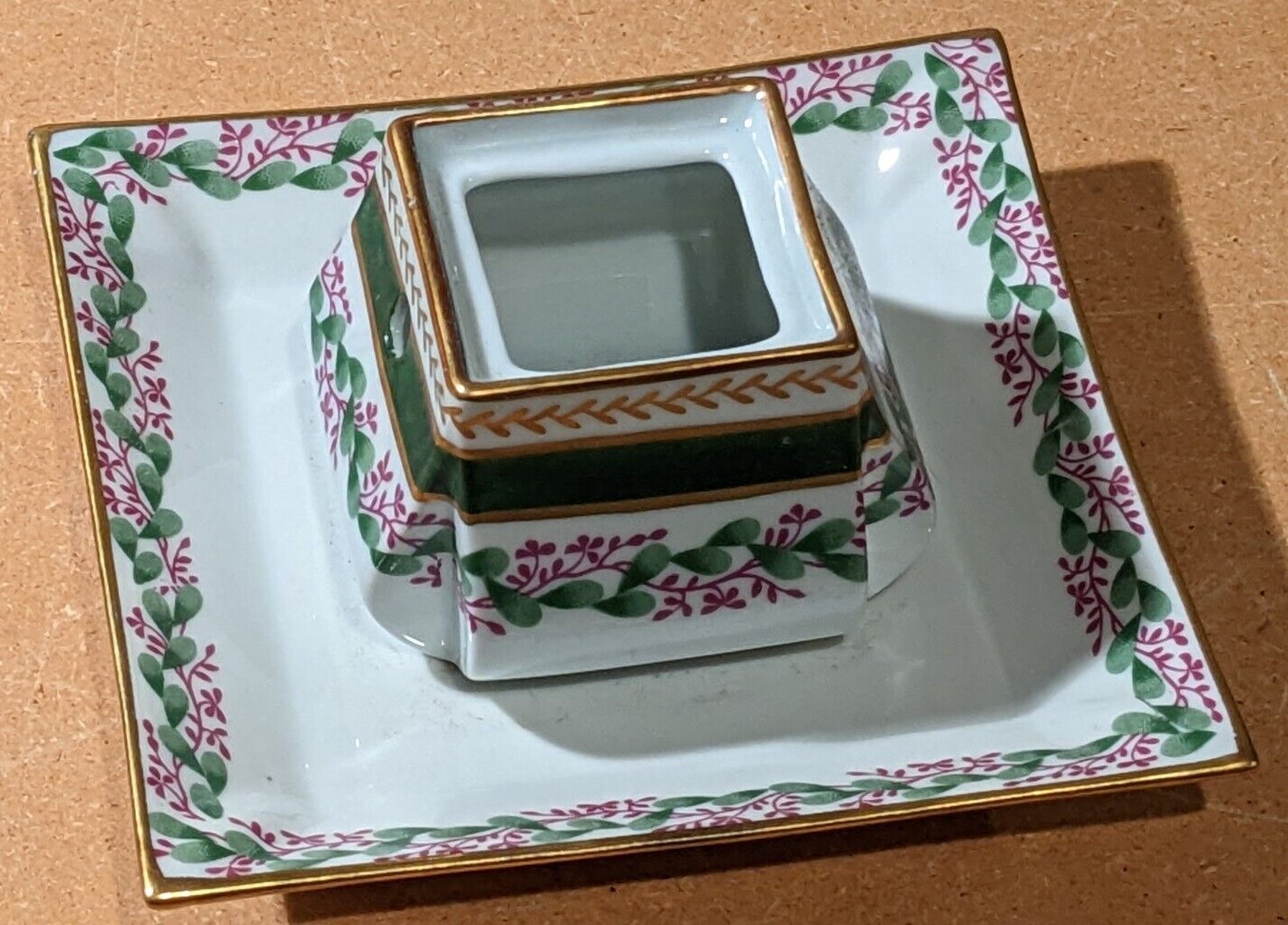 Inkwell marked Limoges attached to square contour base is decorated with a magenta / green vine pattern with gold trim.