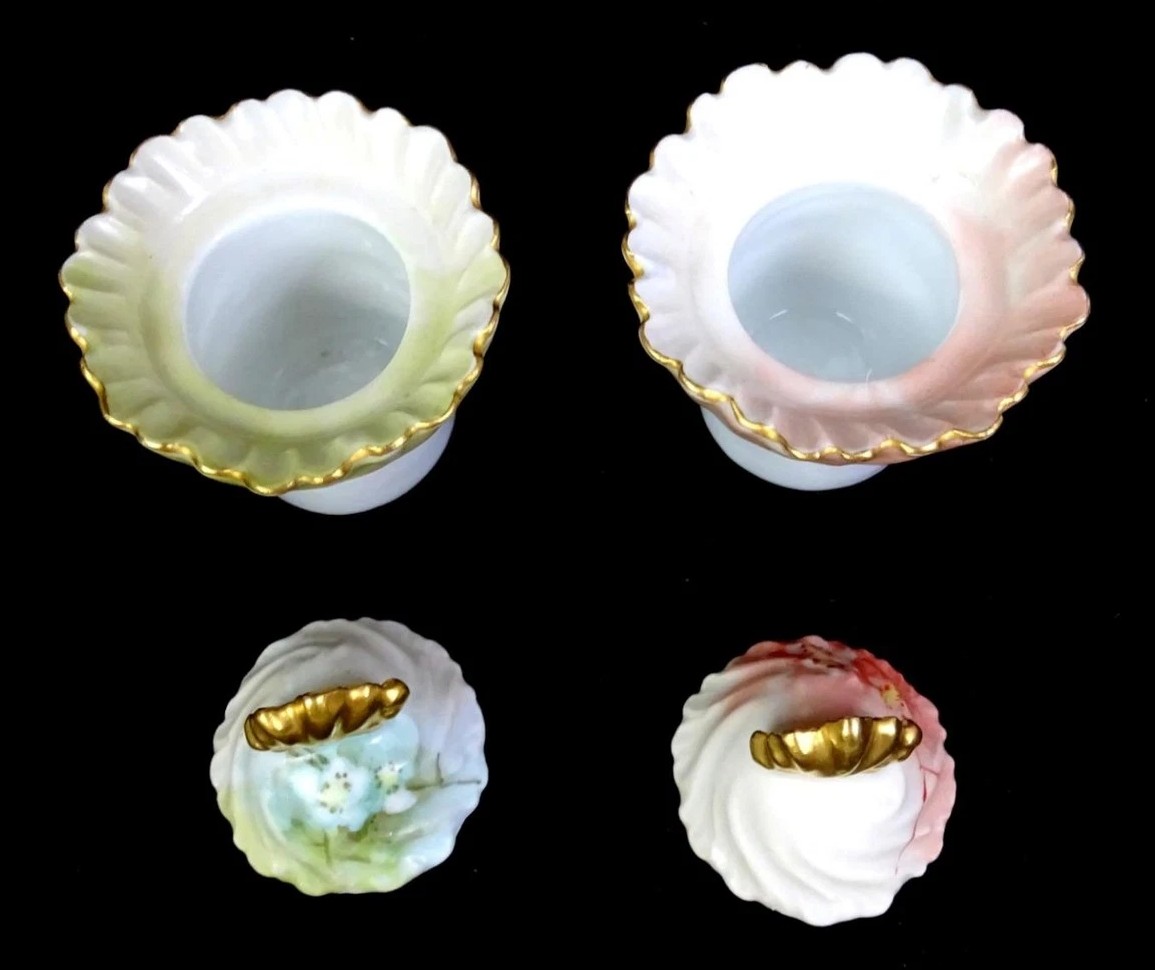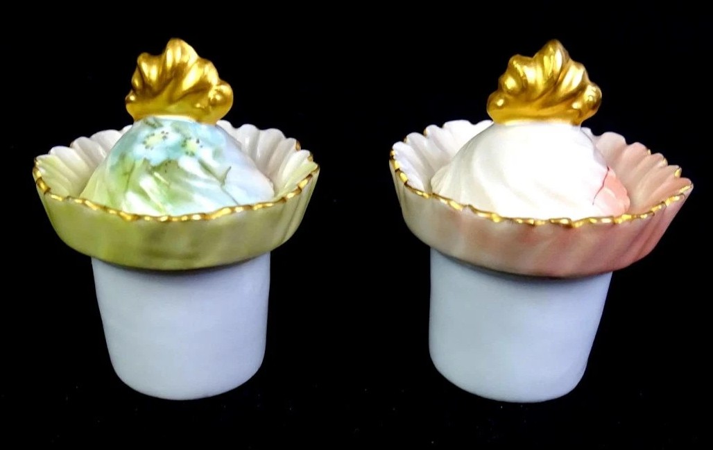 - The Lids: The set retains its original matching lids. These are particularly lovely, featuring a swirled or “puffed” shape topped with a gold fan or shell-shaped finial. The lids are painted to match the gradient of the base—one is tinged with green/blue and the other with pink.