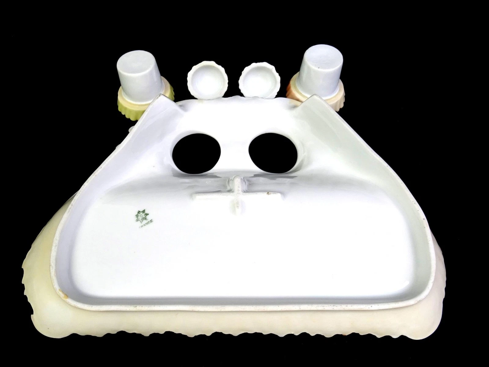 - Components: It is a Double Inkstand with two removable porcelain inserts that sit into the raised back section.