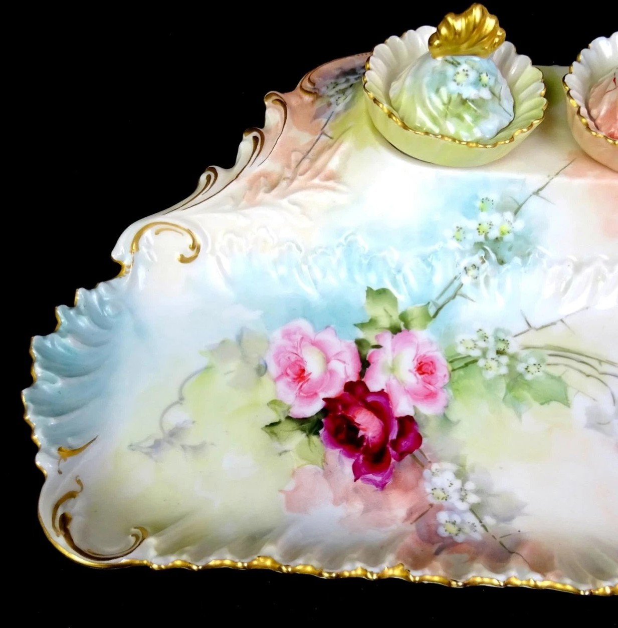 - Gold Trim: The embossed scrolls and the rims are heavily accented with gilding (gold leaf).