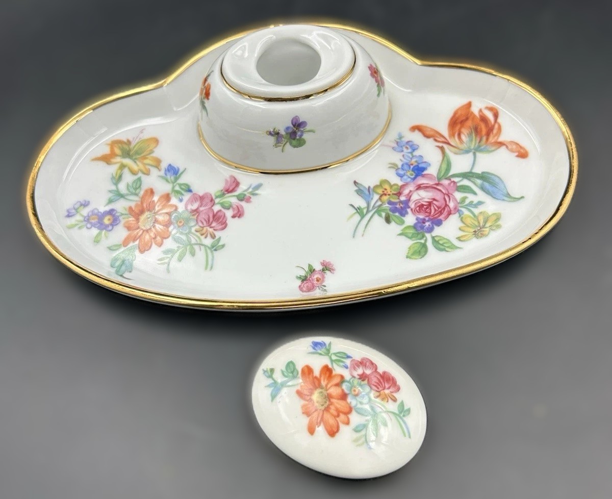 - Inkwell: The central inkwell has a gold-rimmed opening and is topped with a separate, lift-off lid. The lid is oval or round and features a matching floral motif.