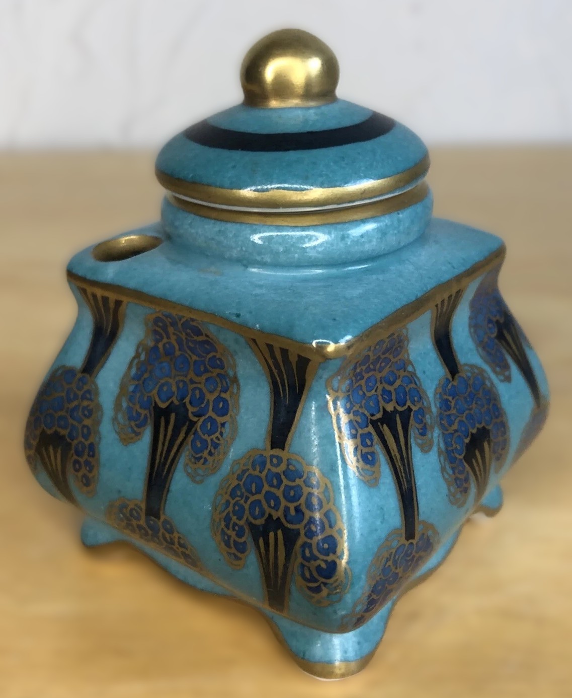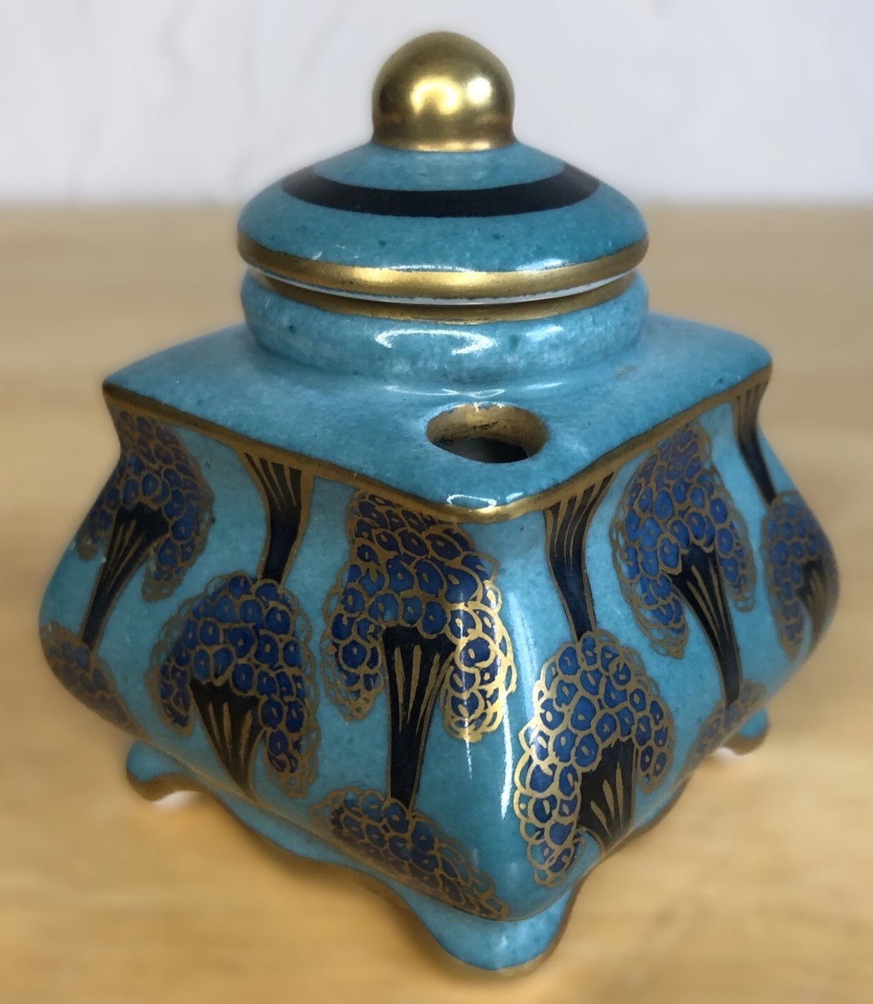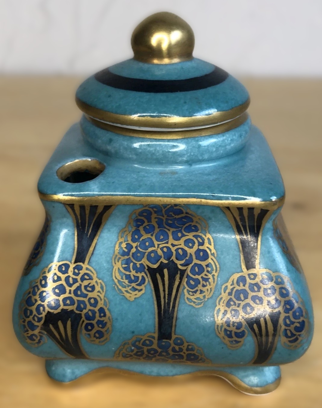 - Form: A circular or drum-shaped inkwell with a separate lid. It sits on a slightly raised foot. The lid is slightly domed.