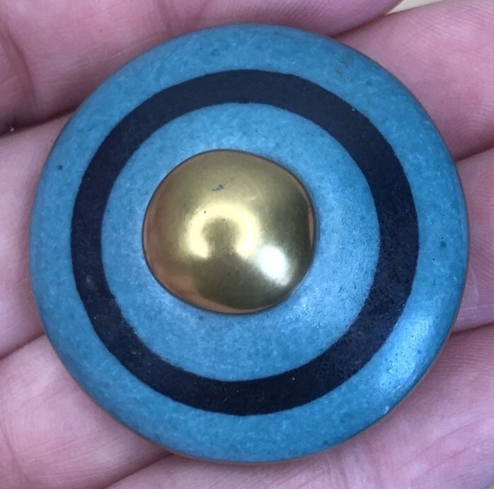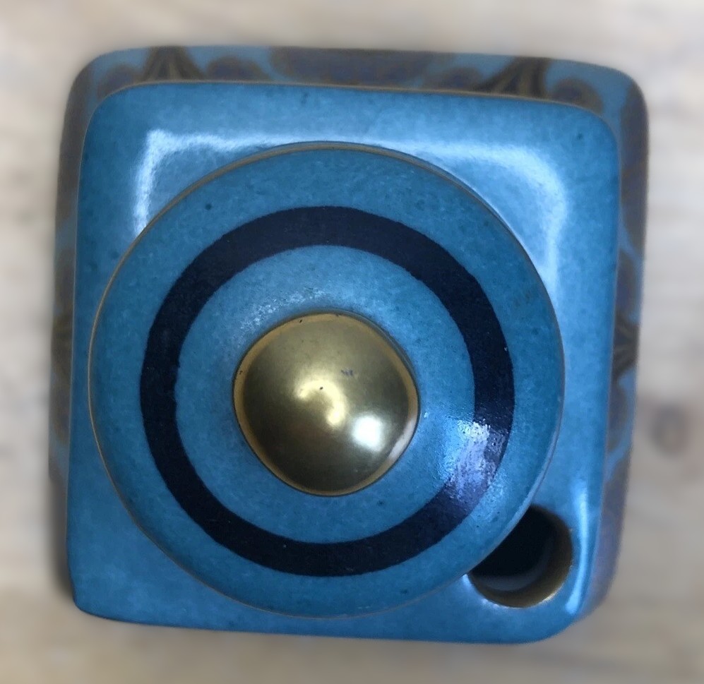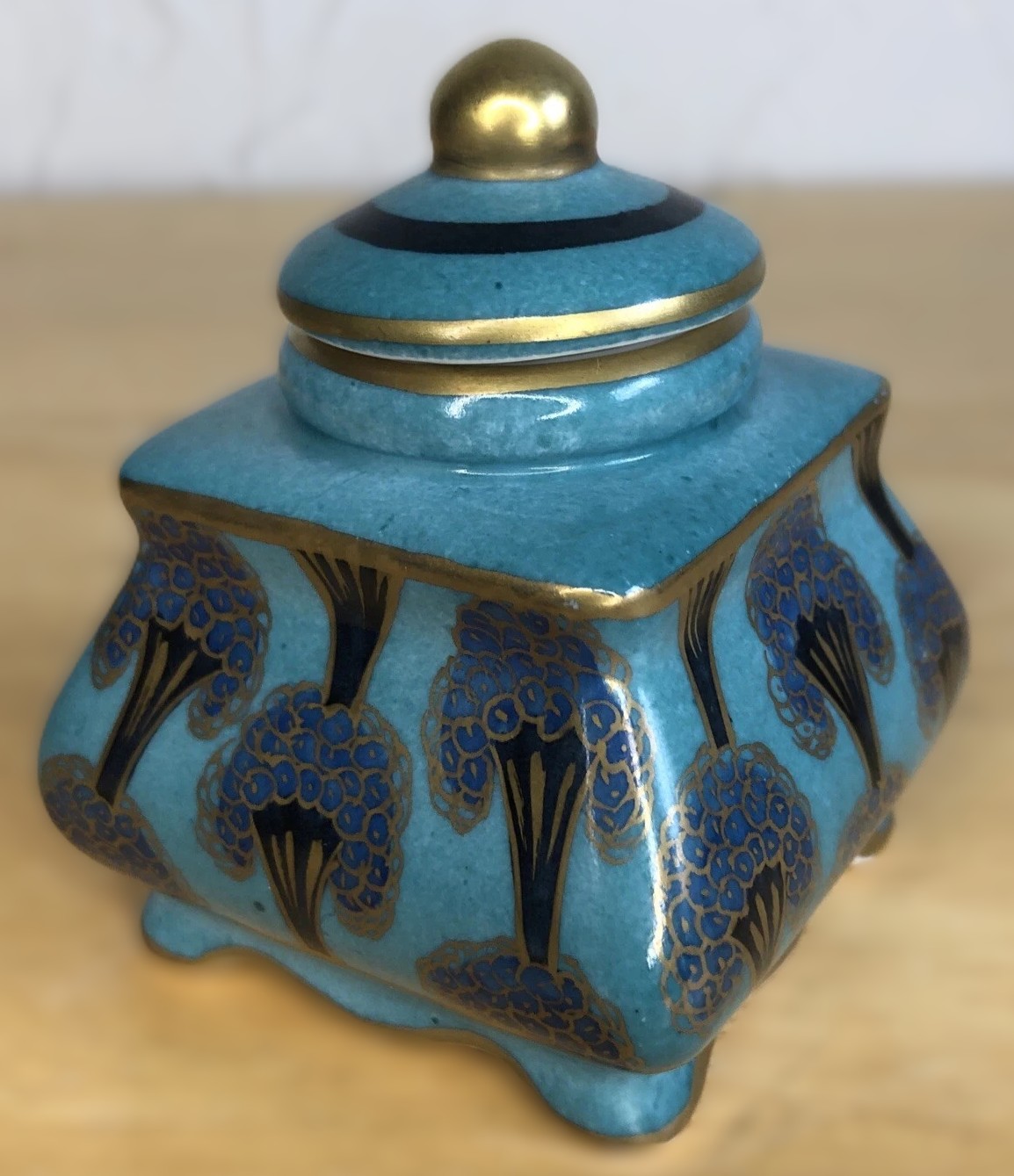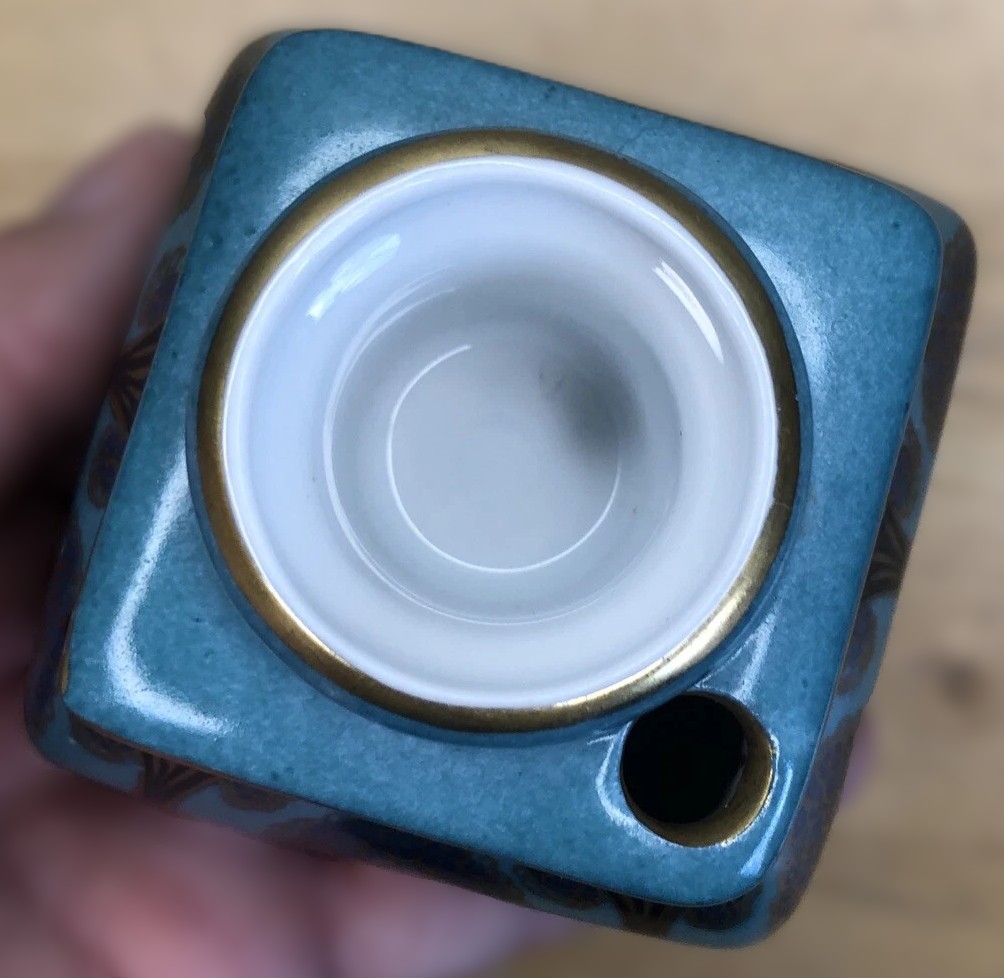 - Form: A circular or drum-shaped inkwell with a separate lid. It sits on a slightly raised foot. The lid is slightly domed.