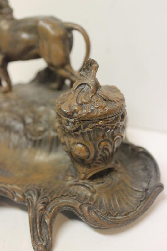Bronzed spelter double inkstand with pen tray featuring a lion standing above two inkwells with hinged lids. Signed A. BOSSU