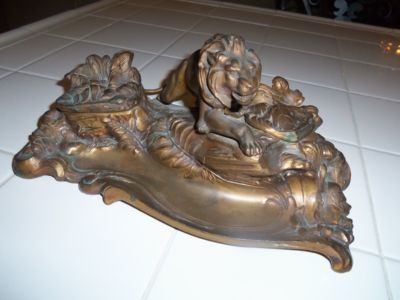- Inkwells: There are two inkwells, one on each side of the central figure. These wells are covered with hinged lids that are designed to resemble bushes or foliage, integrating the utilitarian parts into the overall jungle scene.
