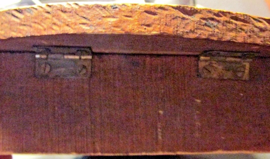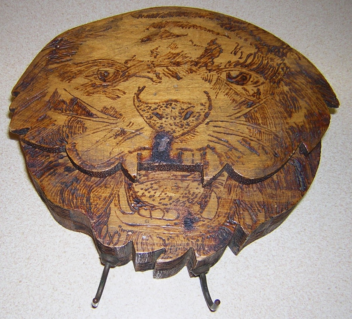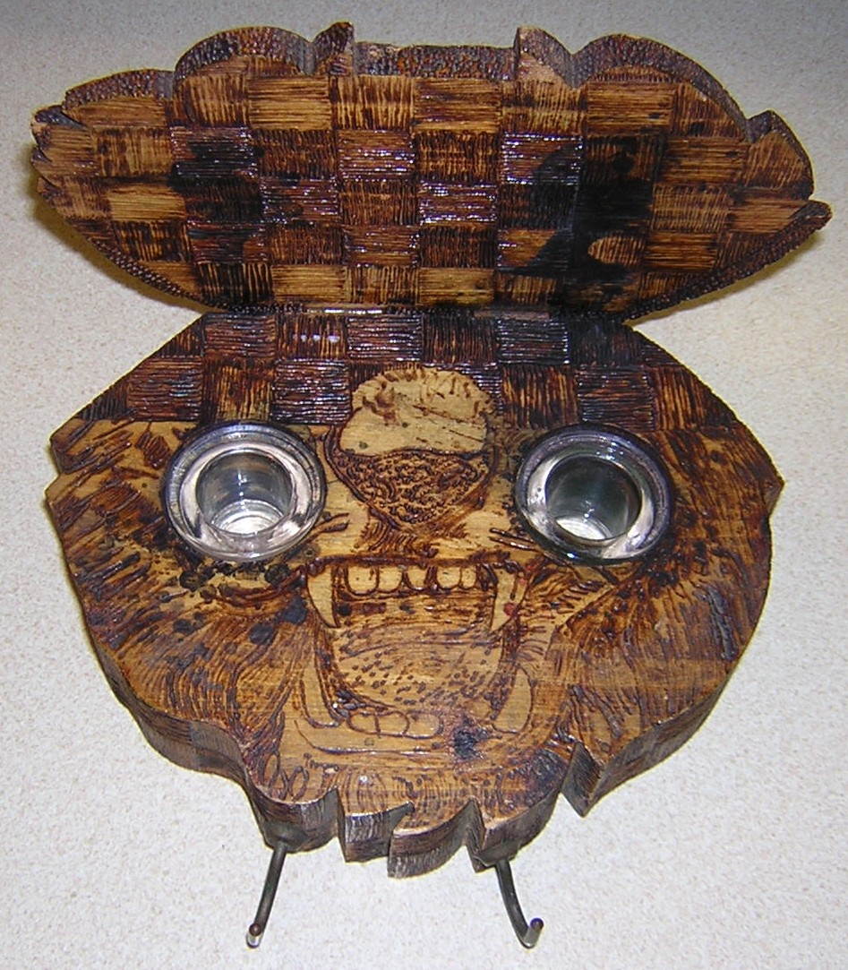 Pyrography – the burning of designs onto wood – was a turn of the century artistic past time. This inkwell, shaped in the head of a lion or tiger, has a partial label, showing Pyro-Art.