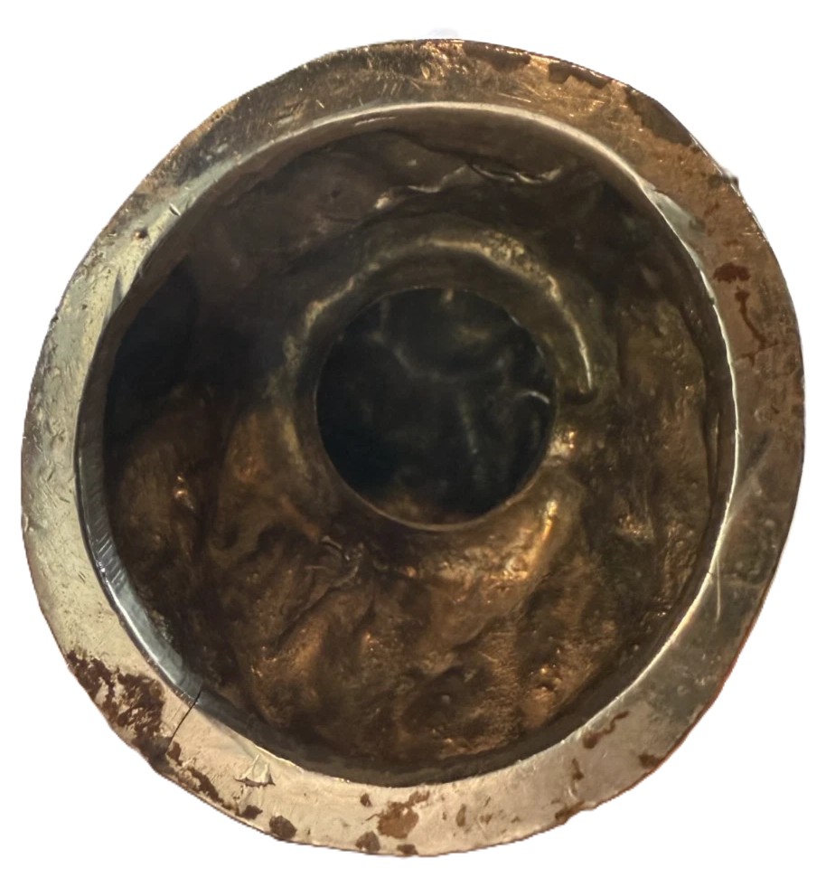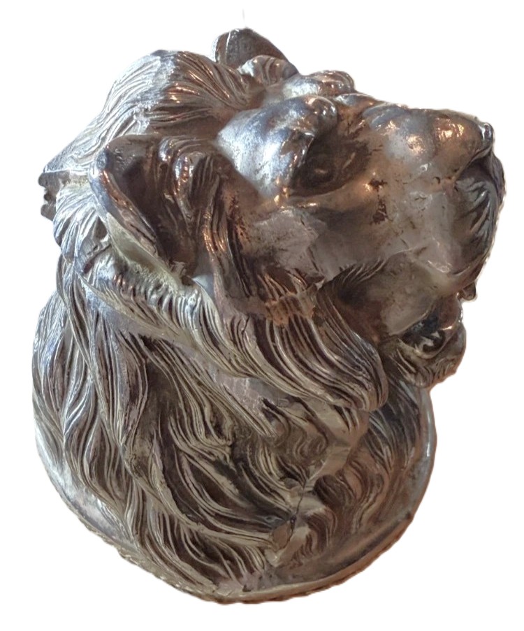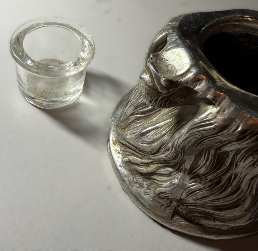 - Inkwell: The top of the lion’s head is hinged, opening to reveal a circular glass well designed to hold ink. The hinge is located at the back of the head.