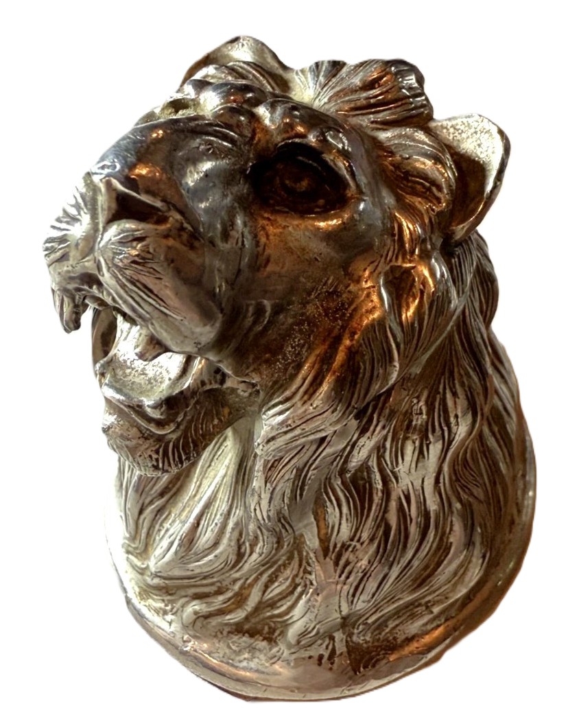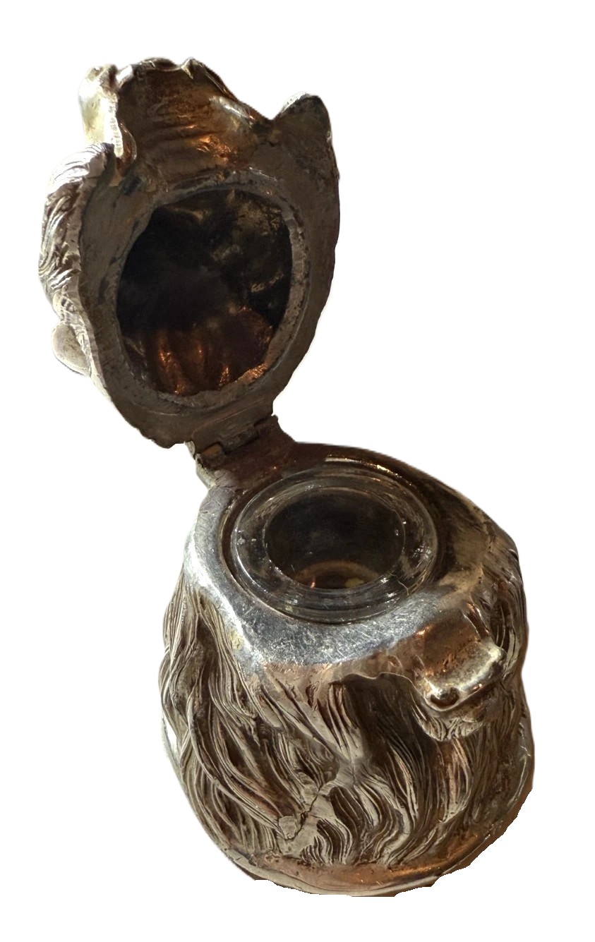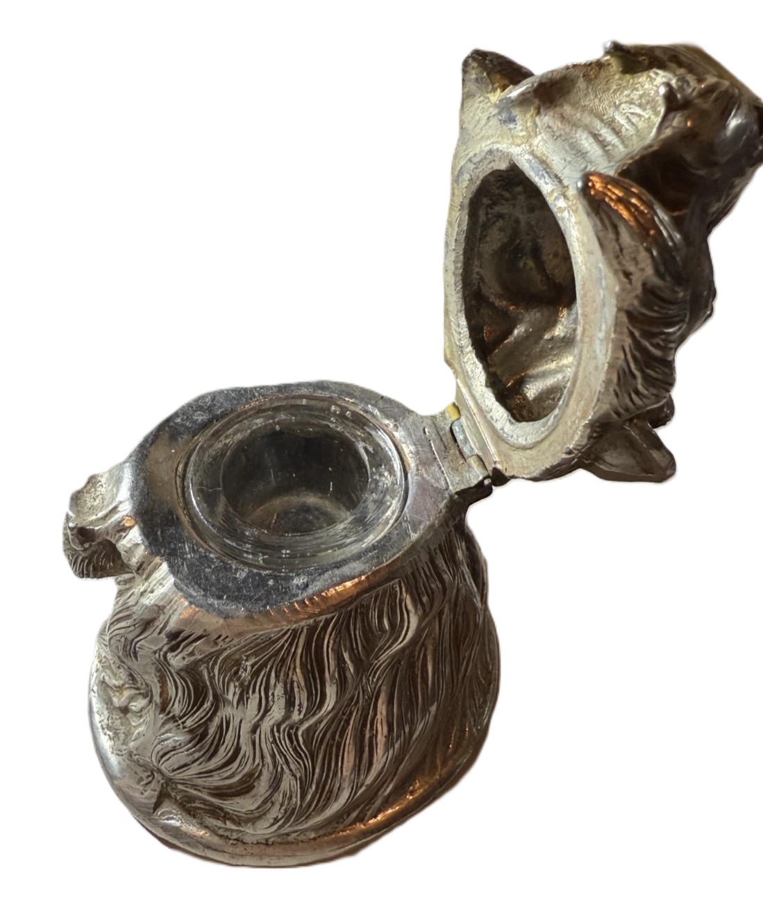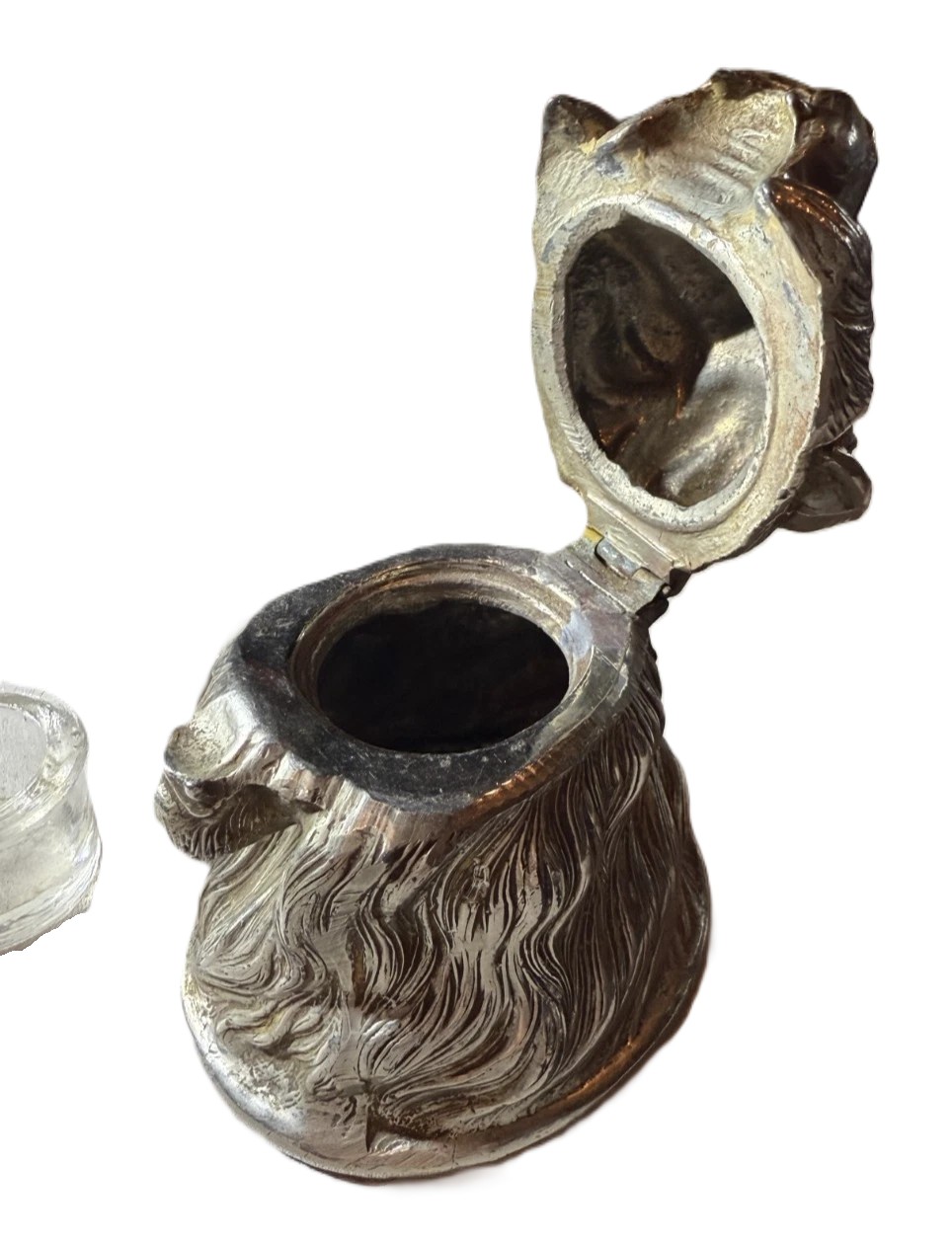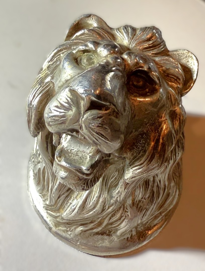 This is a silver-plated inkwell in the form of a detailed lion’s head. The piece is crafted from a base metal with a silver plating.