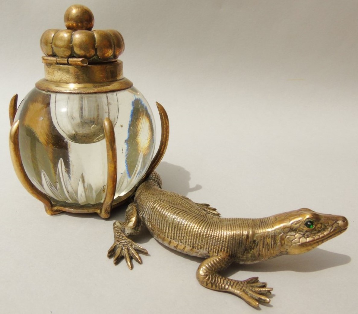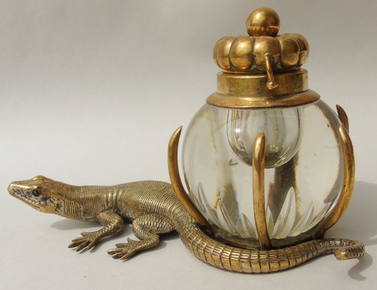 This inkstand features a gilt bronze lizard with glass eyes, intricately detailed with lifelike features, including its claws and scales. The lizard wraps around the base of an inkwell, which is made of clear glass and has a spherical shape and a crown-like hinged lid. Claw-like supports hold the glass inkwell in place.