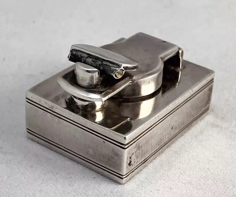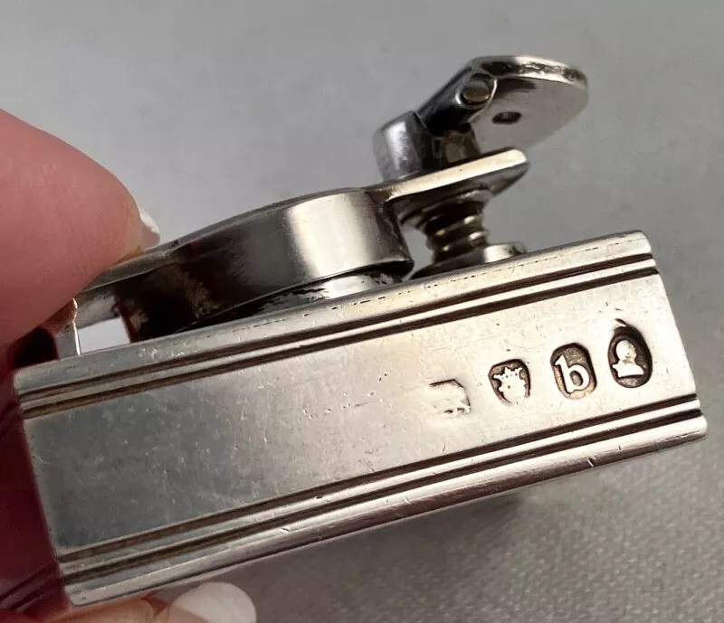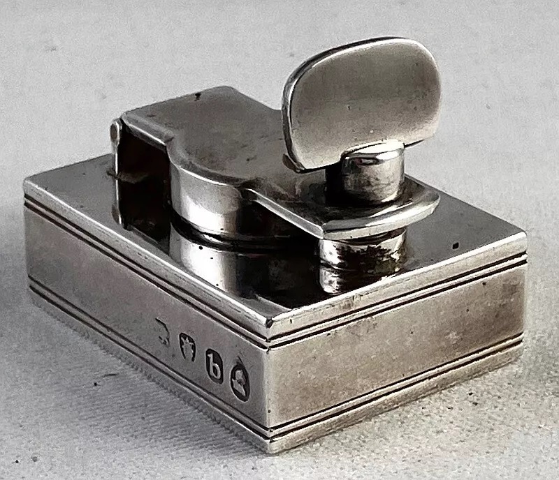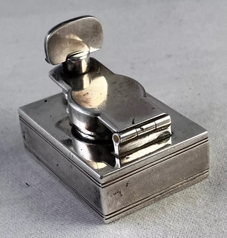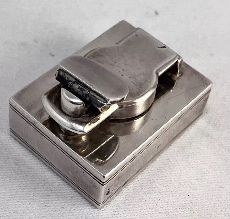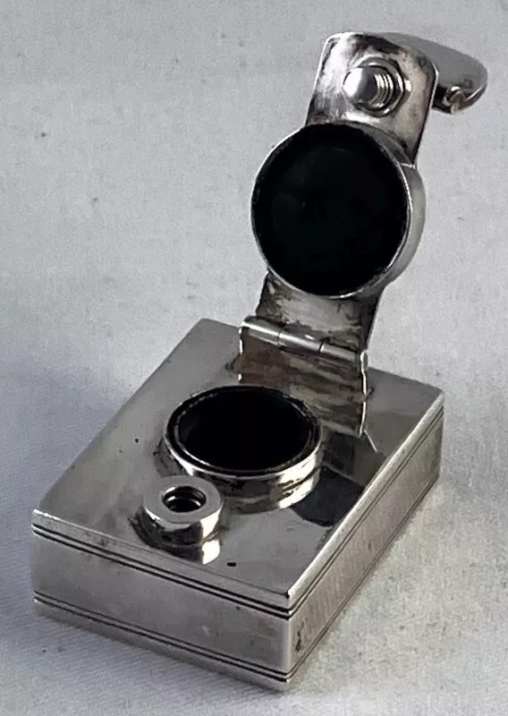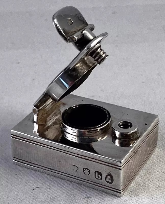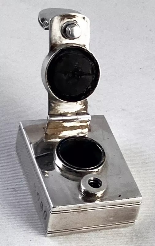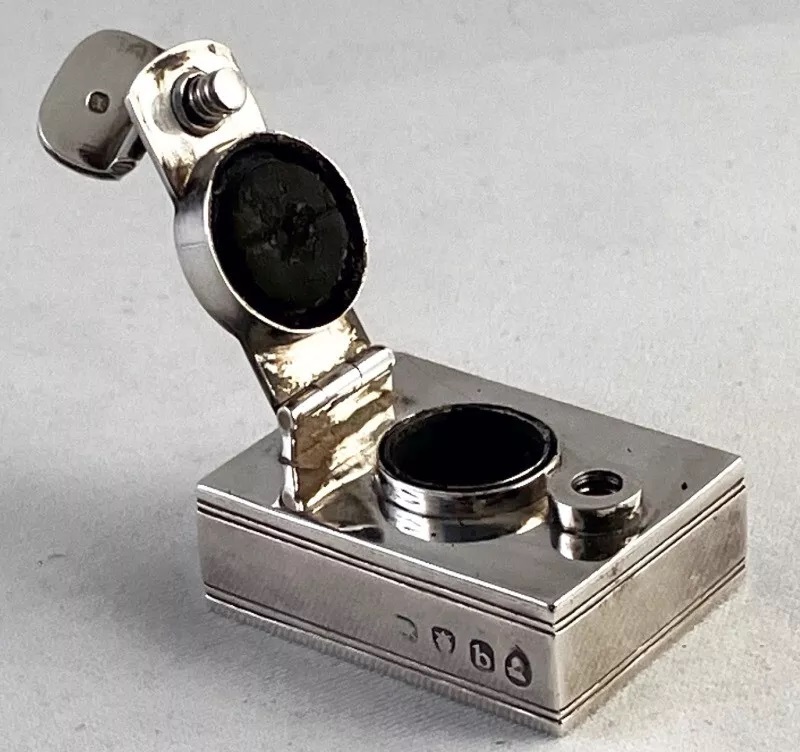 This diminutive “pocket” sterling “lock-down” travel inkwell was produced in London in 1817. It is hallmarked with the lion passant, the crowned leopard head (used until 1822, after which the leopard lost his crown), the date mark lower case “b” for 1817, and the right-facing George III (1726-1821). It also is hallmarked with a tiny lion passant under the screw-tab. The hinge and screw-tab work perfectly.