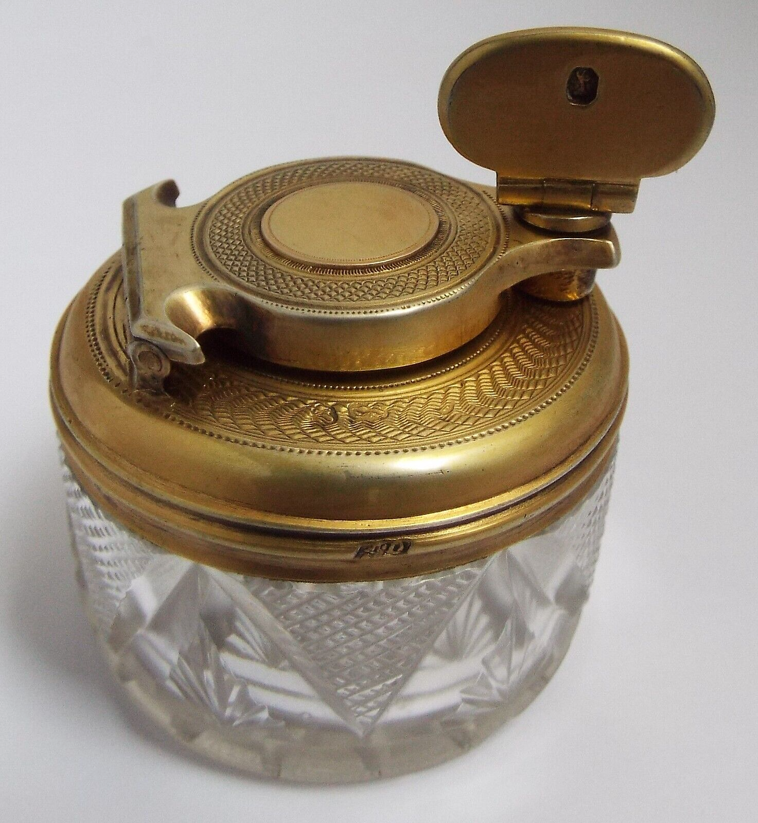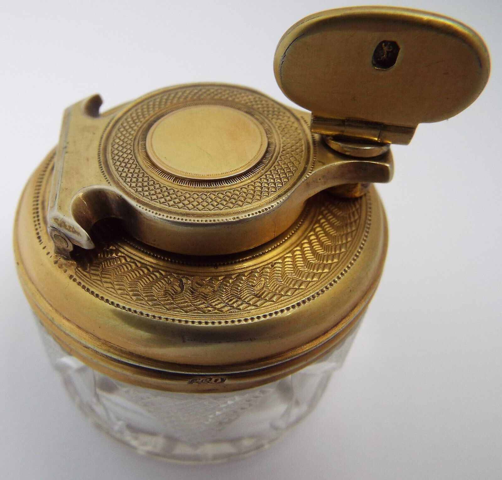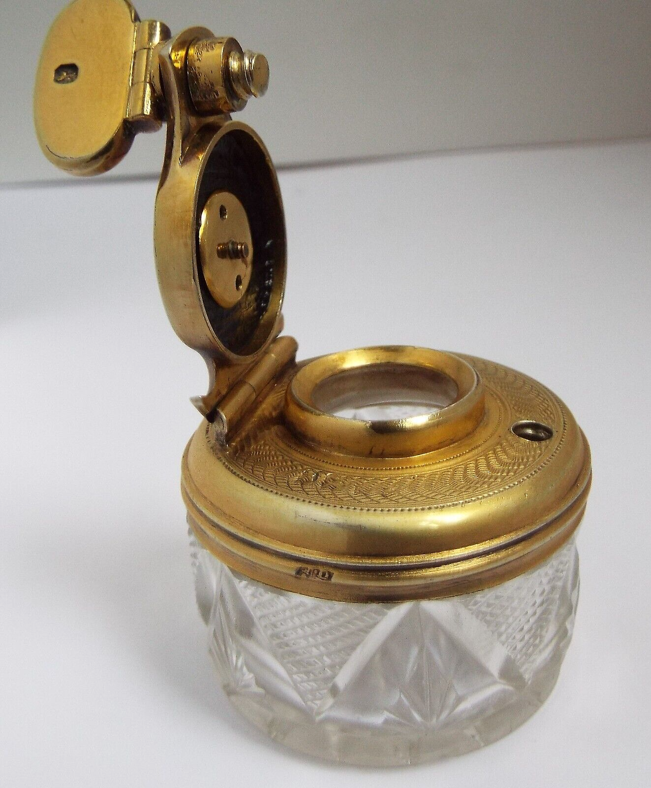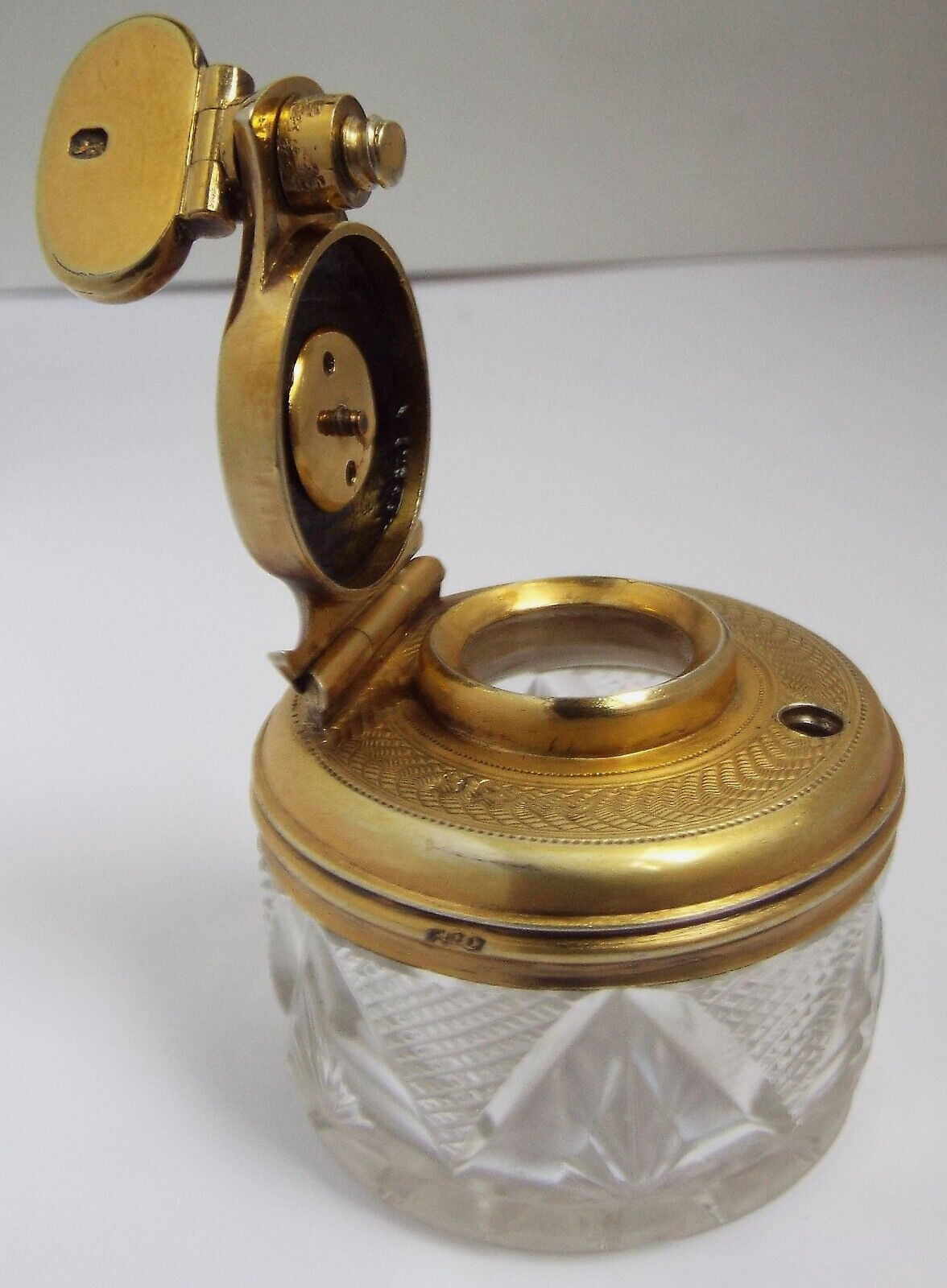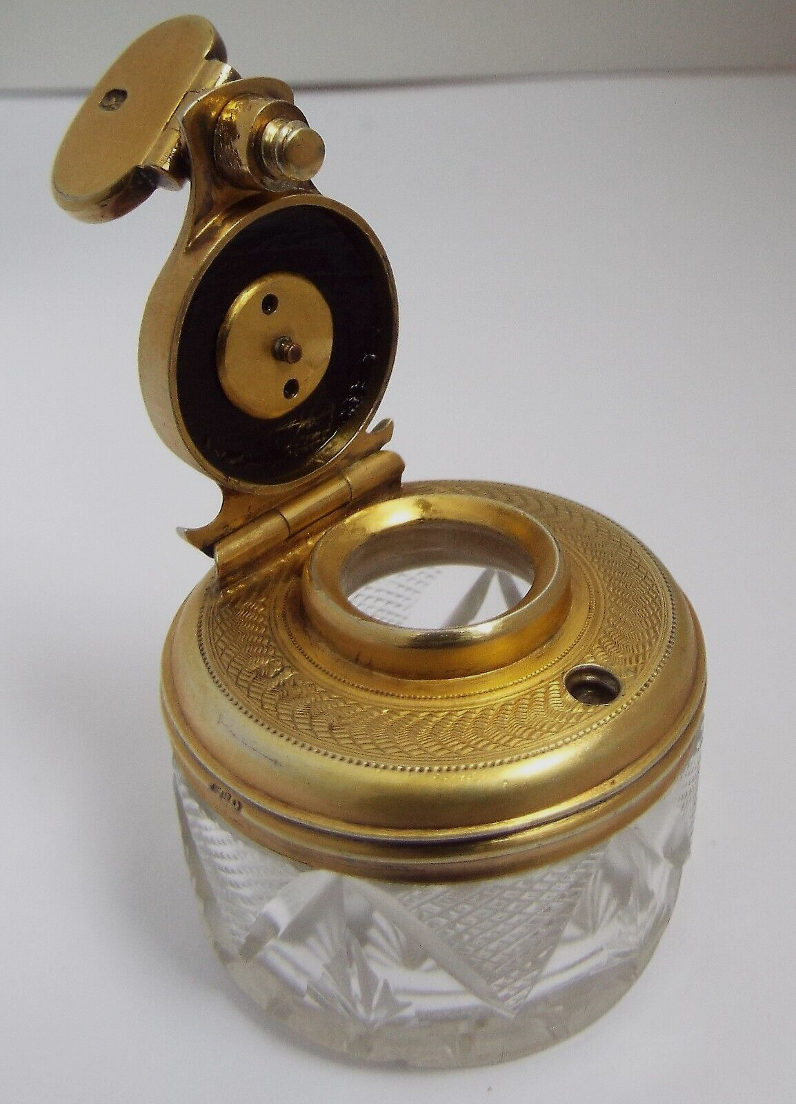 Sterling silver gilt lock-down travel inkwell with a faceted glass inkwell and silver mounted top with original gilded finish. The inkwell has a silver screw-down key and an interior leather seal inside the lid.