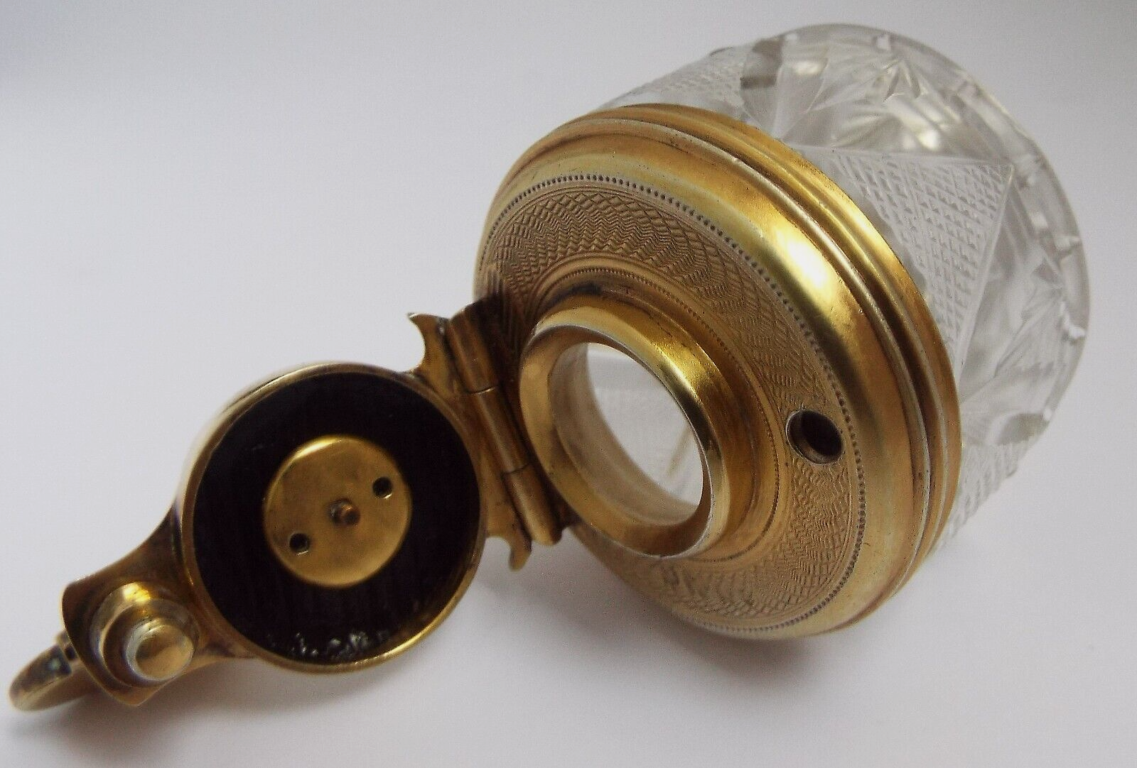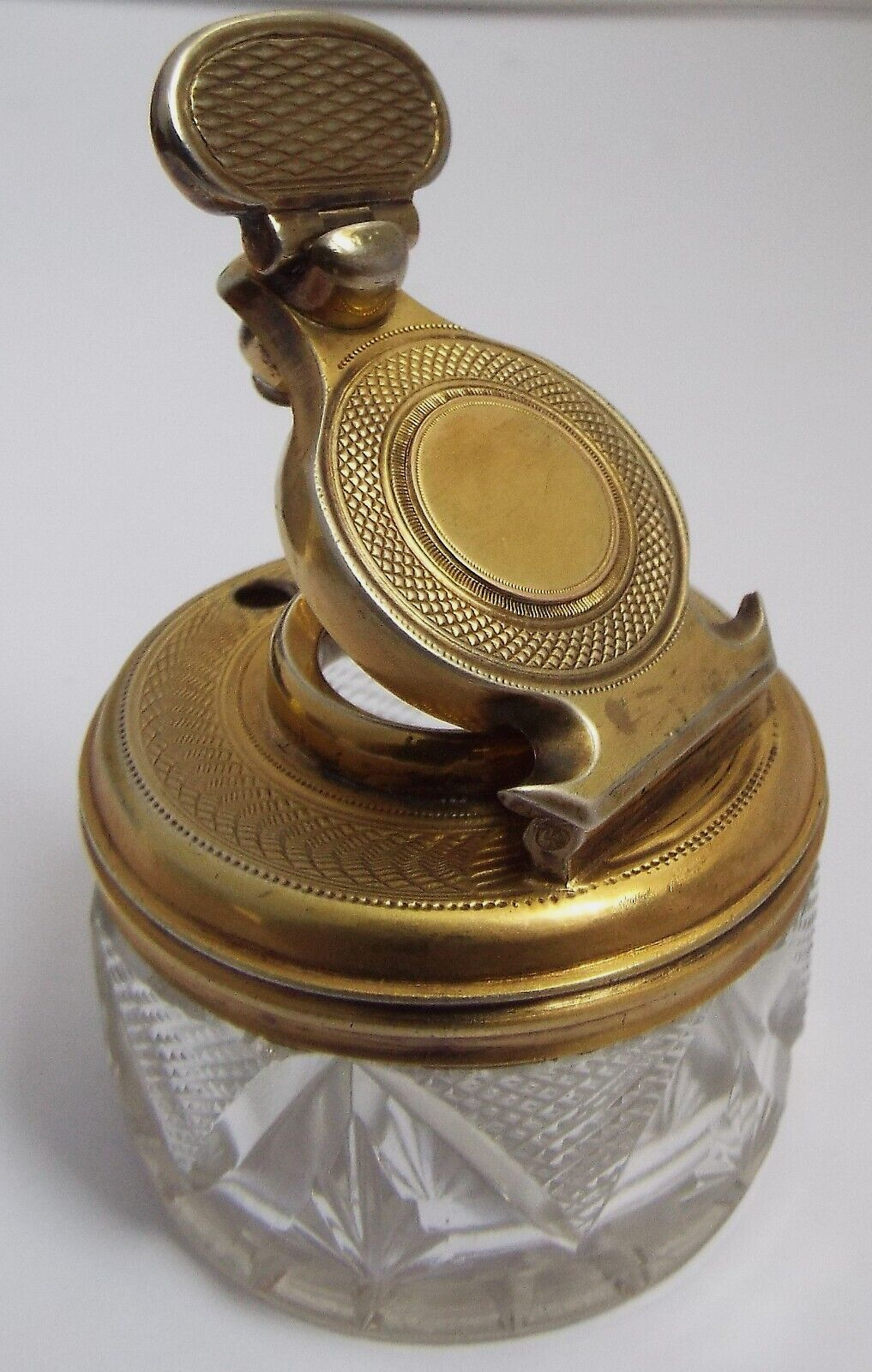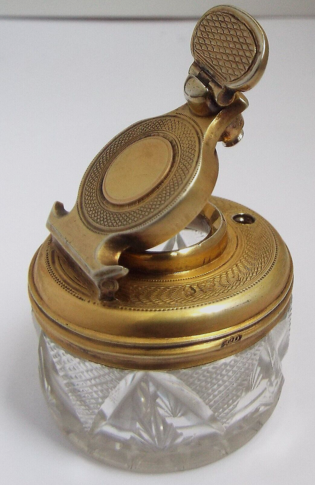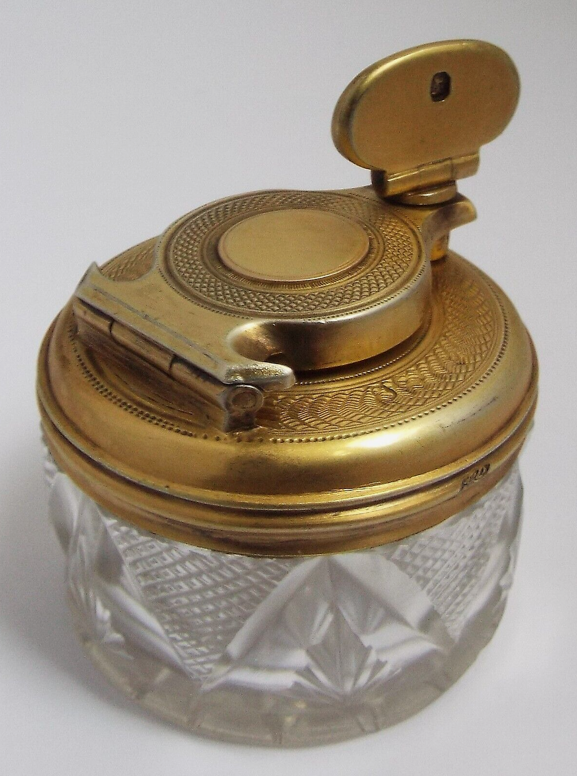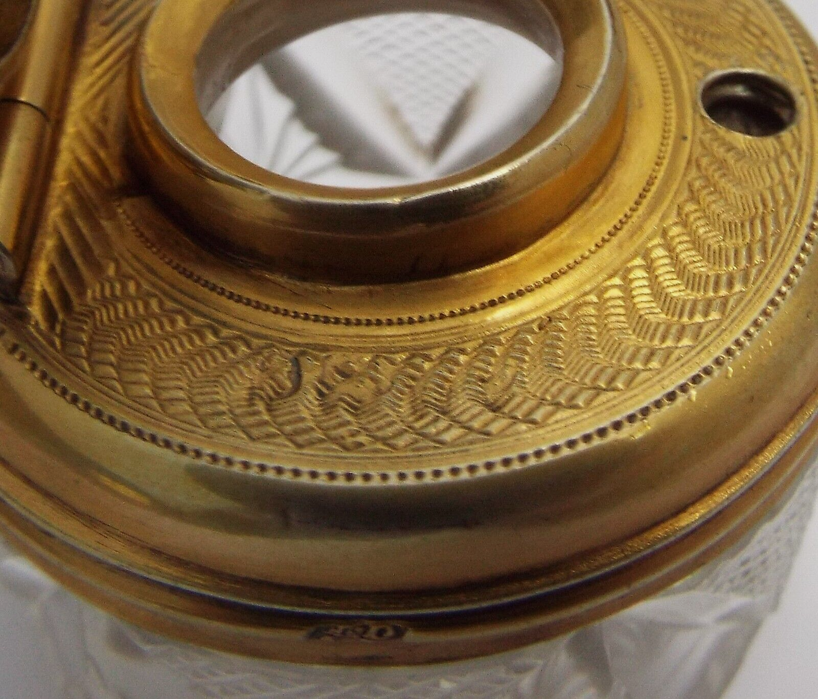 Sterling silver gilt lock-down travel inkwell with a faceted glass inkwell and silver mounted top with original gilded finish. The inkwell has a silver screw-down key and an interior leather seal inside the lid.