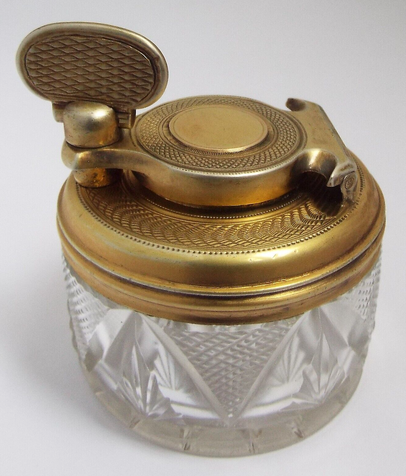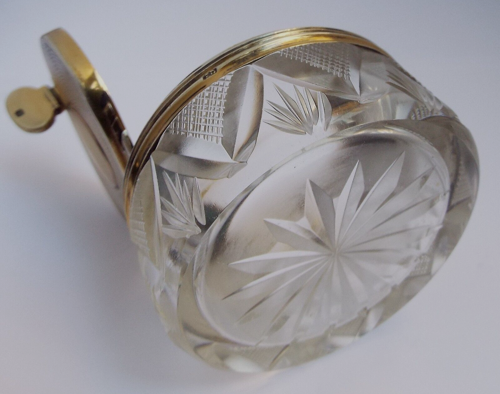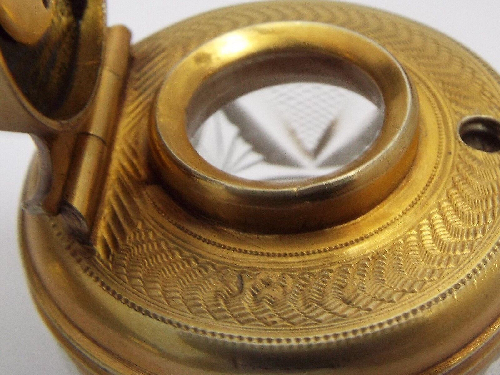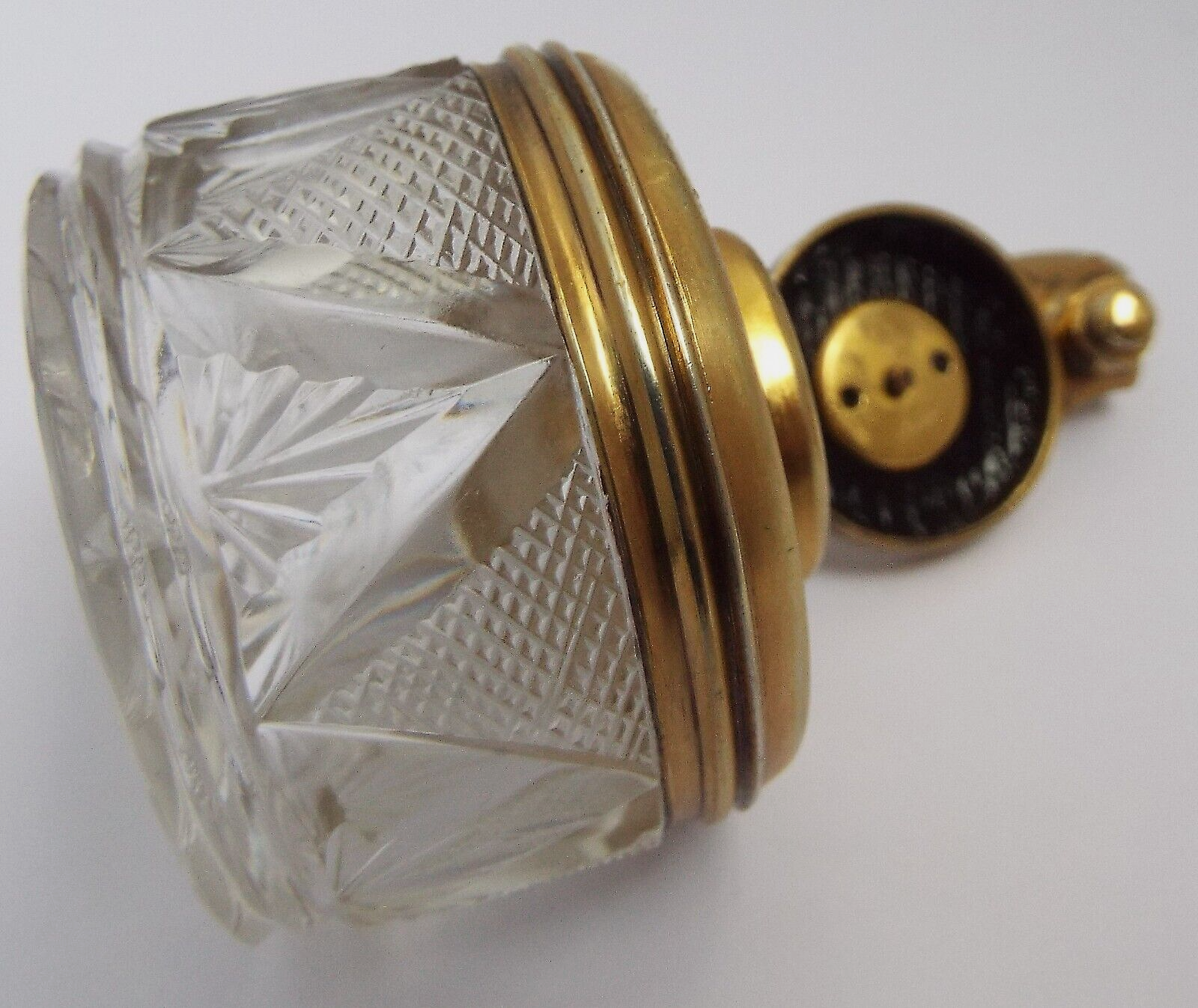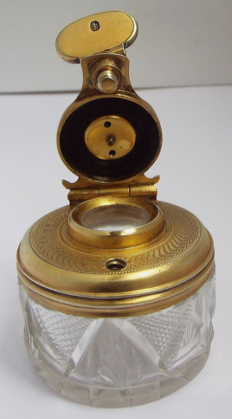 Sterling silver gilt lock-down travel inkwell with a faceted glass inkwell and silver mounted top with original gilded finish. The inkwell has a silver screw-down key and an interior leather seal inside the lid.