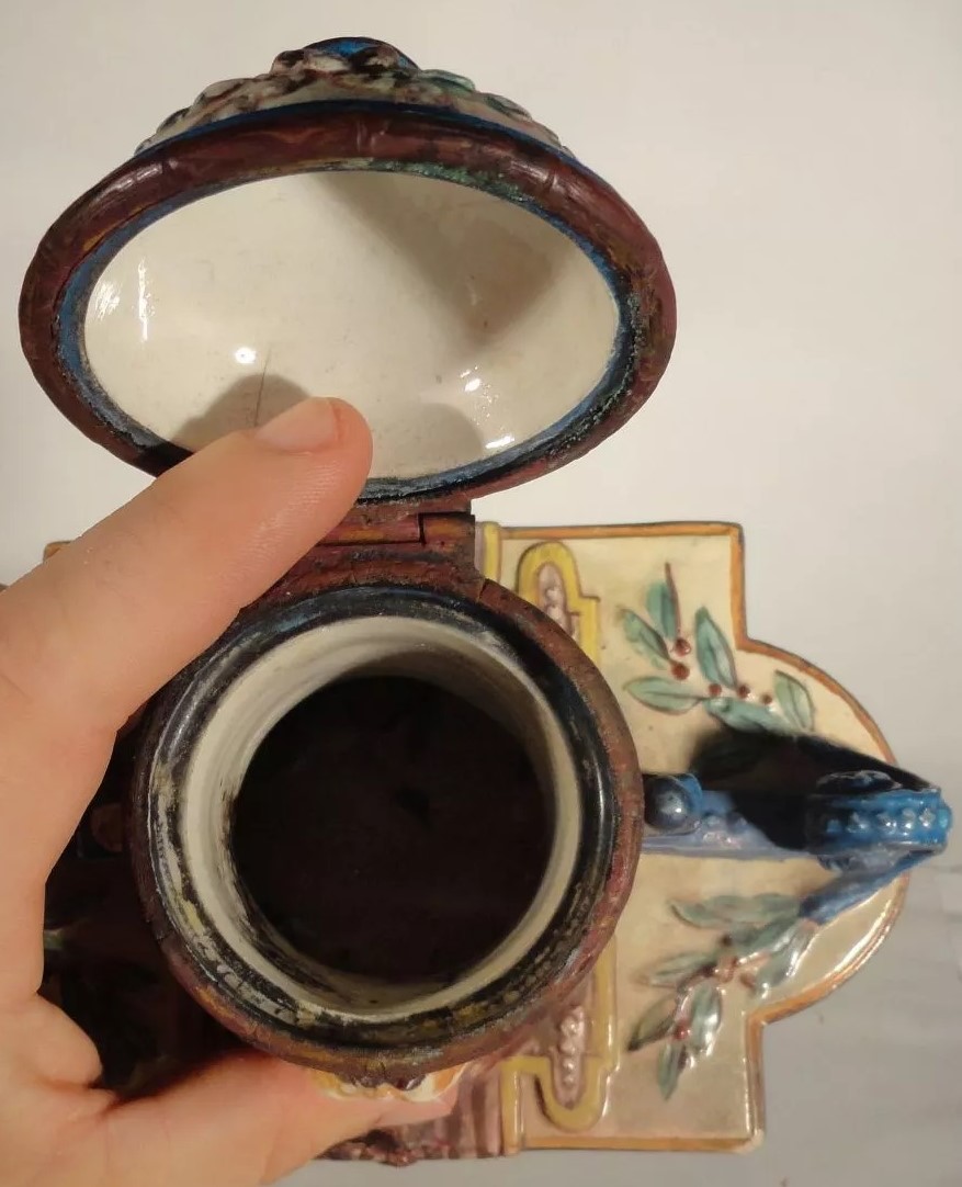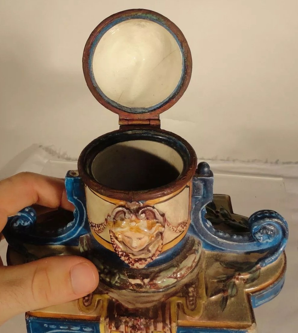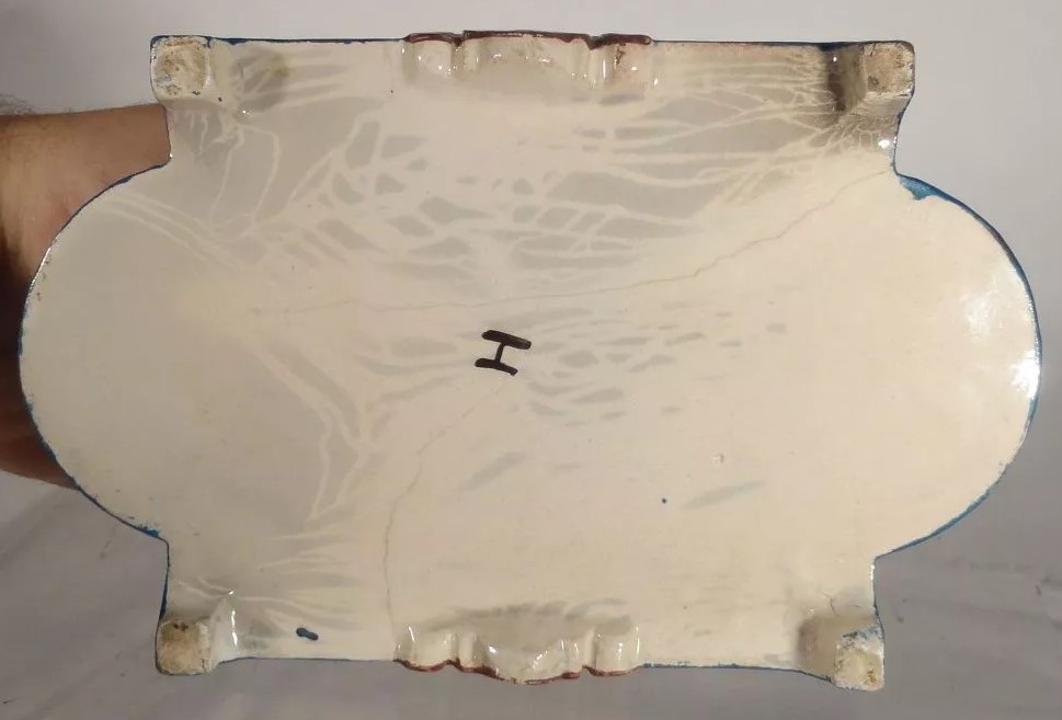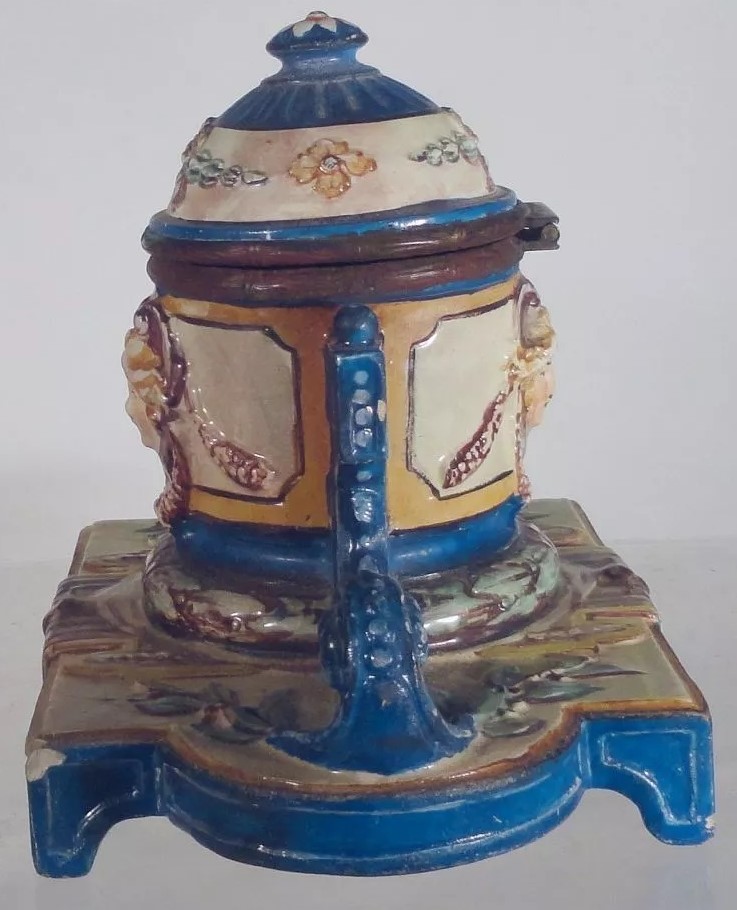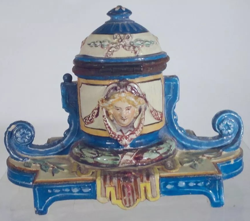 This majolica inkstand is a nice example of tin-glazed pottery. Its vibrant polychrome color palette features shades of blue, accented with yellow and brown. The central inkwell decorated with a cherub face is capped with a lift-off lid with a decorative finial. Elaborate scroll-like structures and floral garlands complete the piece. The underside is marked with the letter “H”.
