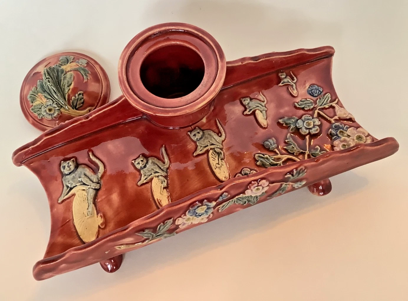 - Decoration: The piece is decorated in high relief with cats pedaling unicycles across a plain background. The front and sides are embellished with wild roses or anemones and green foliage.