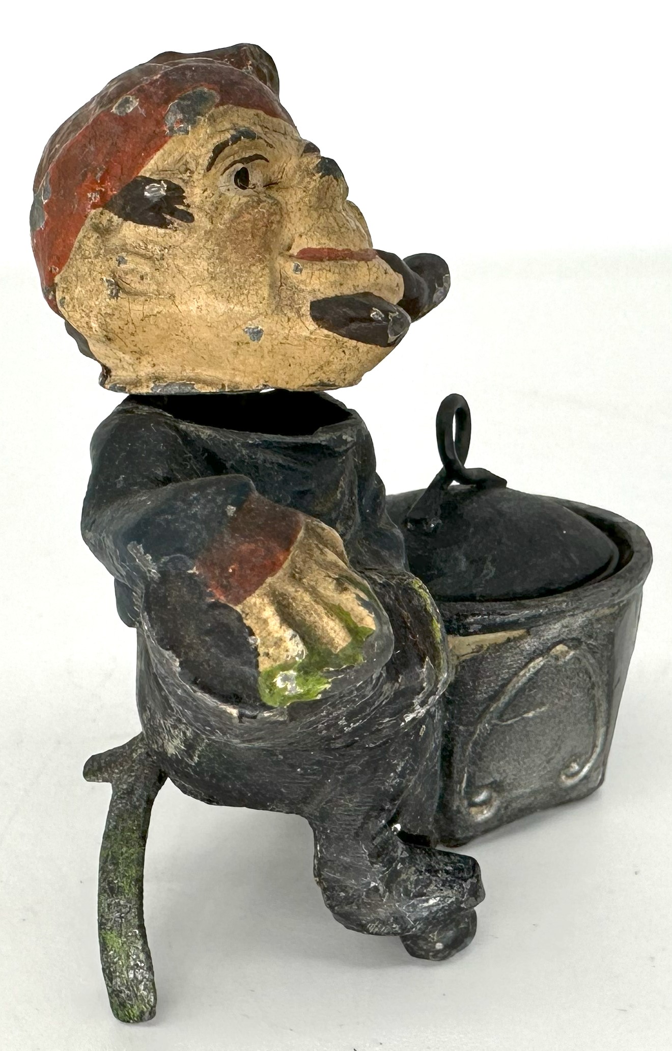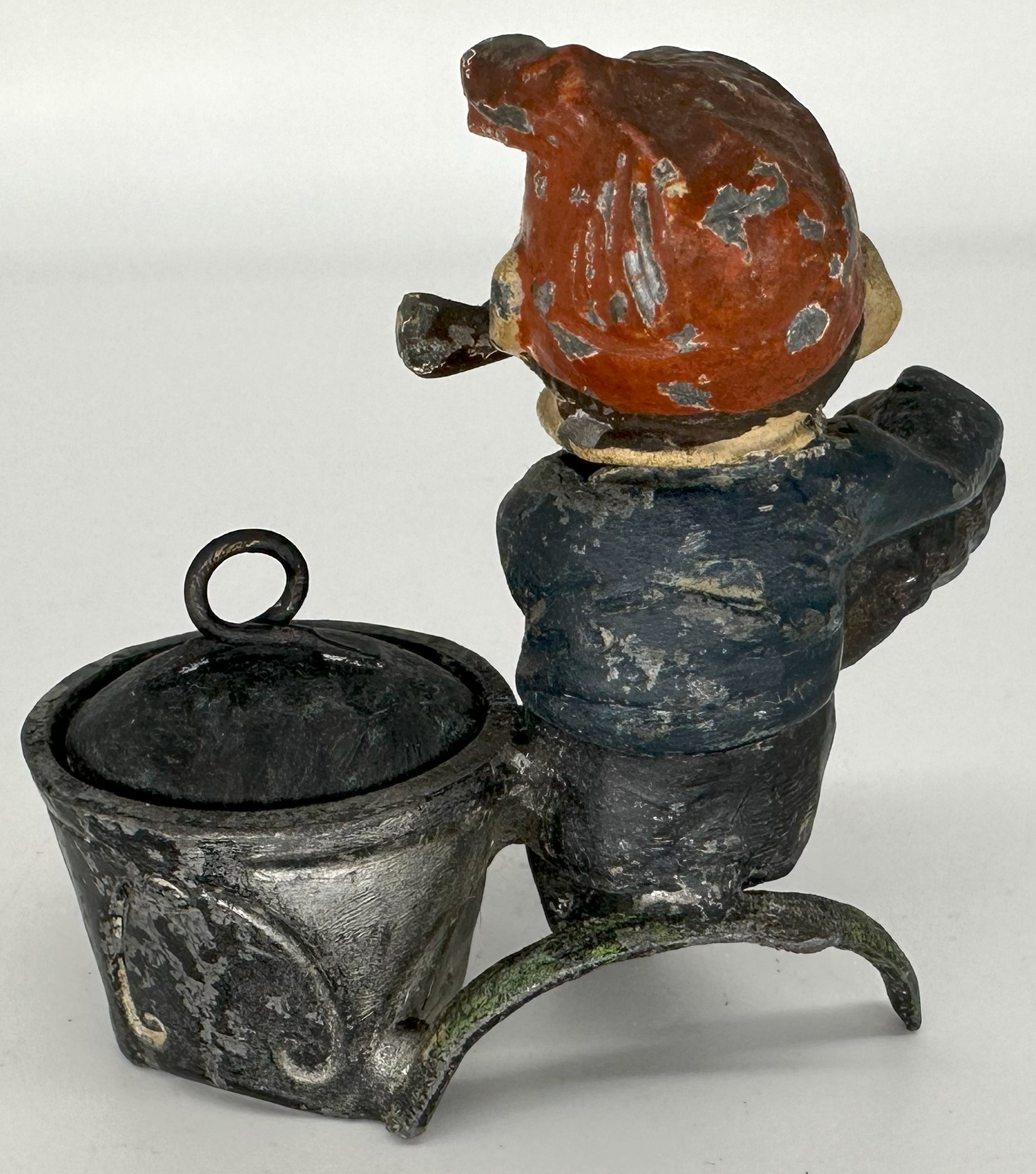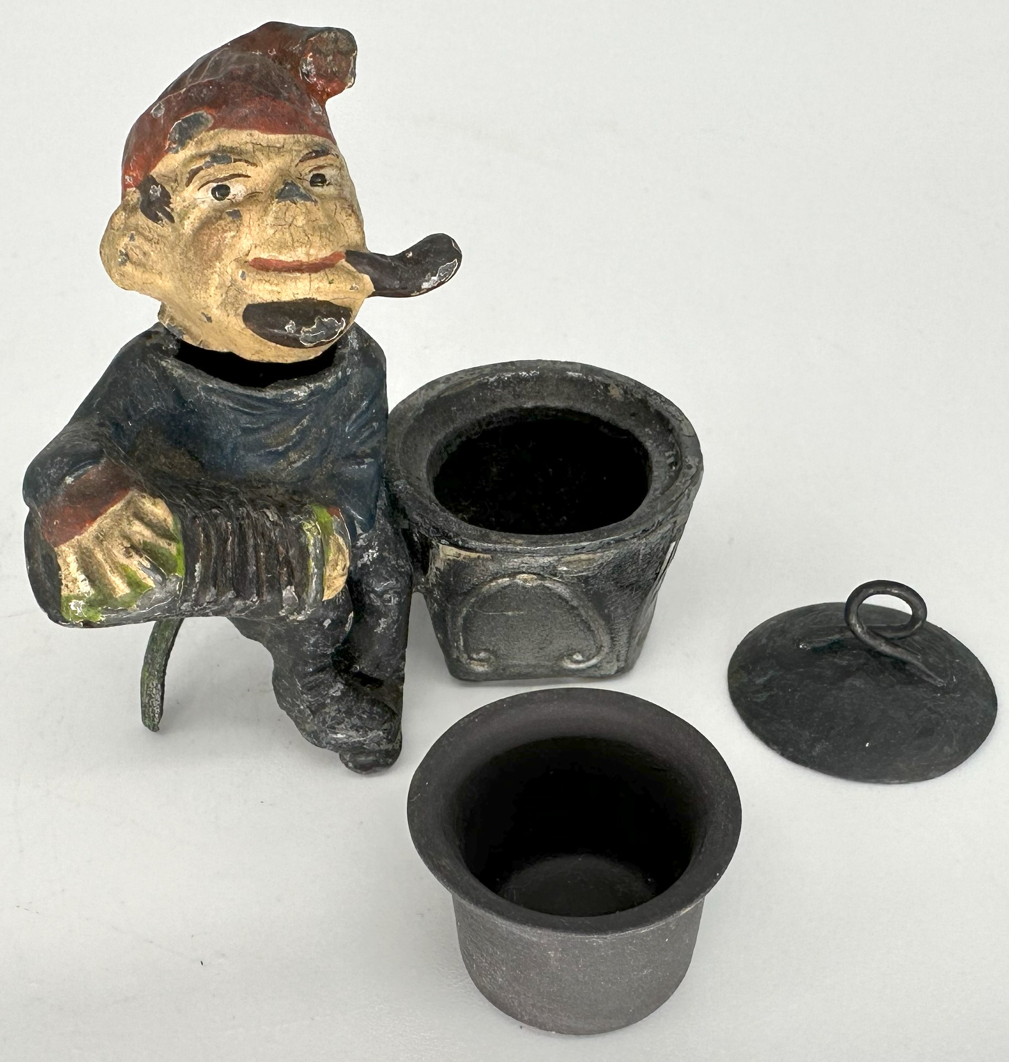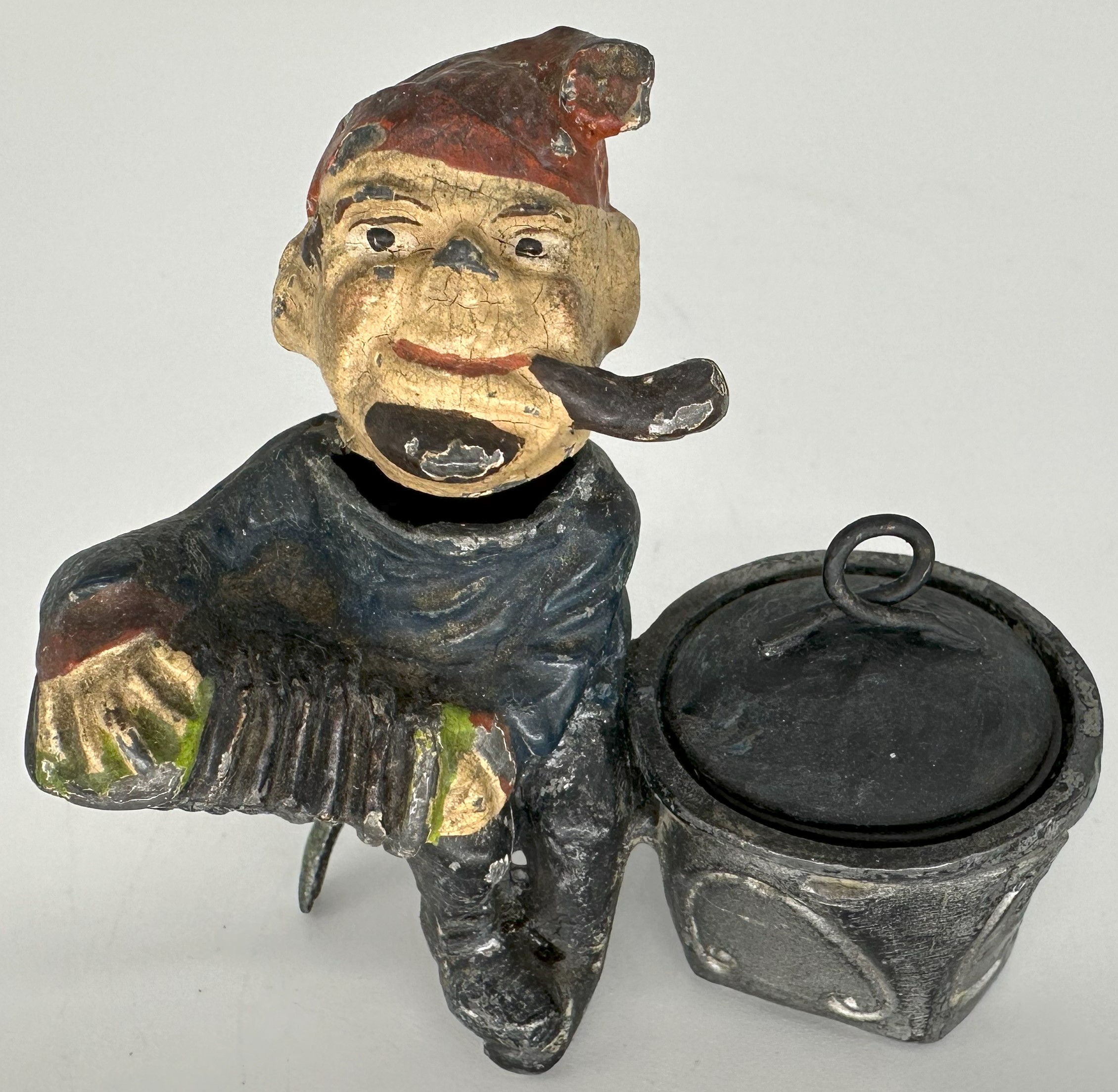 A cold painted spelter metal elf or little man smoking a pipe sits and plays an accordion. He is a “nodder” with a bobbing head.