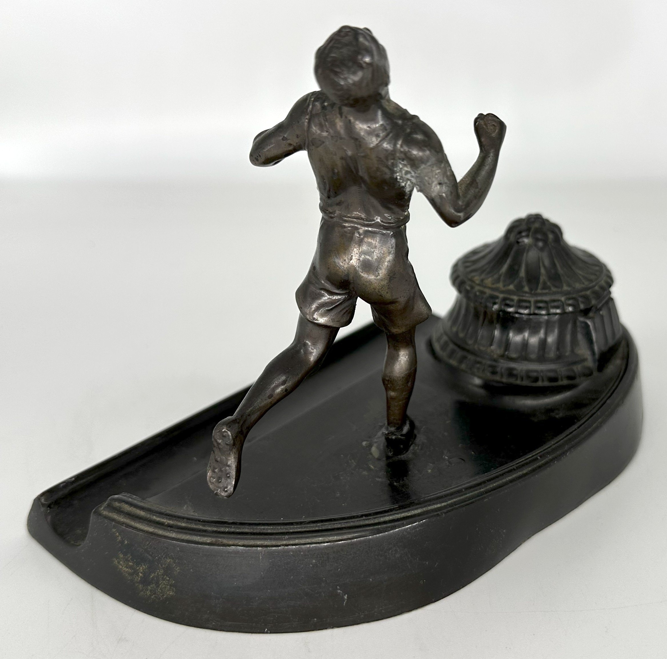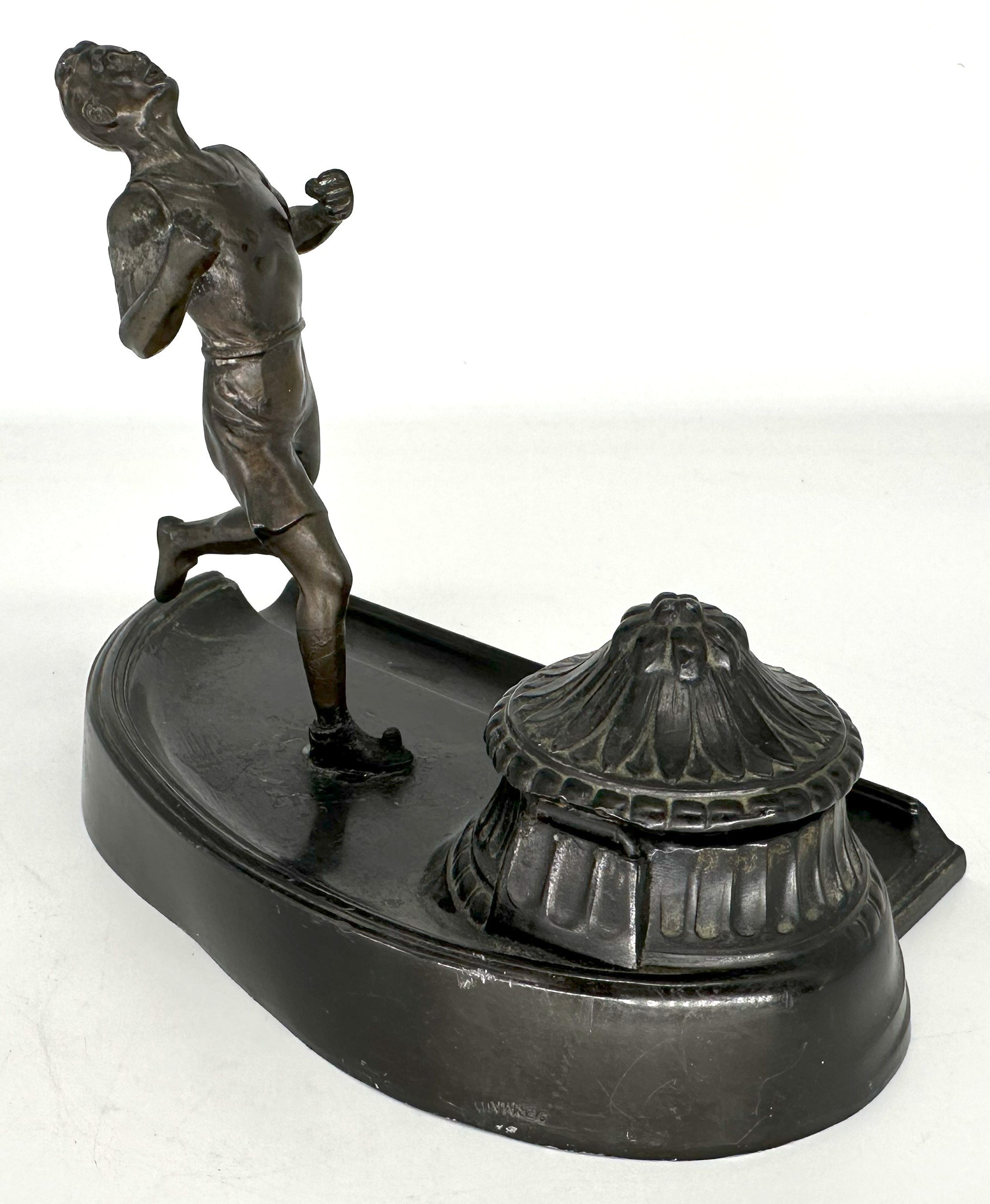 This inkstand features a sculpture of a running man, crafted in a bronze-like material, frozen mid-stride with his arms bent and his head slightly tilted back. He wears a sleeveless top and shorts and looks as if he’s in the final spurt in a race. The inkwell is in the hinged container on the left. This container has a domed structure with ornate vertical grooves and a floral motif.