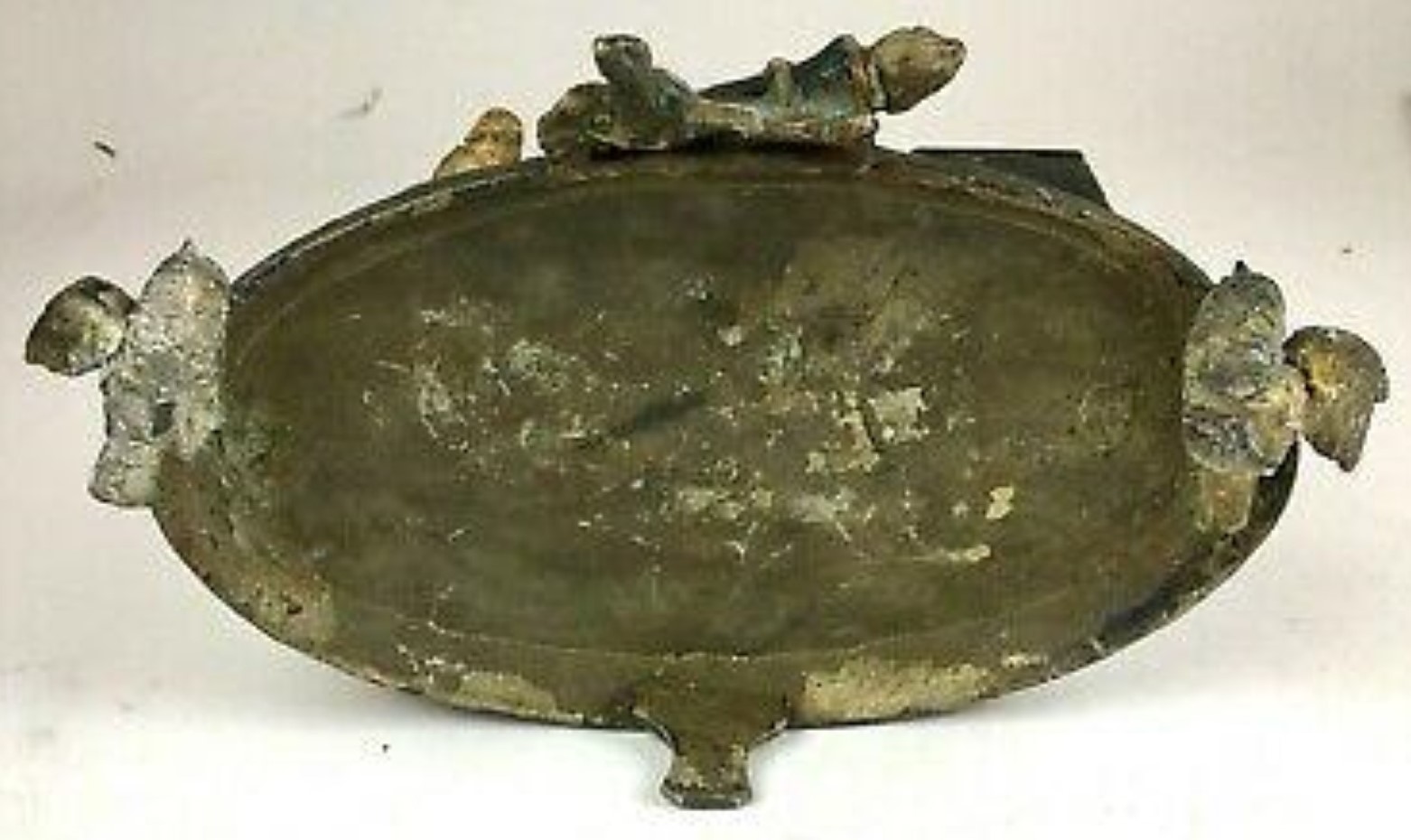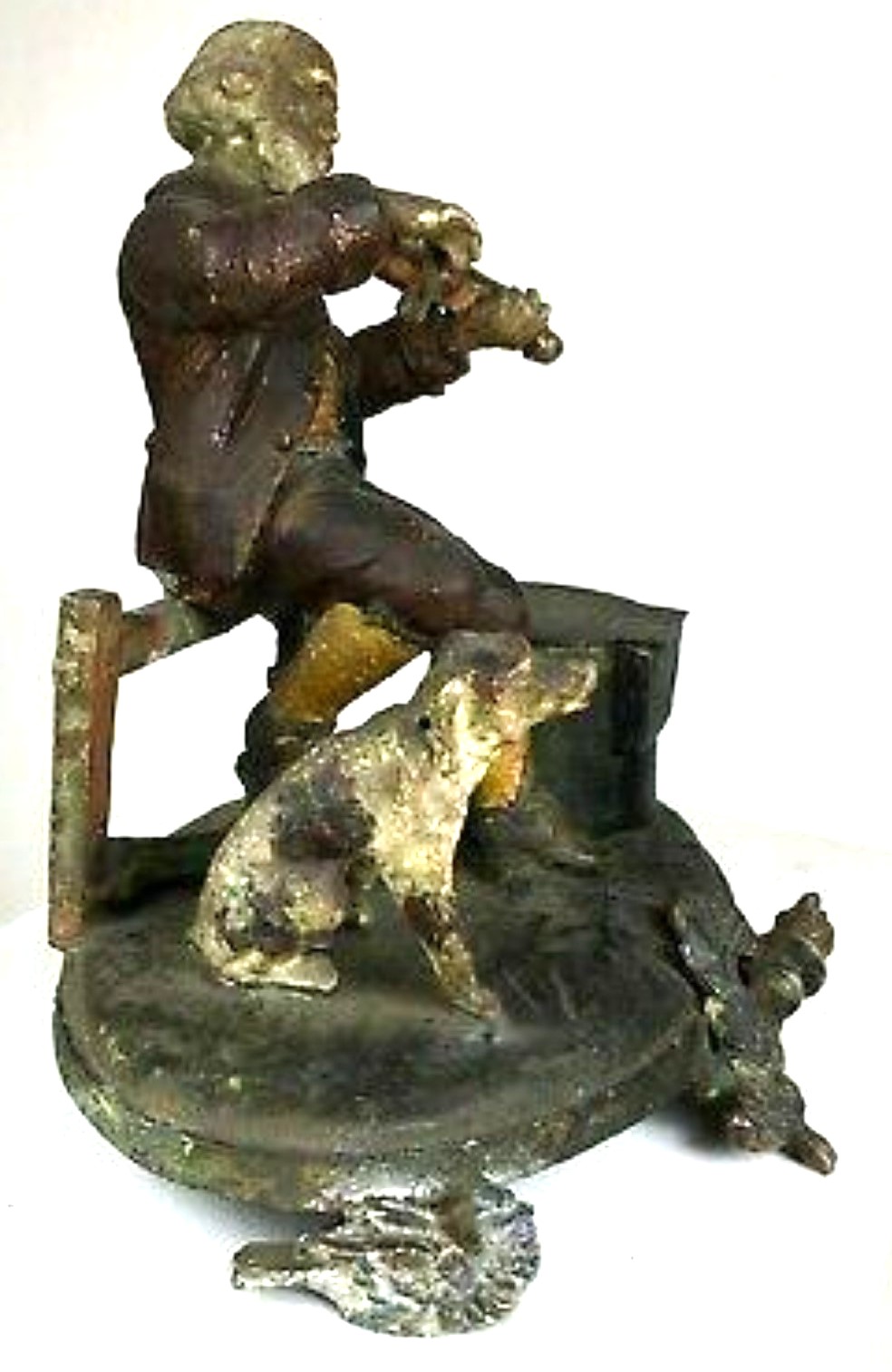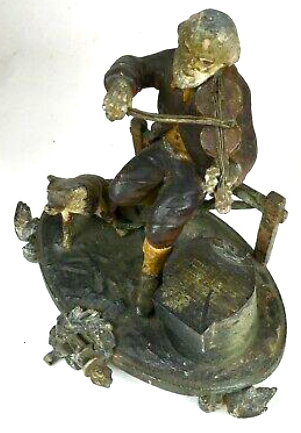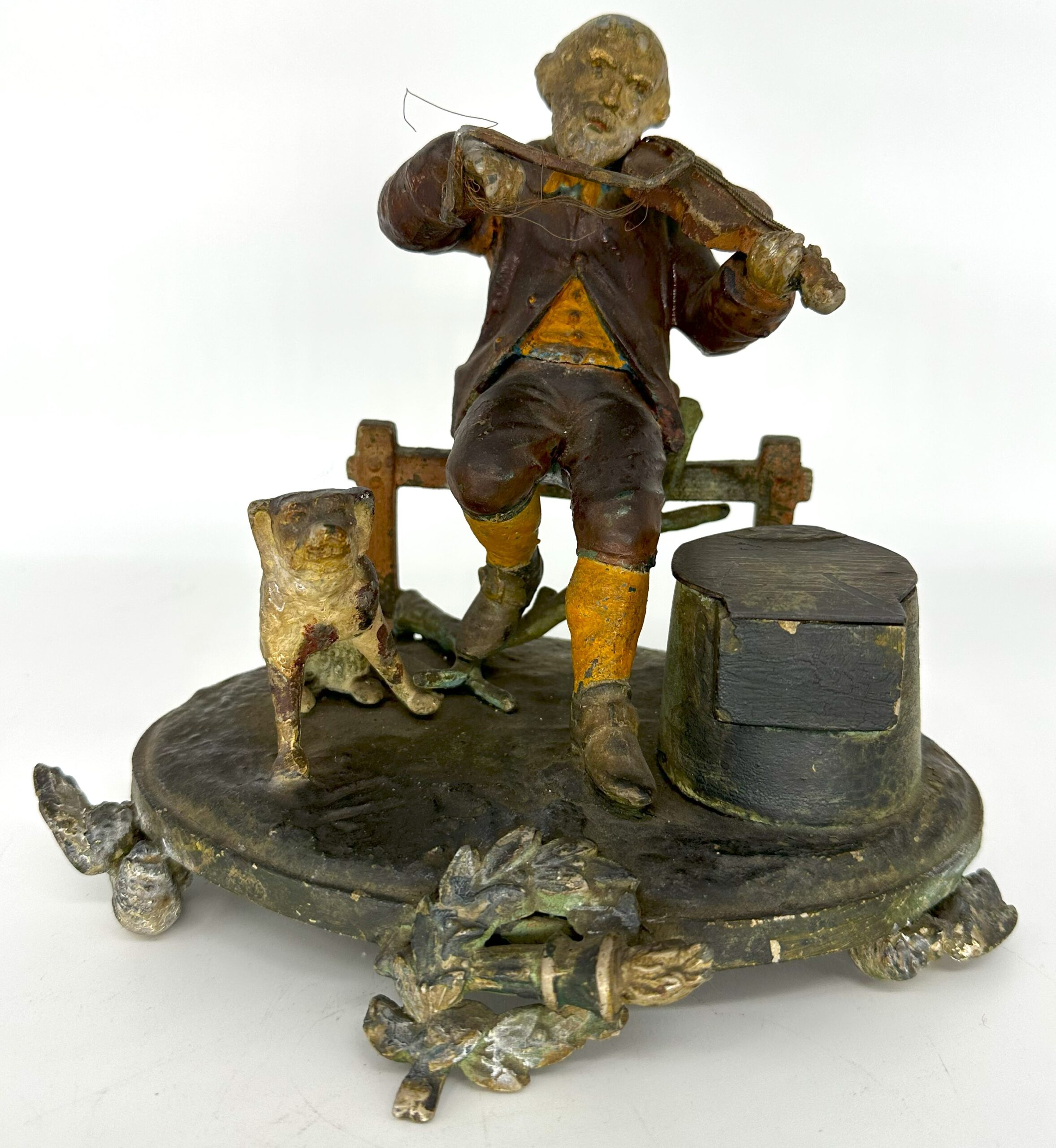 This inkstand depicts a man sitting on a fence, playing his violin, while his dog sits nearby. Made of white metal and hand painted, the feet for the base are birds with spread wings, and a center wreath surrounding a torch.