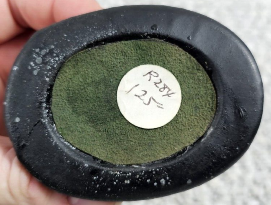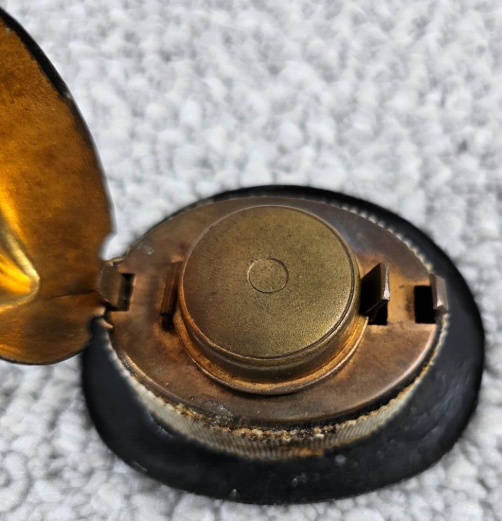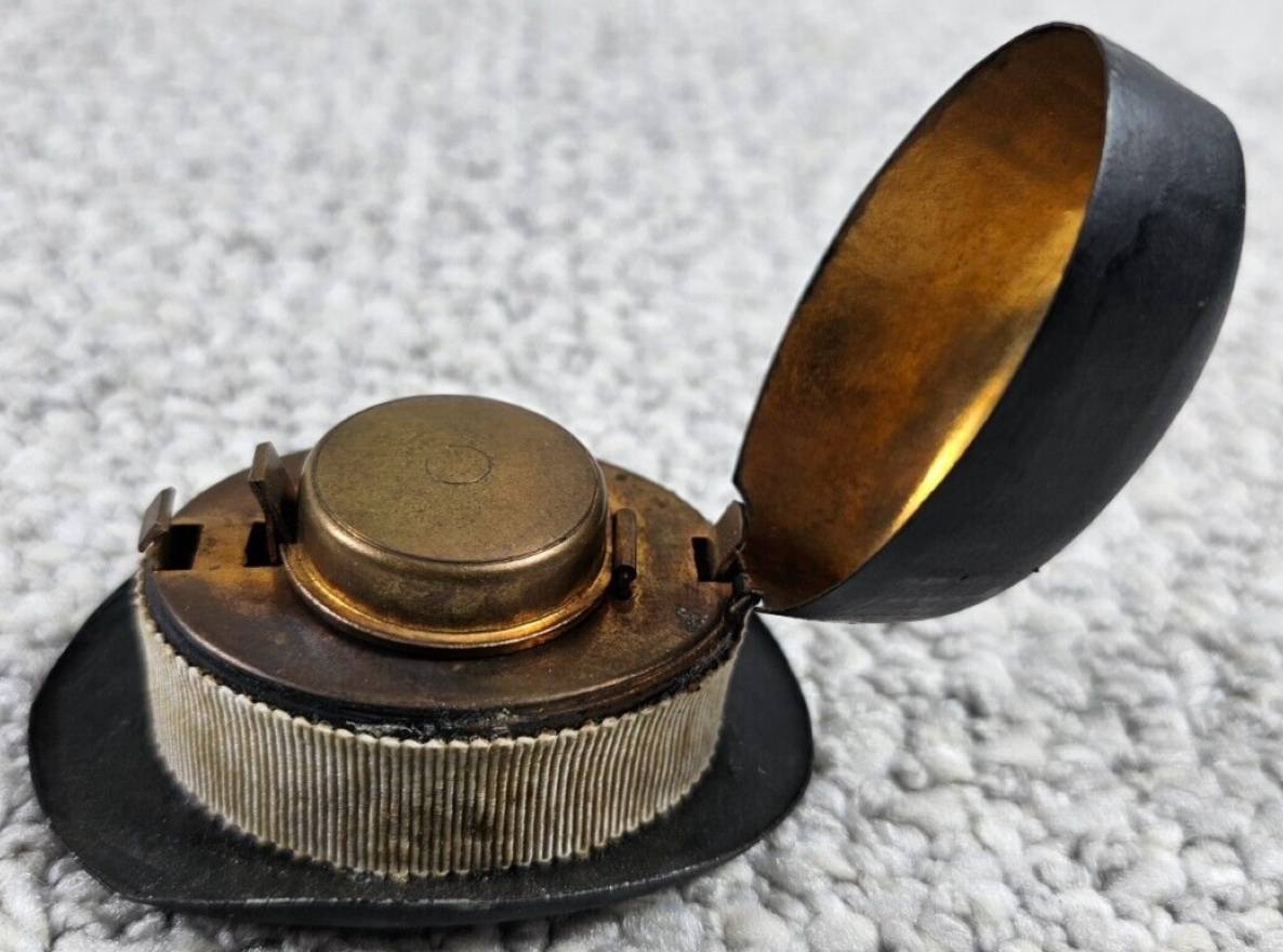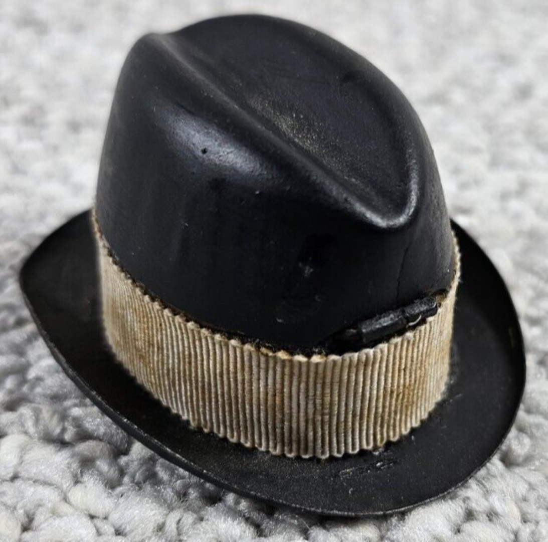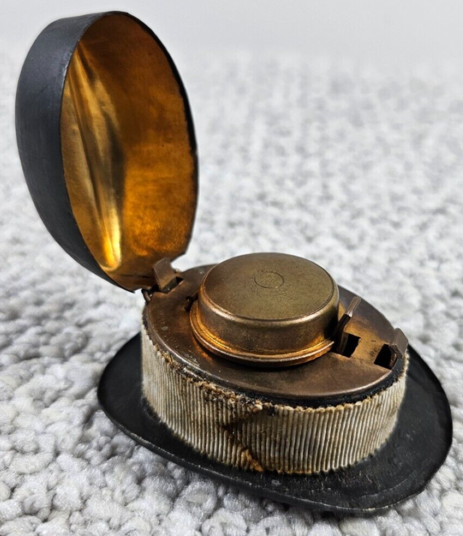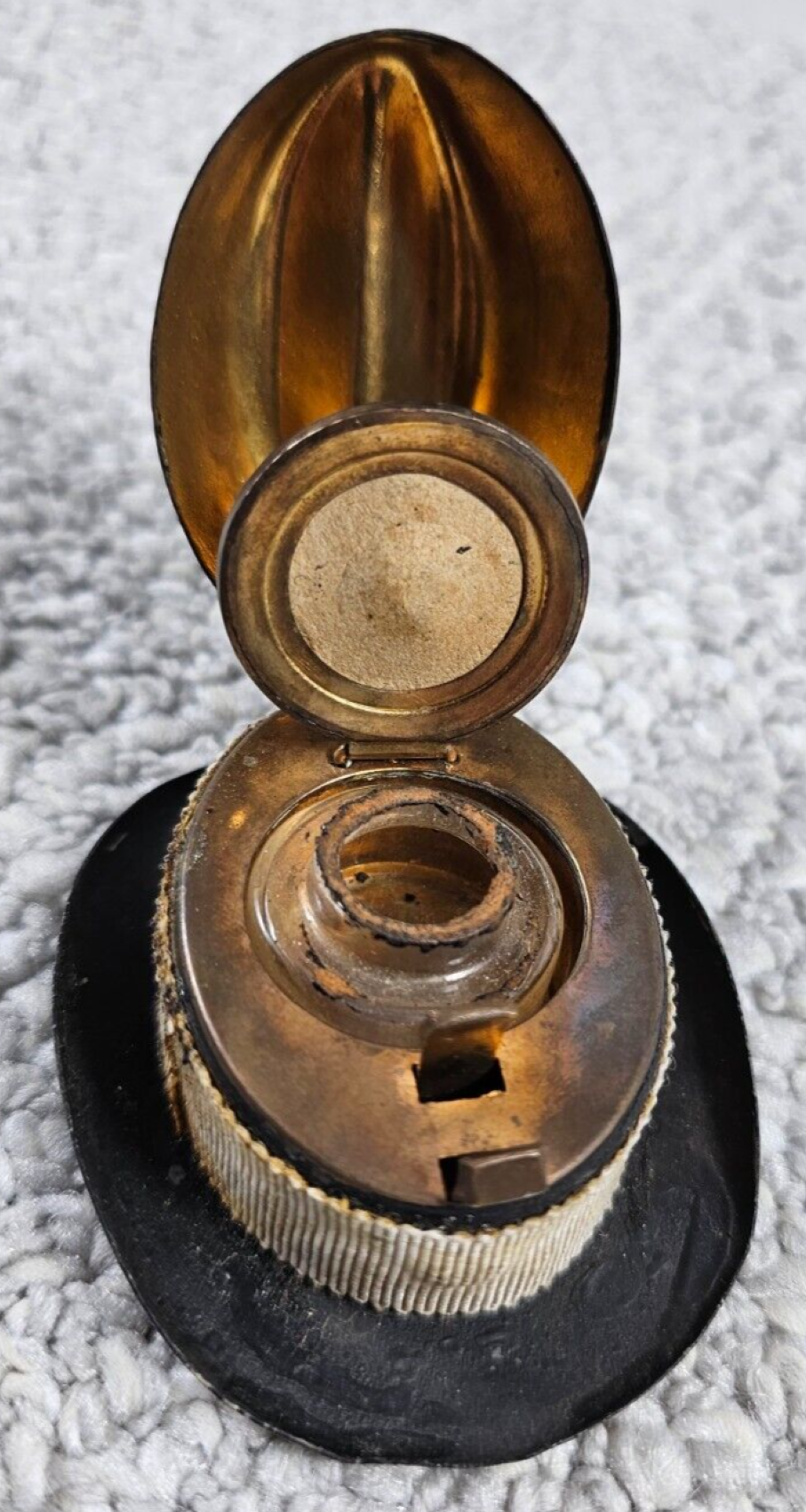 Victorian traveling inkwell in the form of a hat (Fedora). It is covered with leather and has a cloth hat band. A concealed button releases the hinged lid. A 2nd lid inside flips open when the lever is moved. The lid has a leather stopper to seal the glass ink bottle when in transit. The crease in the hat serves as a pen holder.
