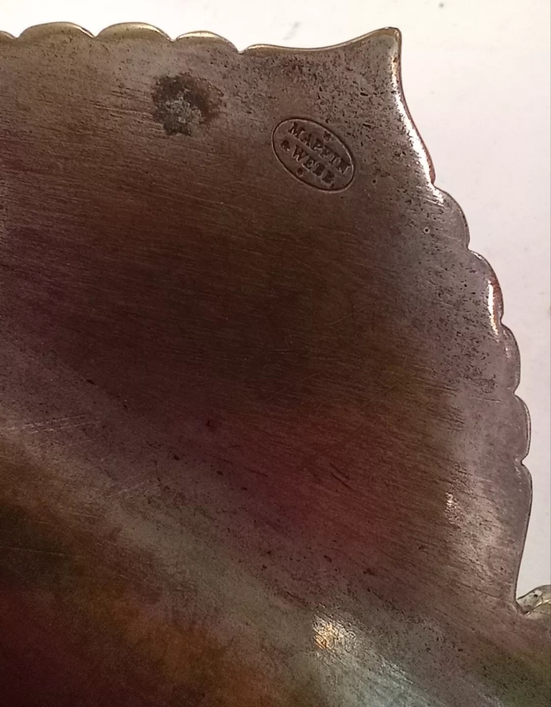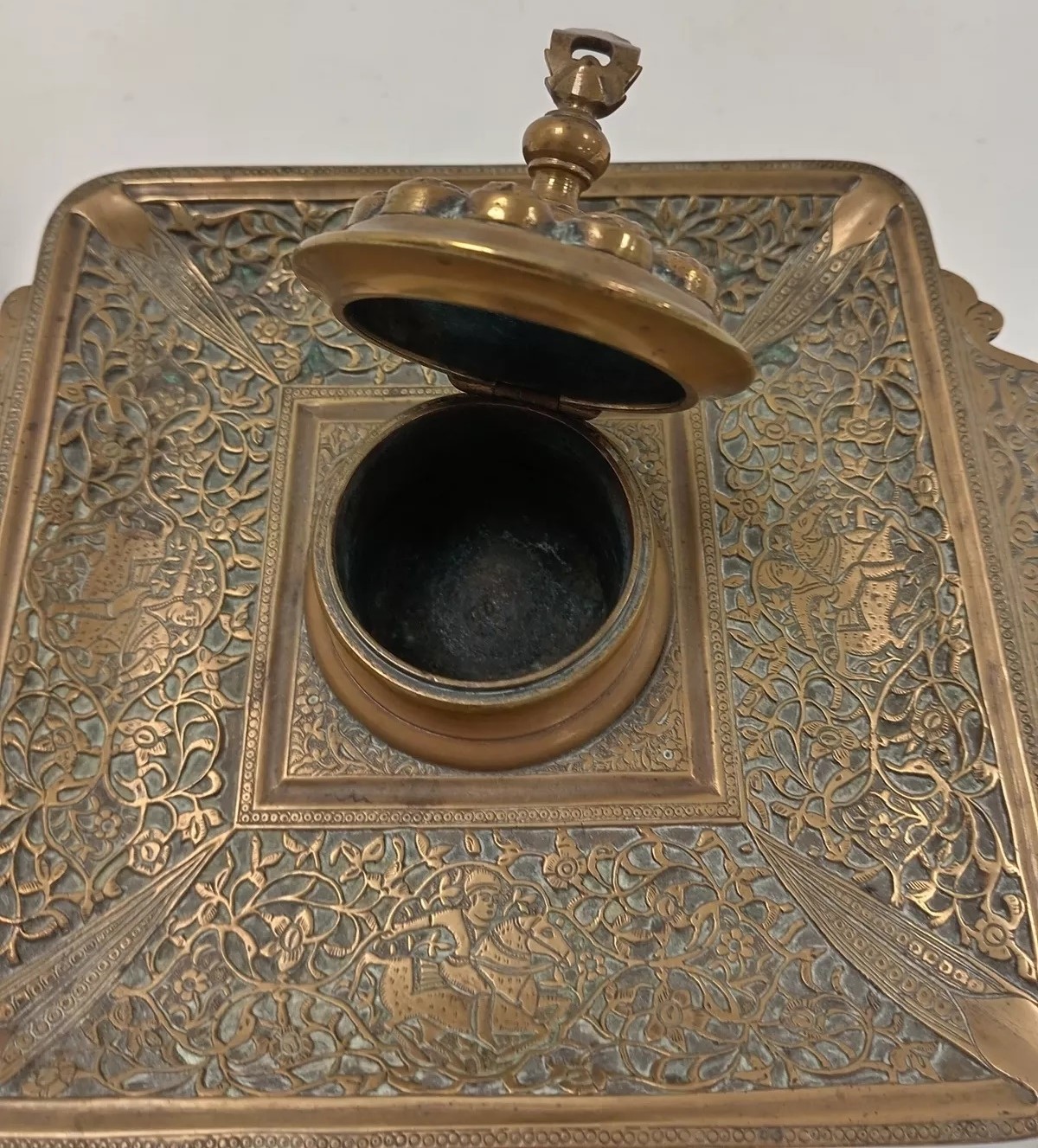 This brass inkstand marked “Mappin & Webb” has a square base with rounded corners. The intricate filigree work on the base features elaborate patterns that seem to incorporate Oriental motifs, including horsemen.