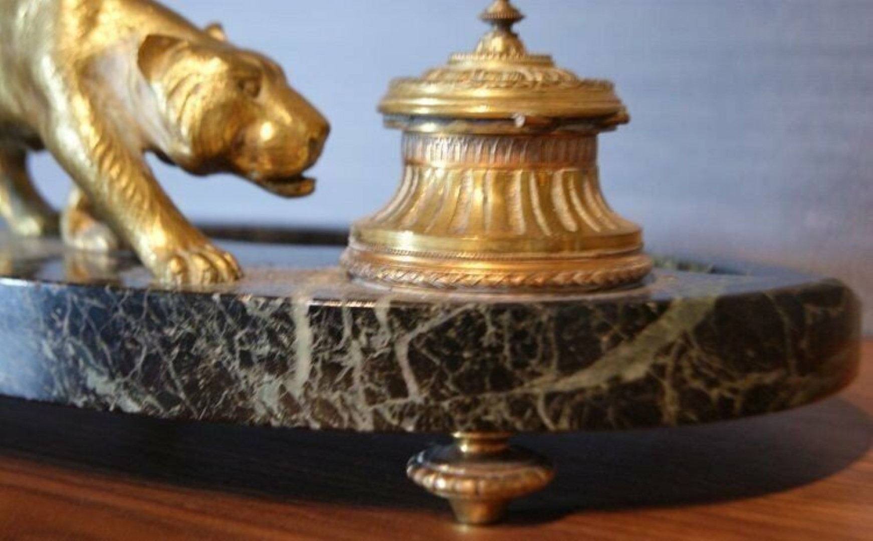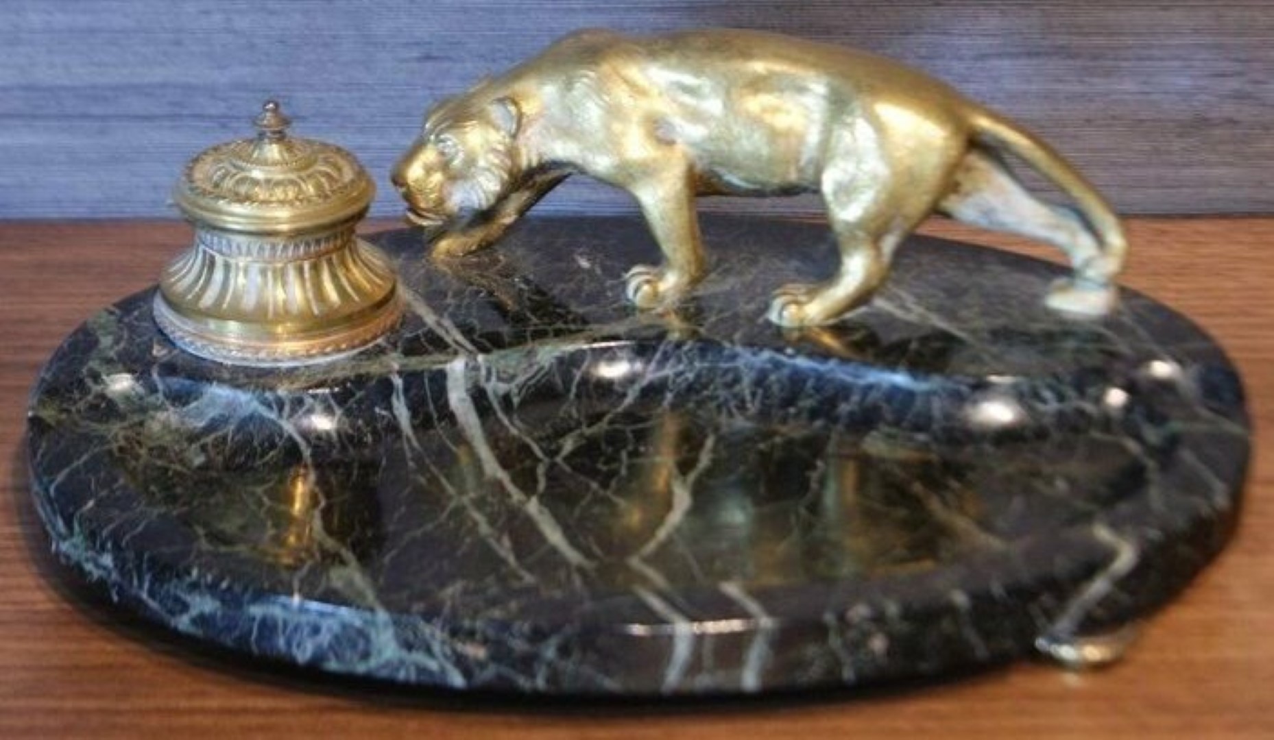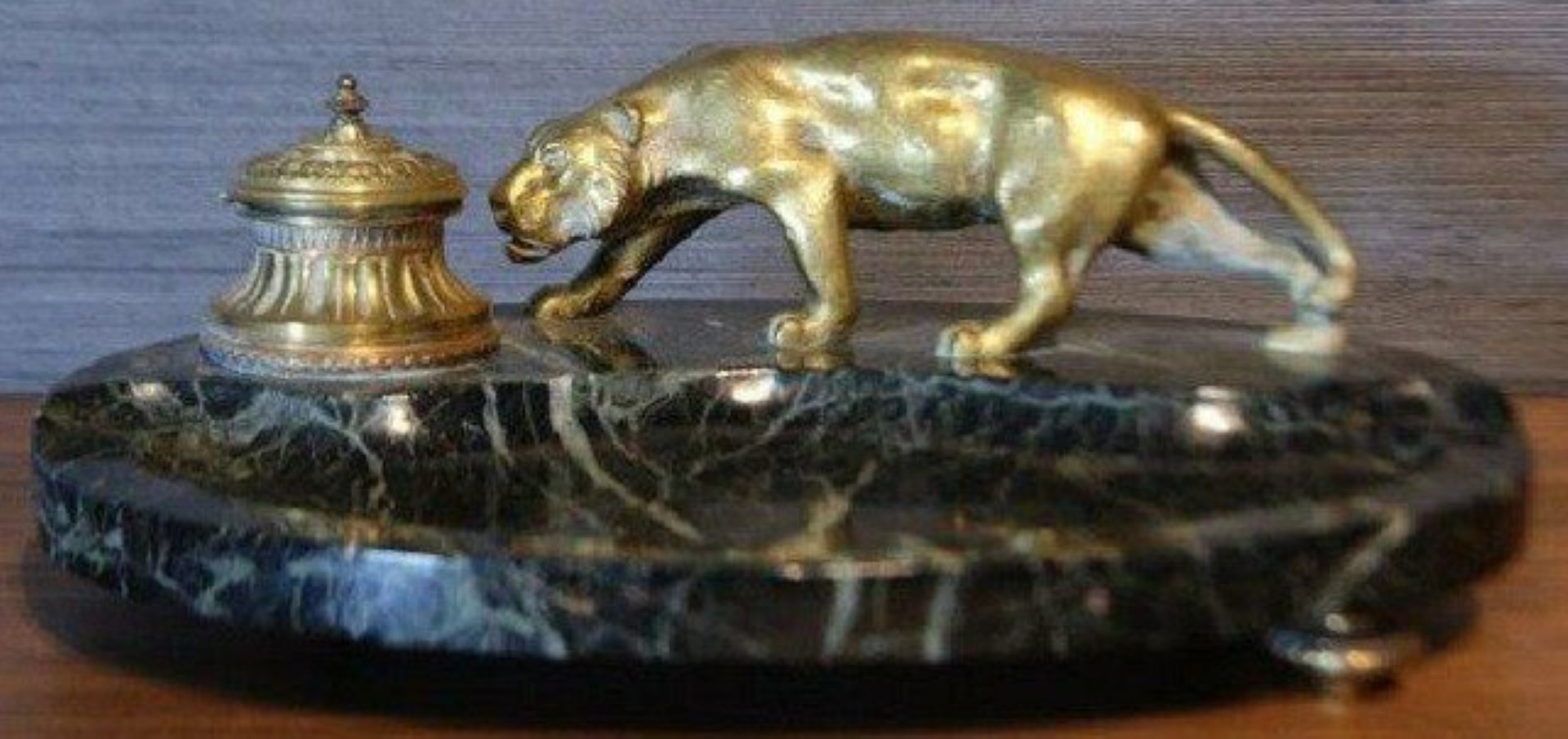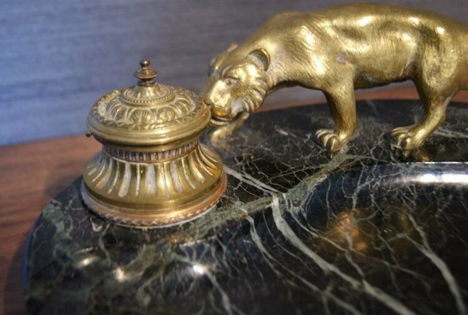 A bronze panther prowls atop a dark green marble inkstand.