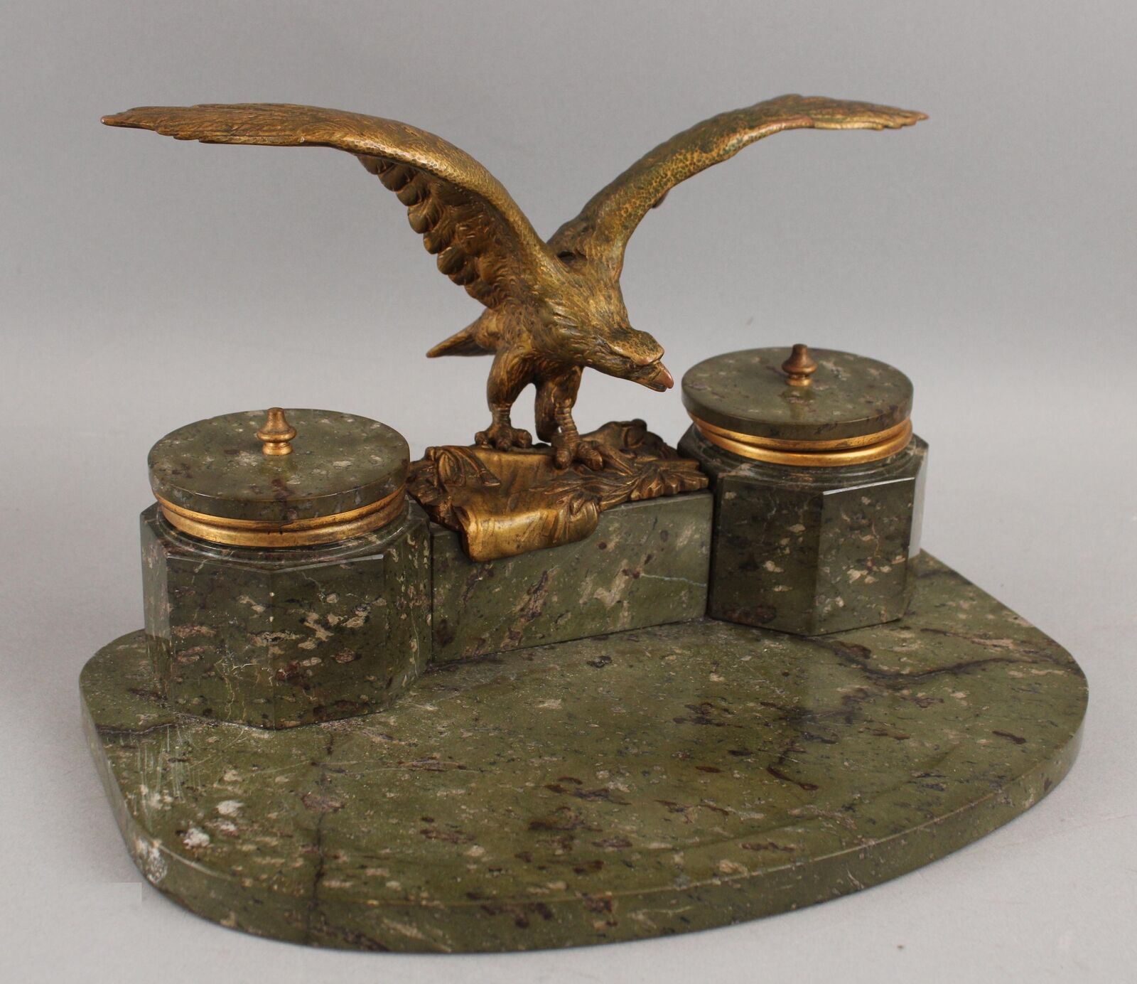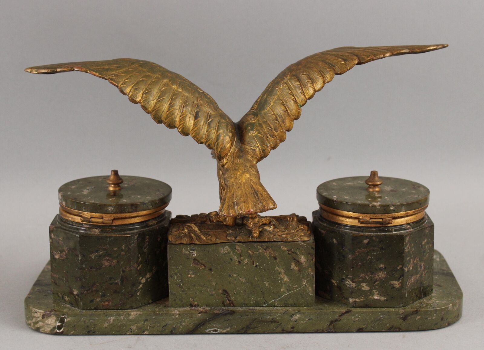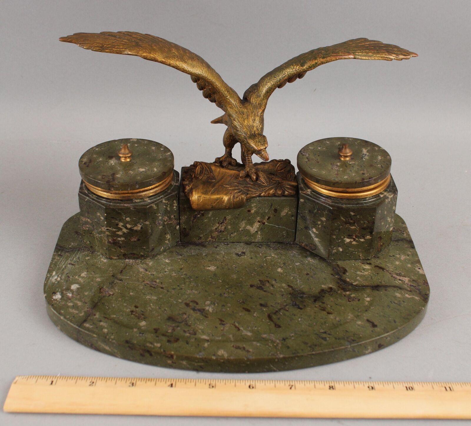 Marble inkstand with a gold gilt bronze eagle, wings spread, perched protecting a flag. On either side of the eagle are receptacles for inkwells with hinged lids. One glass insert is missing.