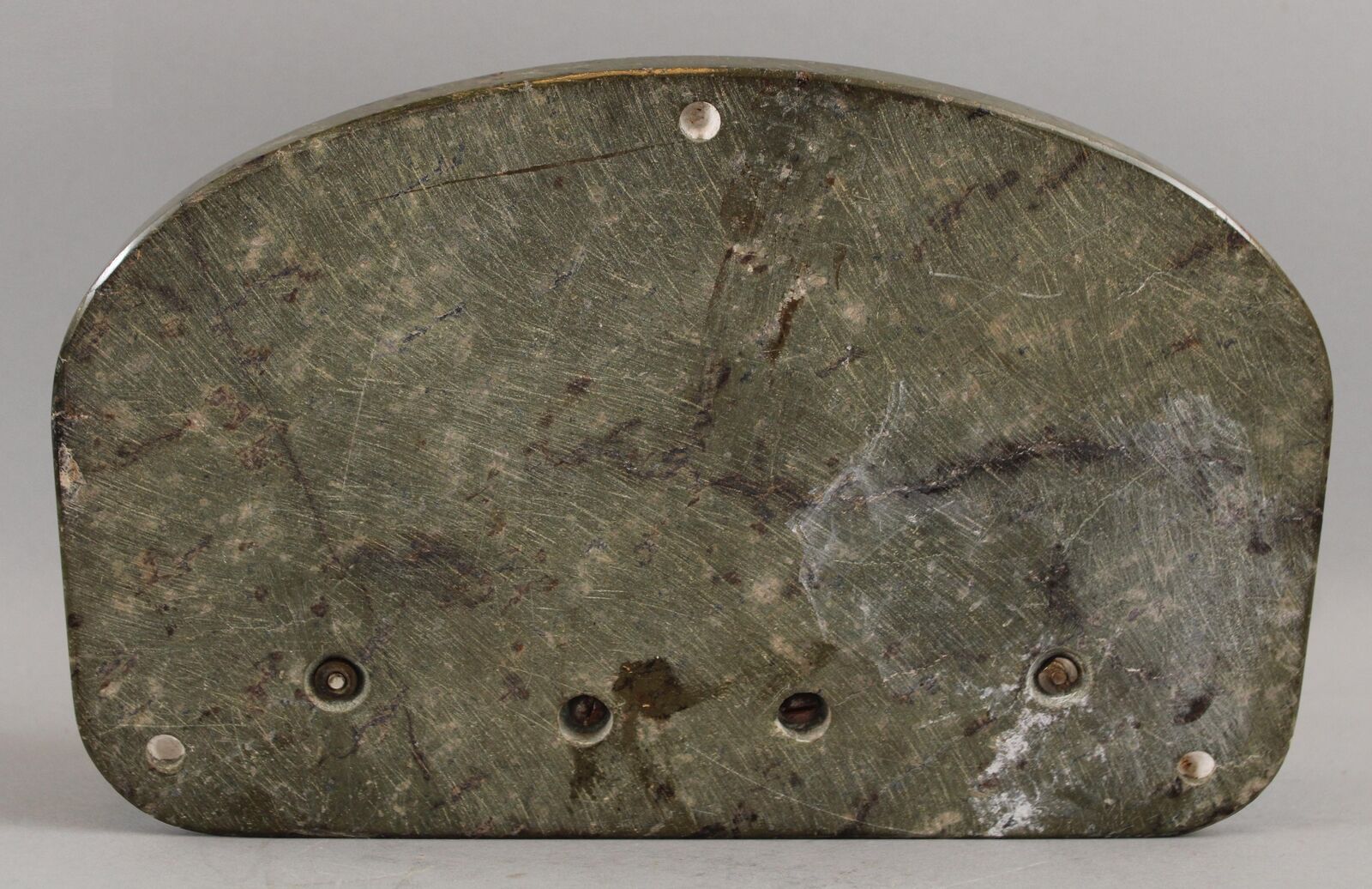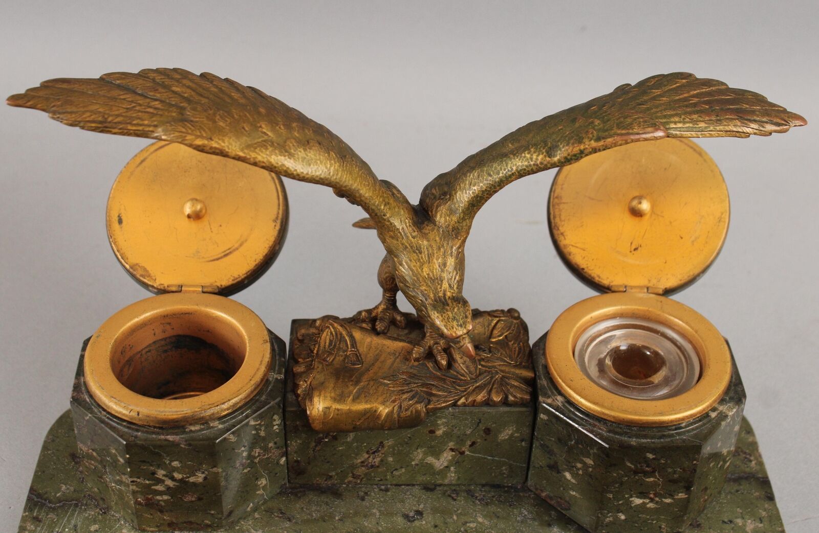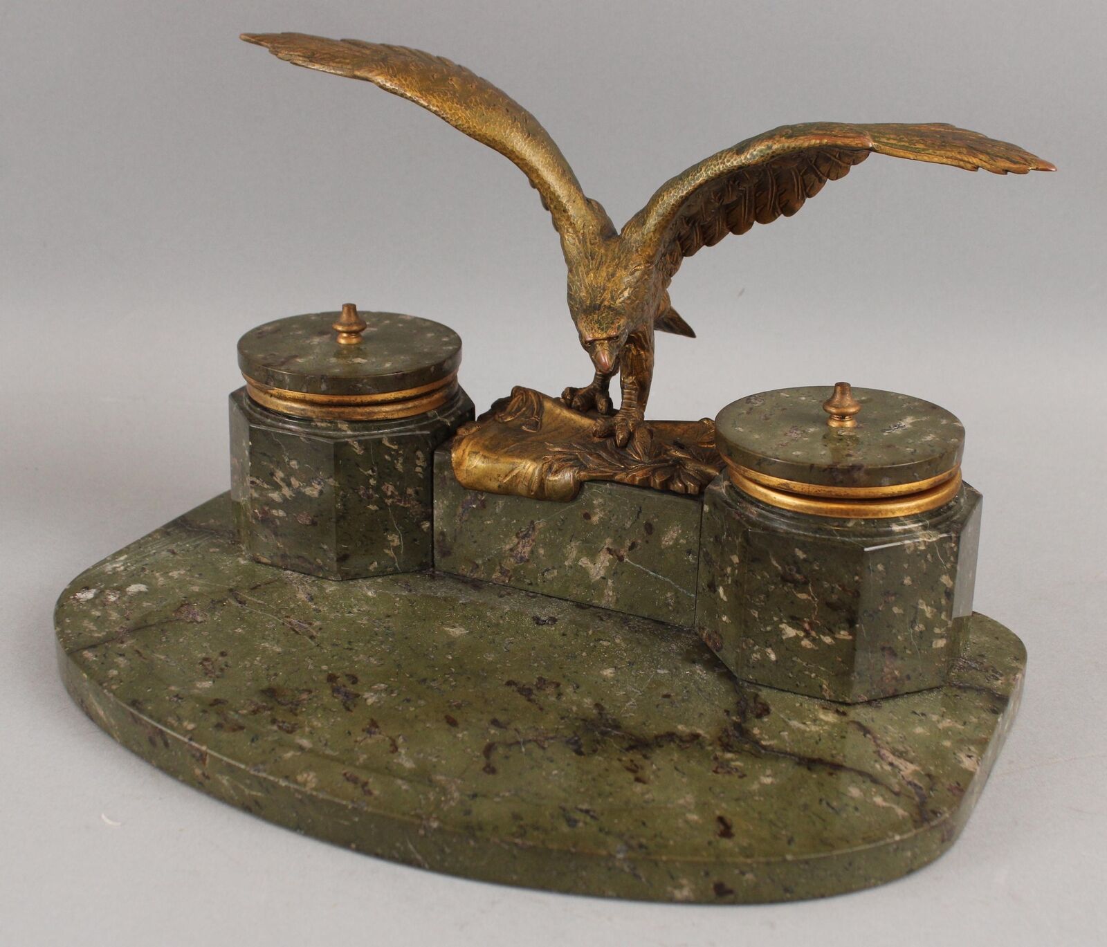 Marble inkstand with a gold gilt bronze eagle, wings spread, perched protecting a flag. On either side of the eagle are receptacles for inkwells with hinged lids. One glass insert is missing.