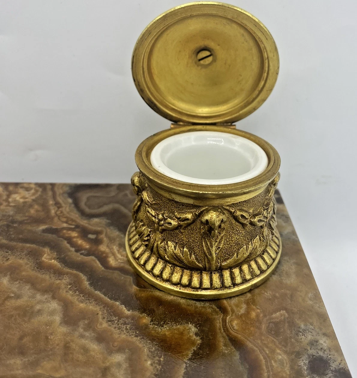 • The Inkwell: A single circular bronze inkwell sits to the right of the figure. It features a hinged lid with a pinecone or acorn finial and is decorated with classical wreath and garland motifs. It contains its original white ceramic porcelain liner.