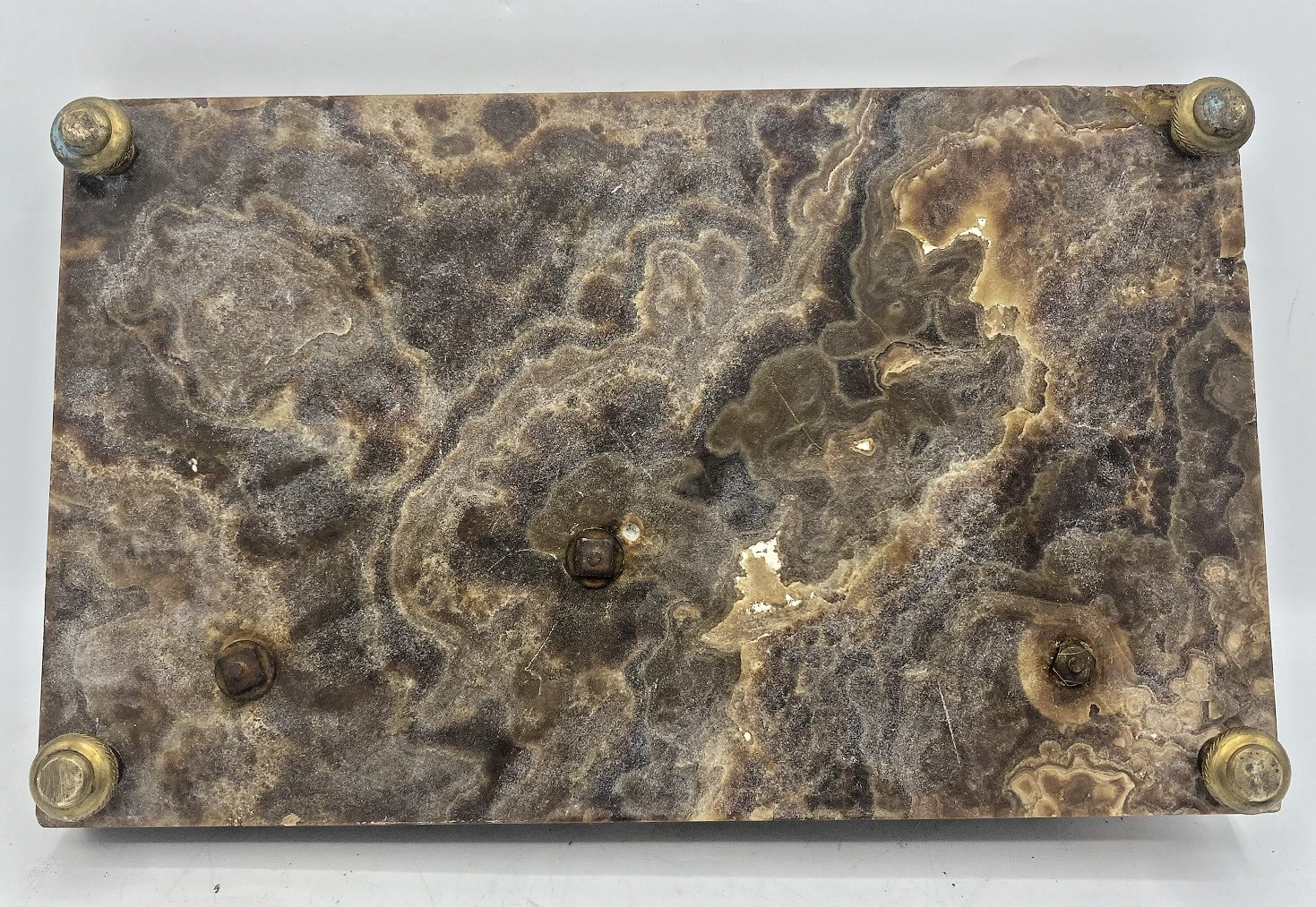 • The Base: The base is crafted from a thick slab of banded onyx (often referred to as Algerian or “onyx marble”), showing deep honey and brown veining. It has a deep, integrated pen tray carved directly into the stone.