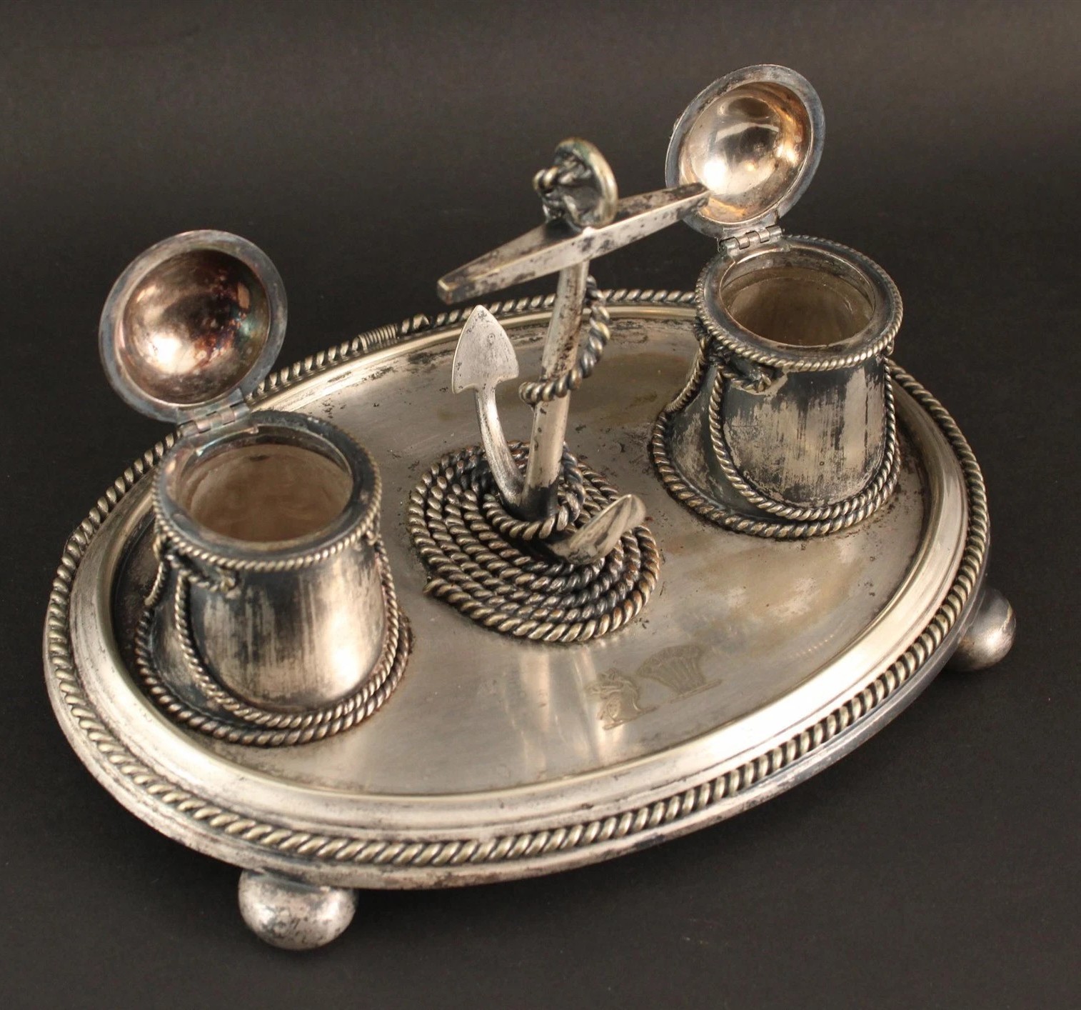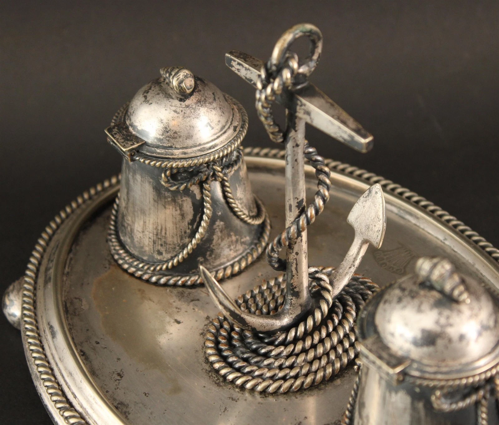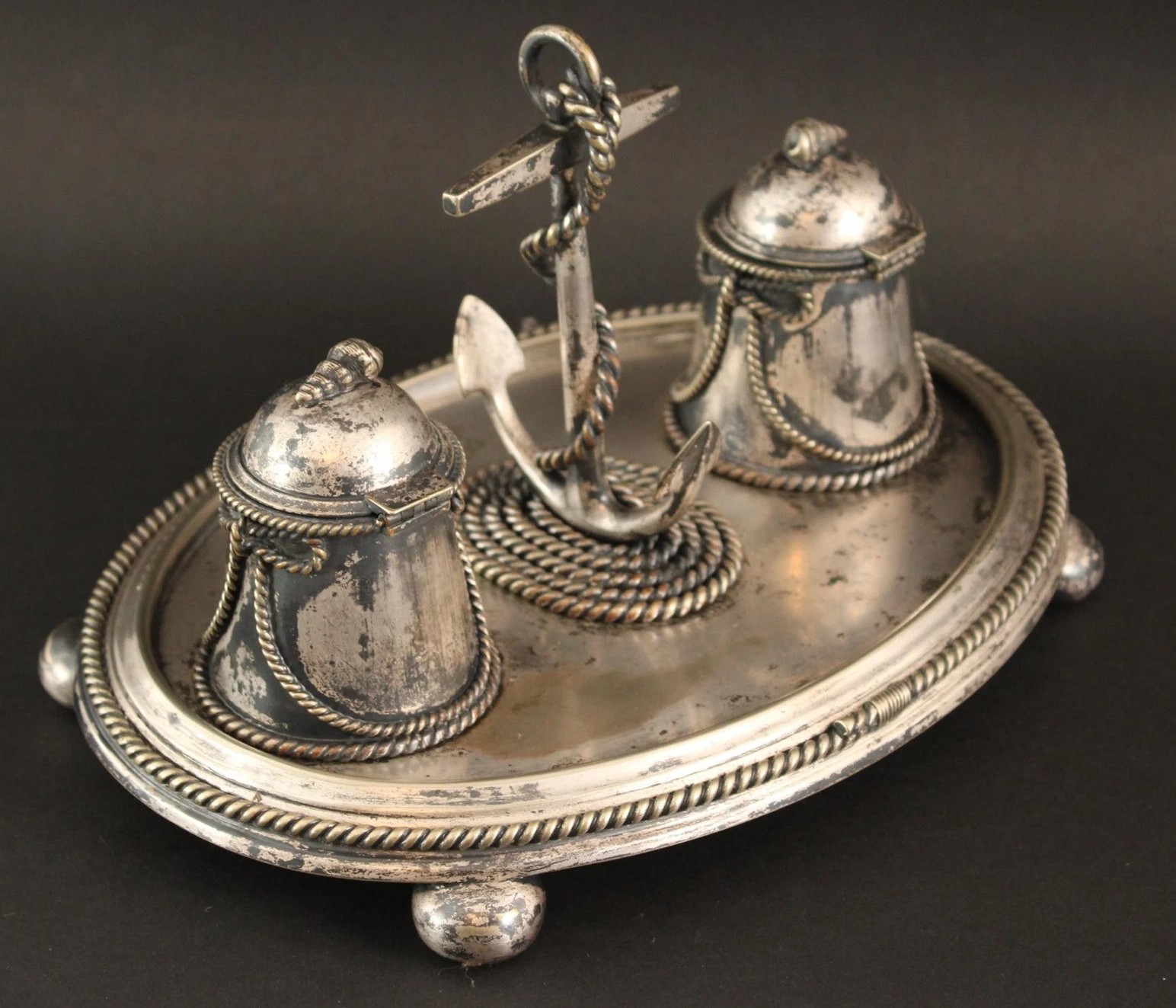 - Overall Form: An oval, footed tray supporting a central anchor and two flanking inkwells. The entire piece is designed with a nautical motif.