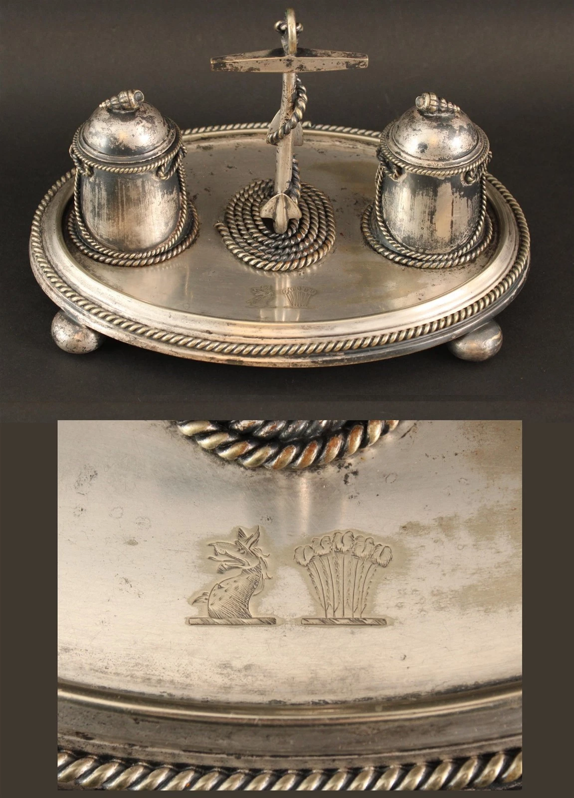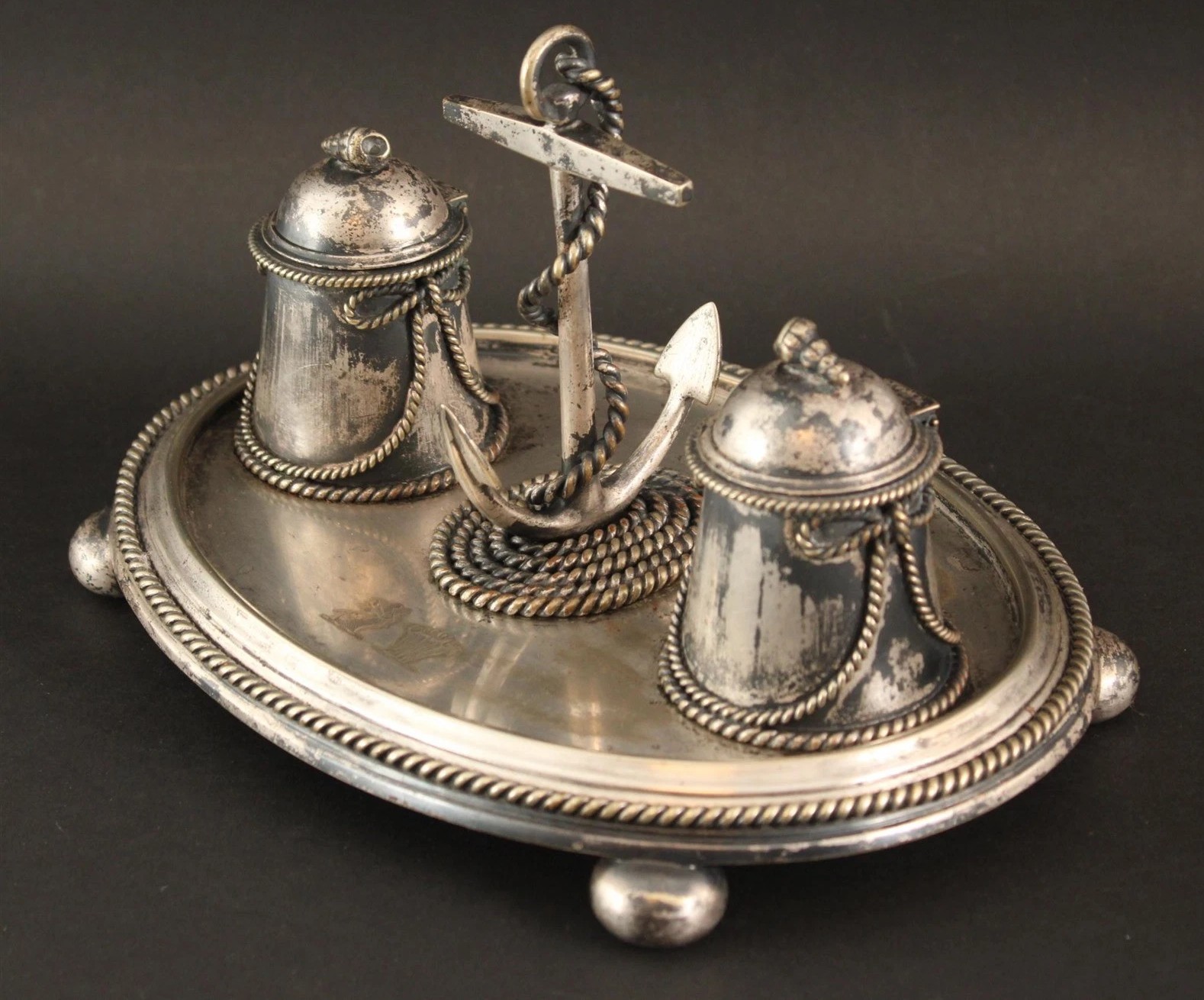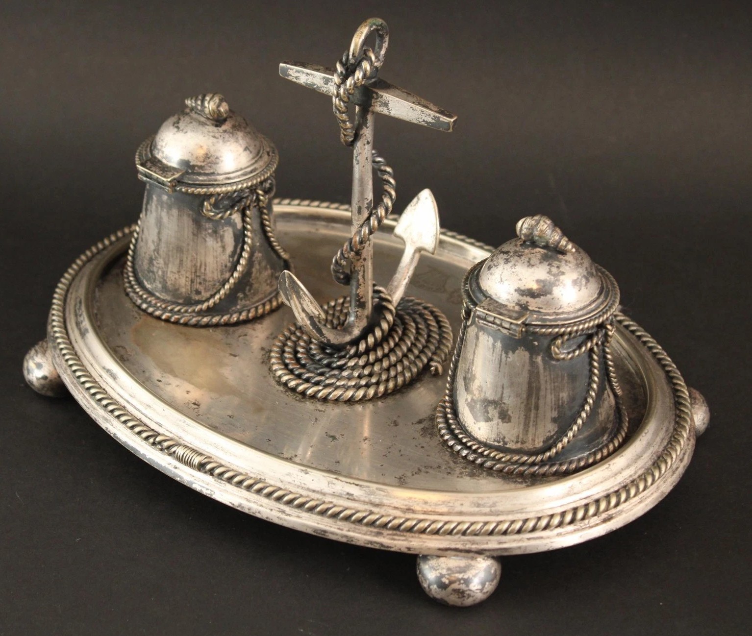 - Overall Form: An oval, footed tray supporting a central anchor and two flanking inkwells. The entire piece is designed with a nautical motif.