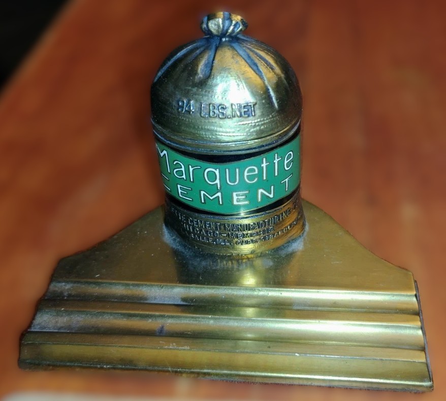 Featured is a cement bag advertising the Marquette Cement Manufacturing Co. The inkstand has a bronze finish with green, white, and black enameling showing the company’s name. Impressed on the hinged lid is “94 lbs. net”. On the bag are company locations: Chicago, LaSalle, Ill., and Cape Girardeau, Mo.