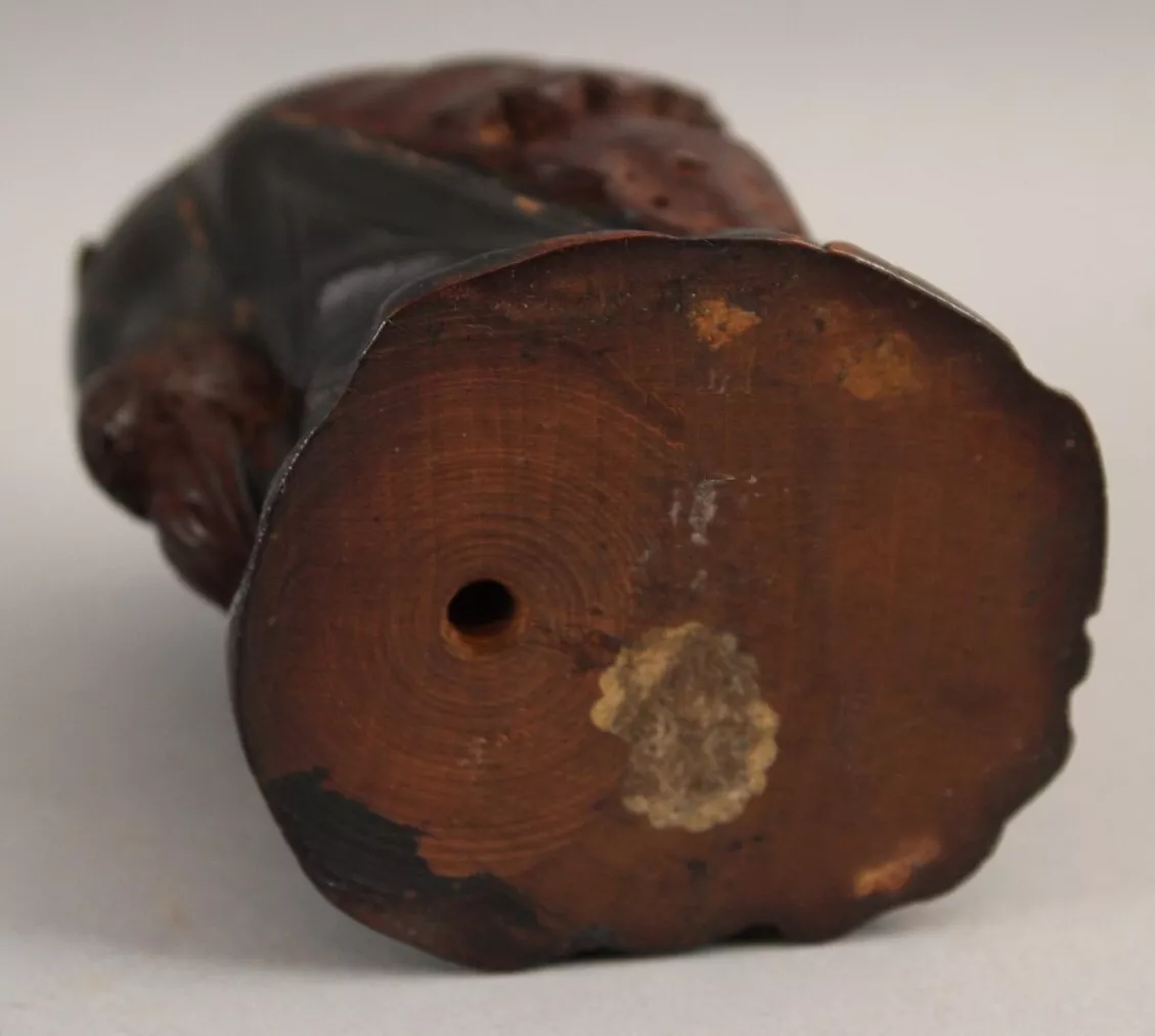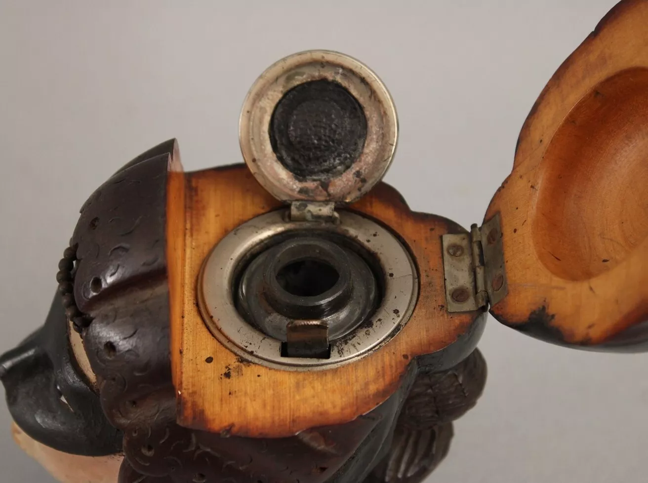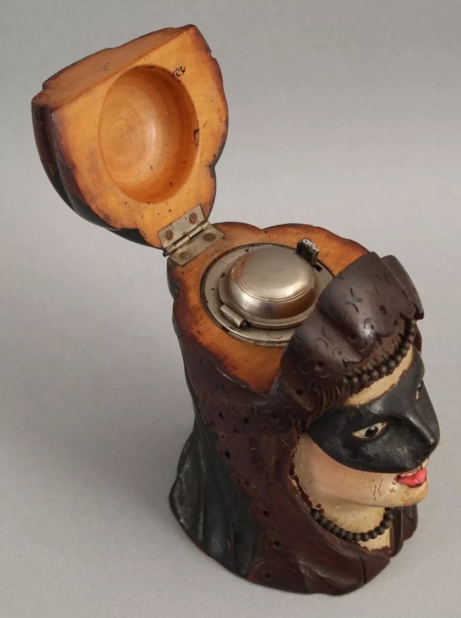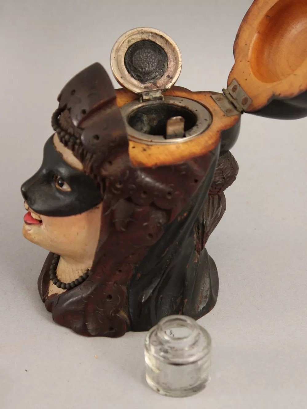 This 19th century hand-carved inkwell depicts the head of a woman wearing a hood and a masquerade mask. It is hand-carved from hardwood and retains its original hand-painted surface, small carved and applied teeth, glass eyes, applied beaded necklace, and headpiece. Lifting the woman’s hood, one finds the original nickel-plated inkwell and removable glass bottle. The inkwell has a locking, spring-loaded hinged lid.