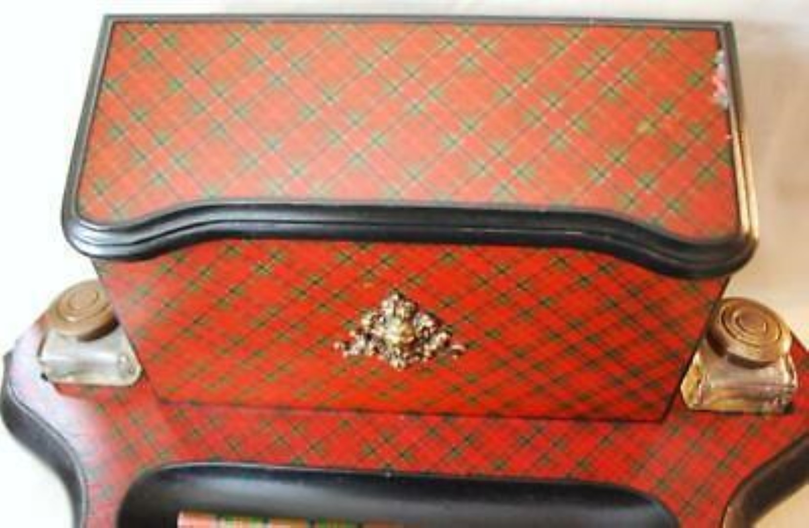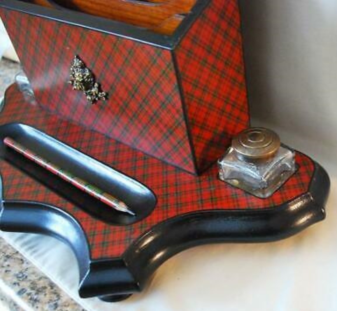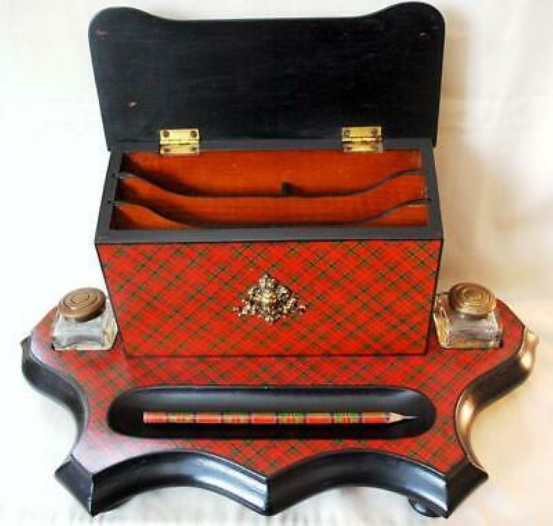 This Tartan ware pedestal desk set has a three compartment letter holder. On the front is a metal decoration resembling a cherub. To either side are inkwells with brass tops and in the front is a large pen/pencil holder. (There is some loss to the tartan on the upper right-hand corner of the envelope box).