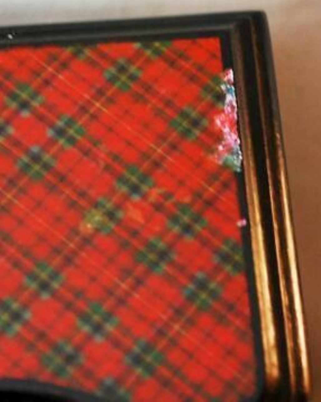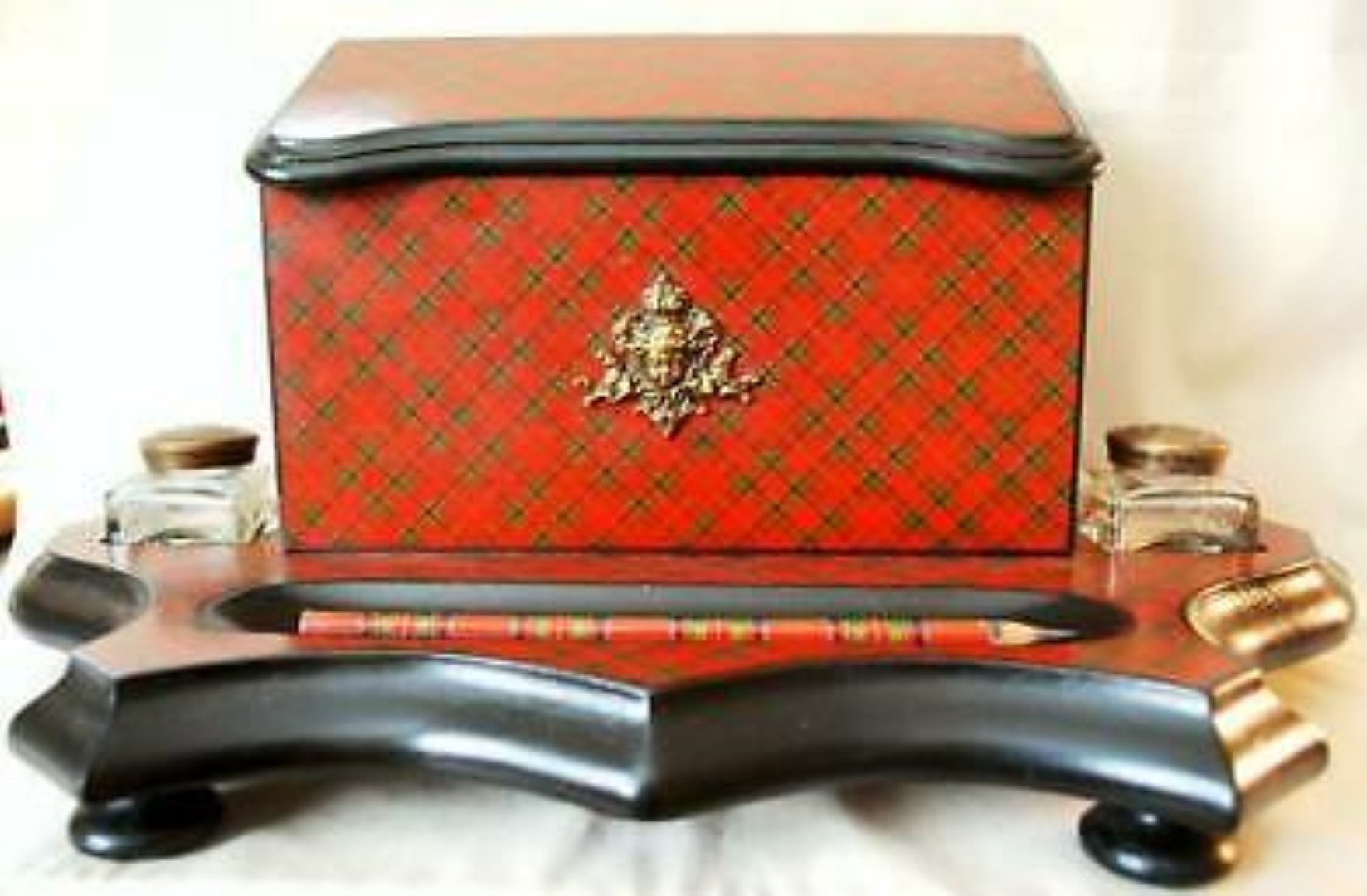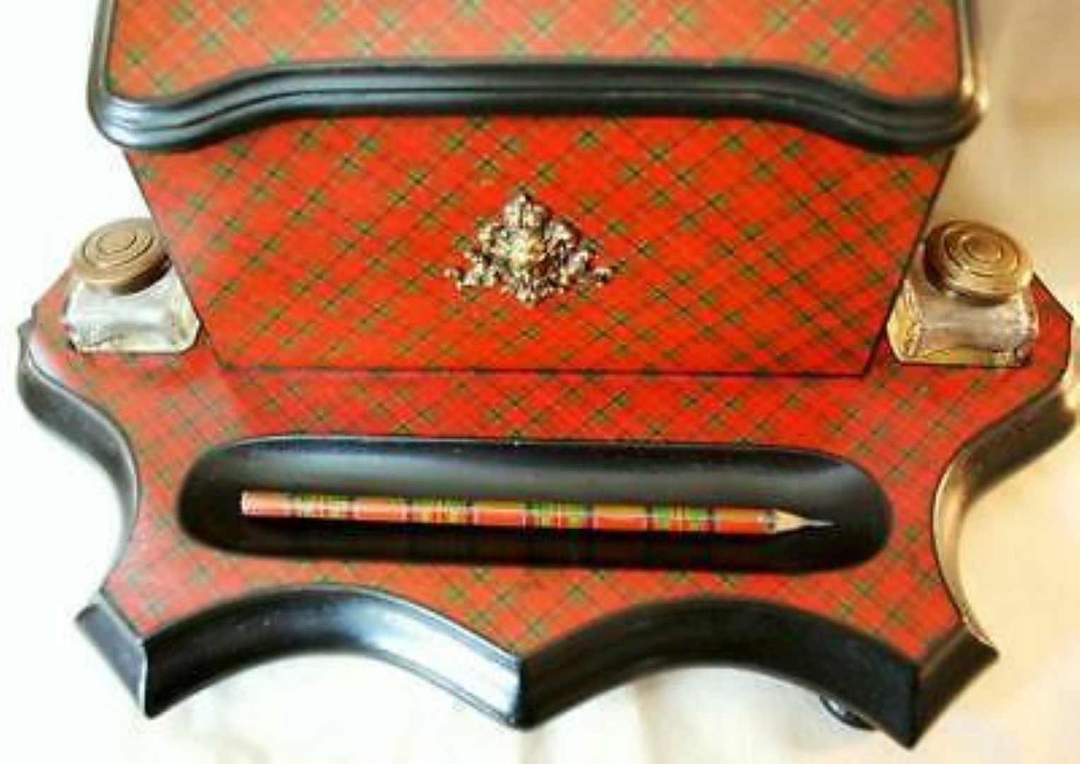 This Tartan ware pedestal desk set has a three compartment letter holder. On the front is a metal decoration resembling a cherub. To either side are inkwells with brass tops and in the front is a large pen/pencil holder. (There is some loss to the tartan on the upper right-hand corner of the envelope box).