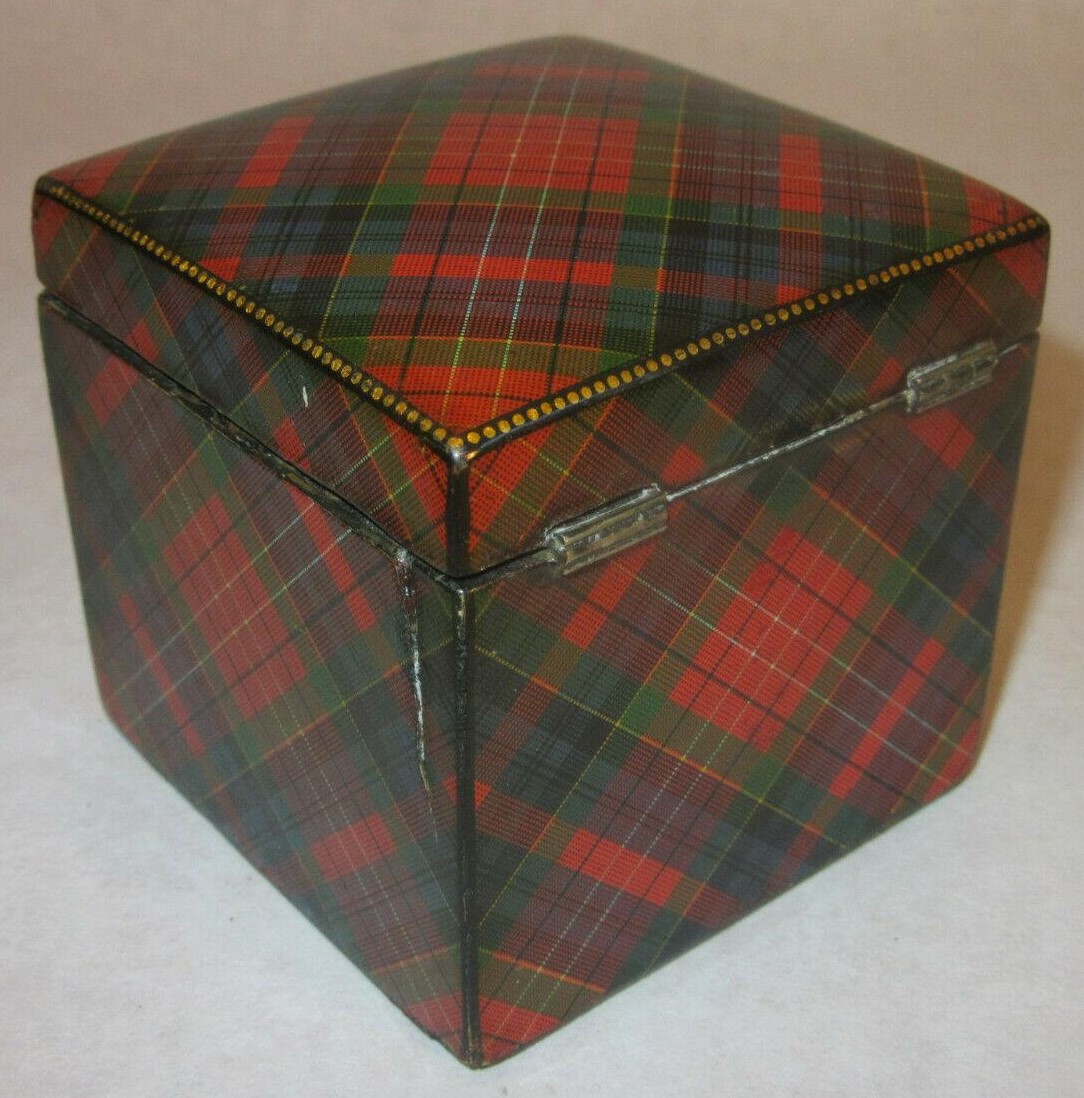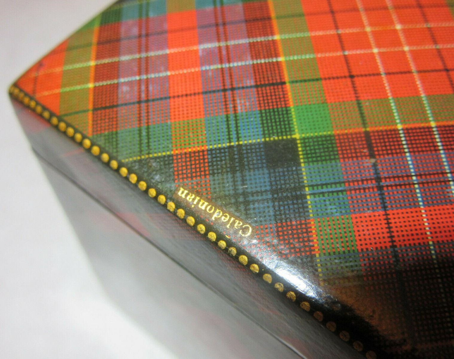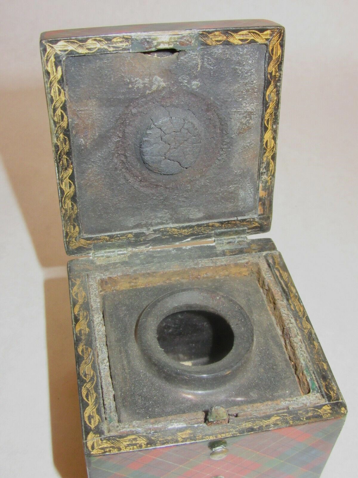 Traveling inkwell in a Mauchline Caledonian Tartan case. Push-button release opens the hinged lid to access the inkwell.