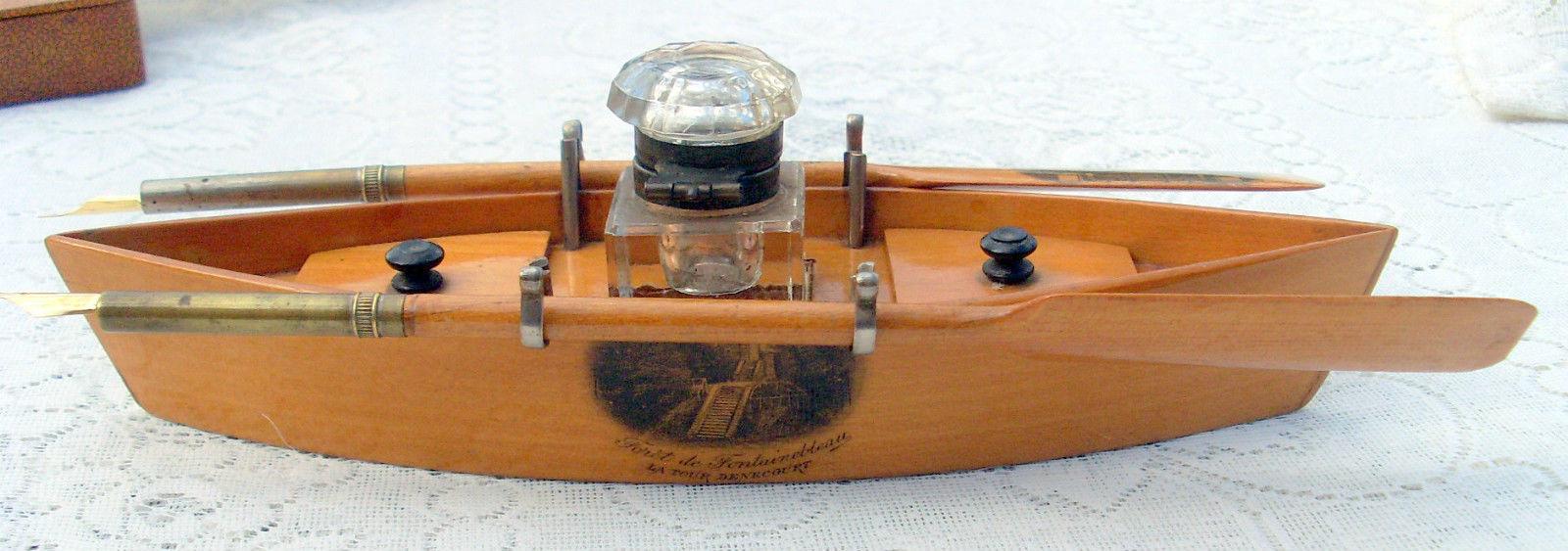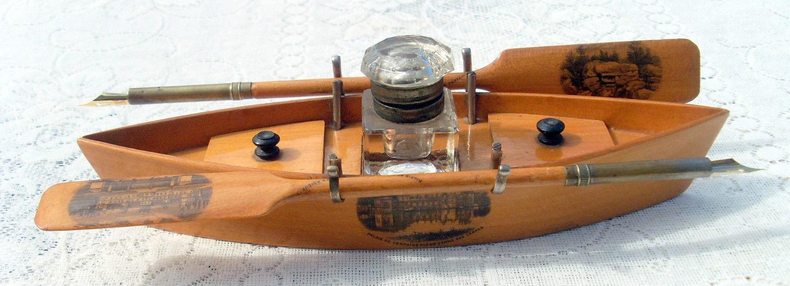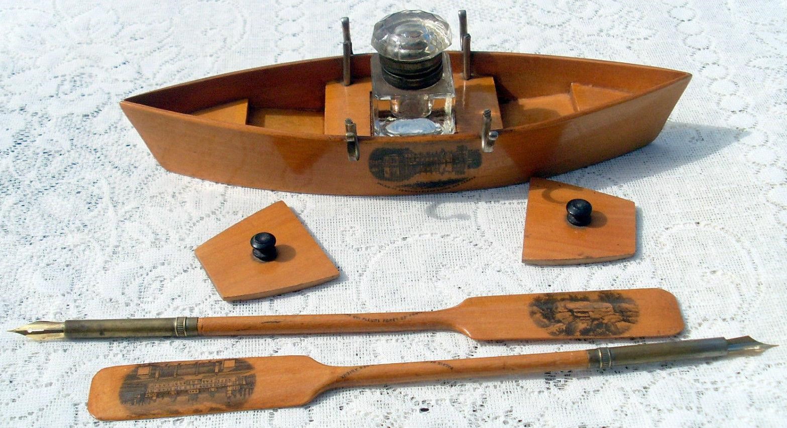 A Mauchline ware inkstand in the shape of a boat with two paddle-shaped dip pens. The boat has two small storage pockets with lids. Depicted are French scenes: two scenes from the Palace Fontainebleau and two from the fort at Fontainebleau.