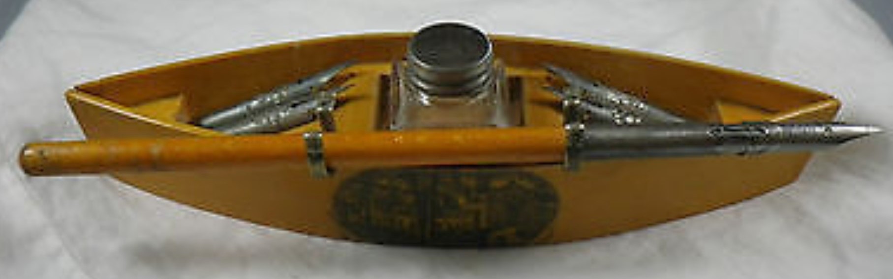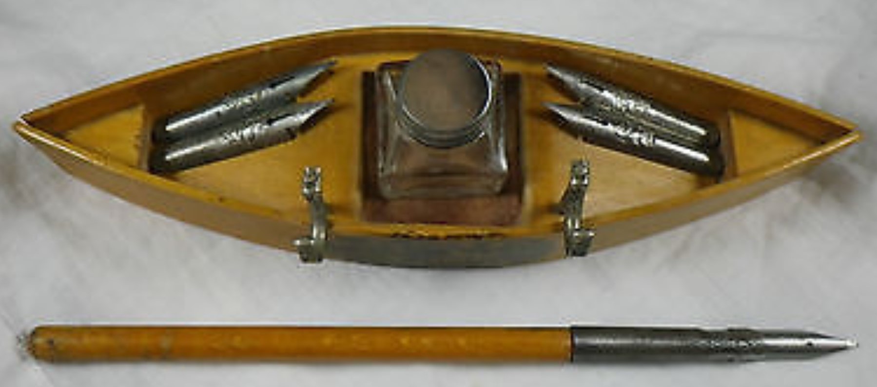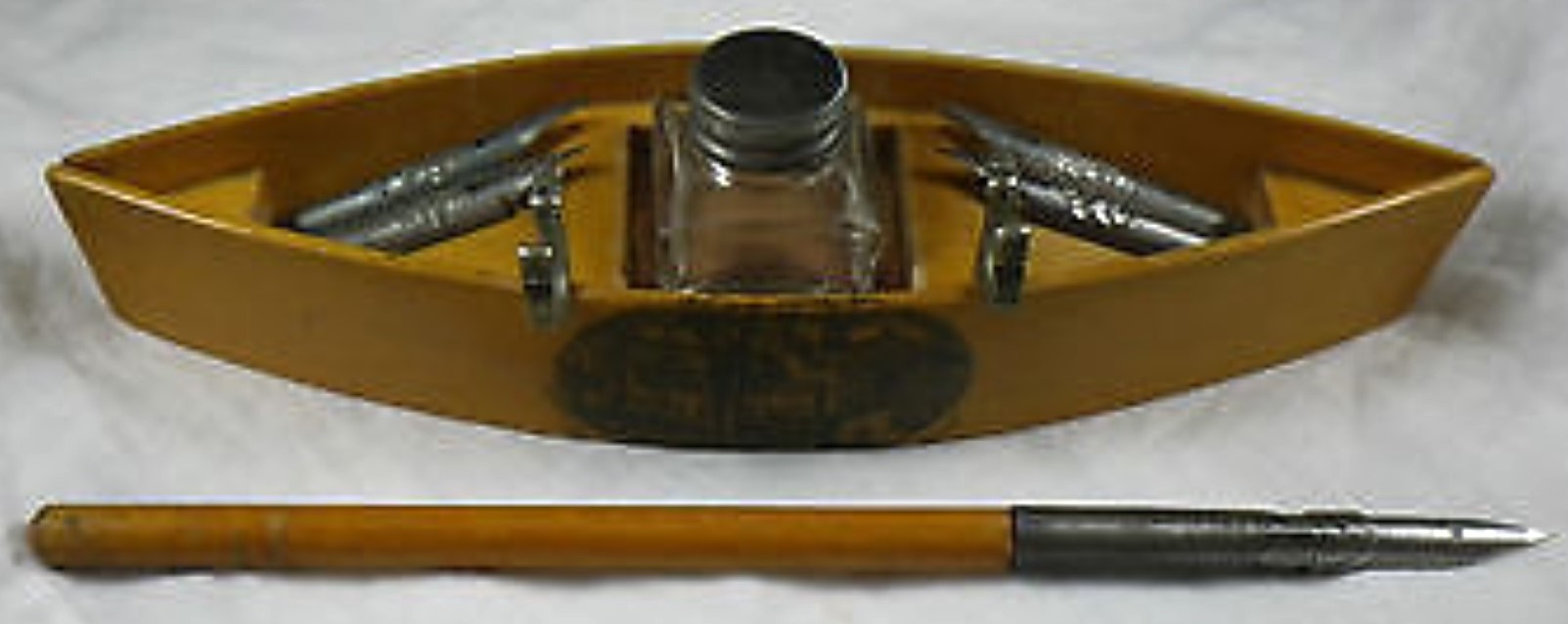Mauchline ware boat-shaped inkstand with dip pen and nibs. Pictured on the boat is the spa Thermal de Bourbon-L’Archambault. The inkwell pictured here is not original to the piece.