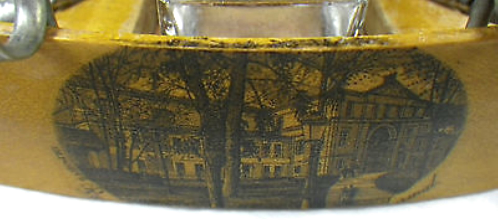 The production of Scottish white-wood products, or Mauchline ware, was carried out from the 1820s until 1939 by the firm of W & A Smith among other less long-lived manufacturers. Often, they used a basic transfer as on this inkstand, each piece having the view of the place of purchase. The transfer subjects ranged across Scotland and more of the British Isles to the rest of the world. A fire in 1933 stopped production, which was never restarted, and W & A Smith finally closed in 1939.