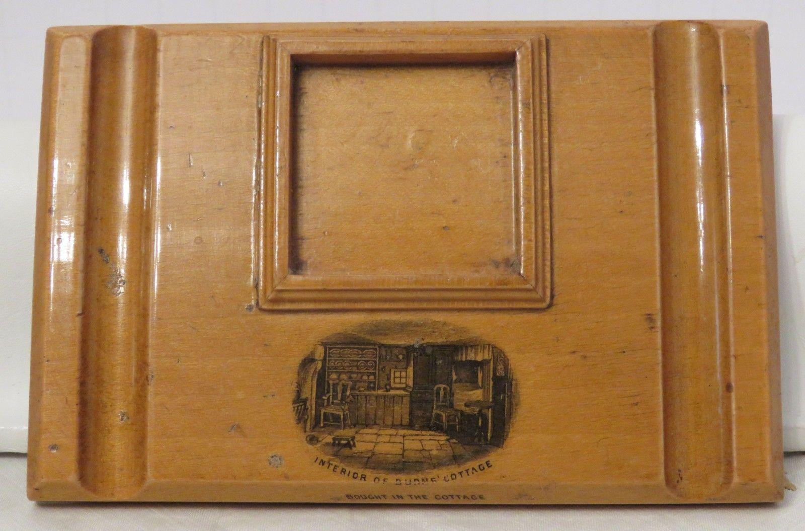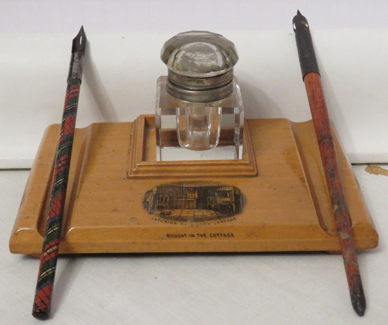A Mauchline ware desk set consisting of a wood base, bevel-cut hinged glass inkwell, and two tartan ware dip pens. The wood base has two curved slots for pens and a square recess for the inkwell and rests on four round wooden legs. The is a oval-shaped transfer of the “Interior of Burns’ Cottage” applied to the base.