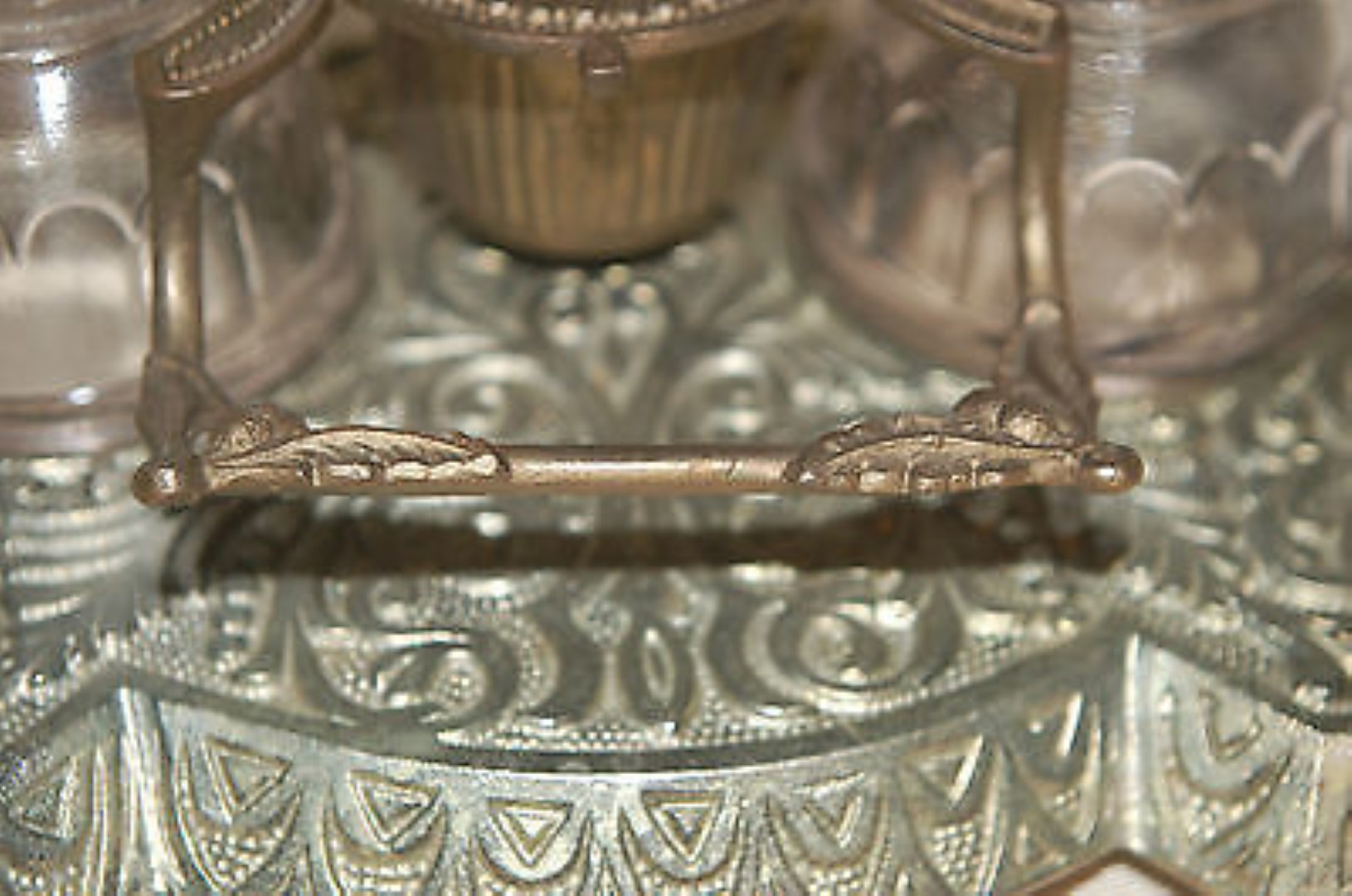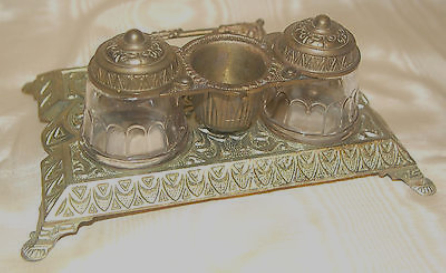 Brass double inkstand marked on the bottom “Patented June 17, 1878”. The lids of the removable inkwells swivel open and closed. A storage cup between the inkwells and an attached pen holder complete the piece.