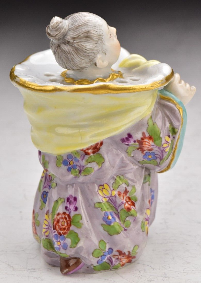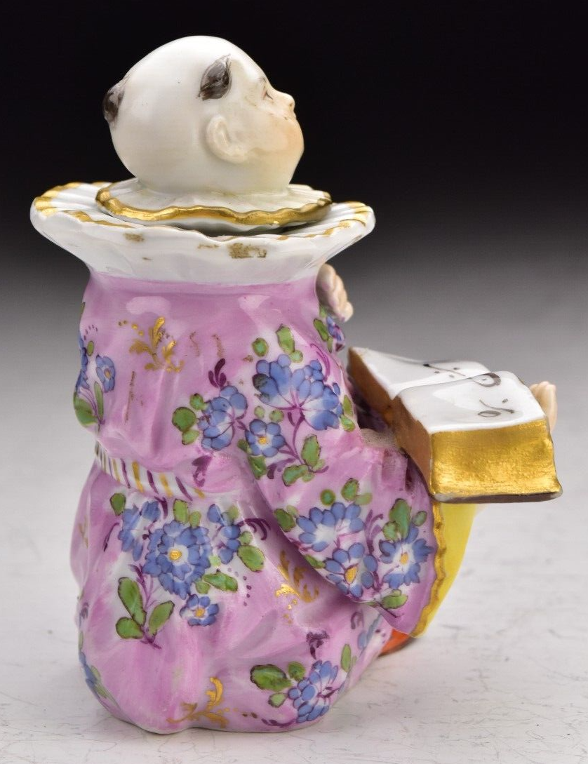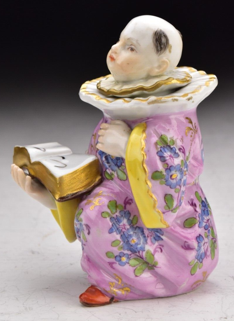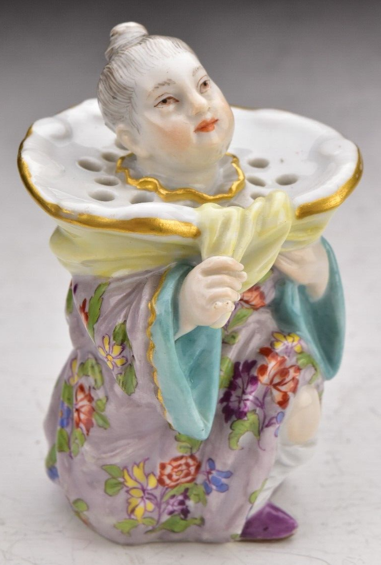 A hand painted Meissen porcelain figural inkwell and matching sander in the form of a boy and girl decorated in chinoiserie. The boy is an inkwell, his head coming off to access the ink. The girl is a sander, her collar perforated to dispense pounce. The pieces are marked with the Meissen crossed swords.
