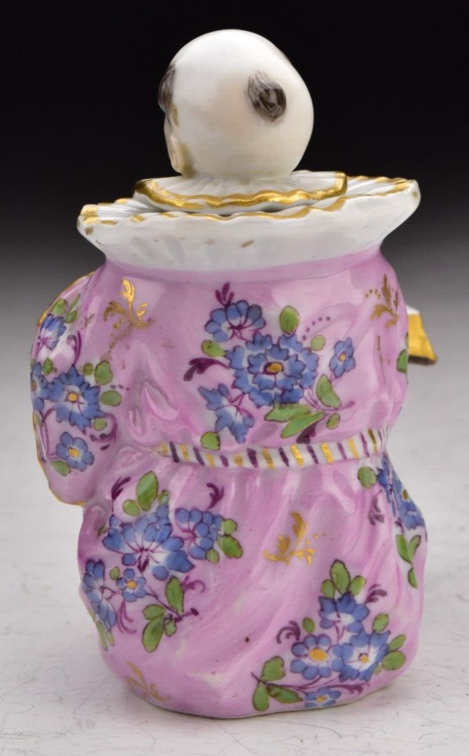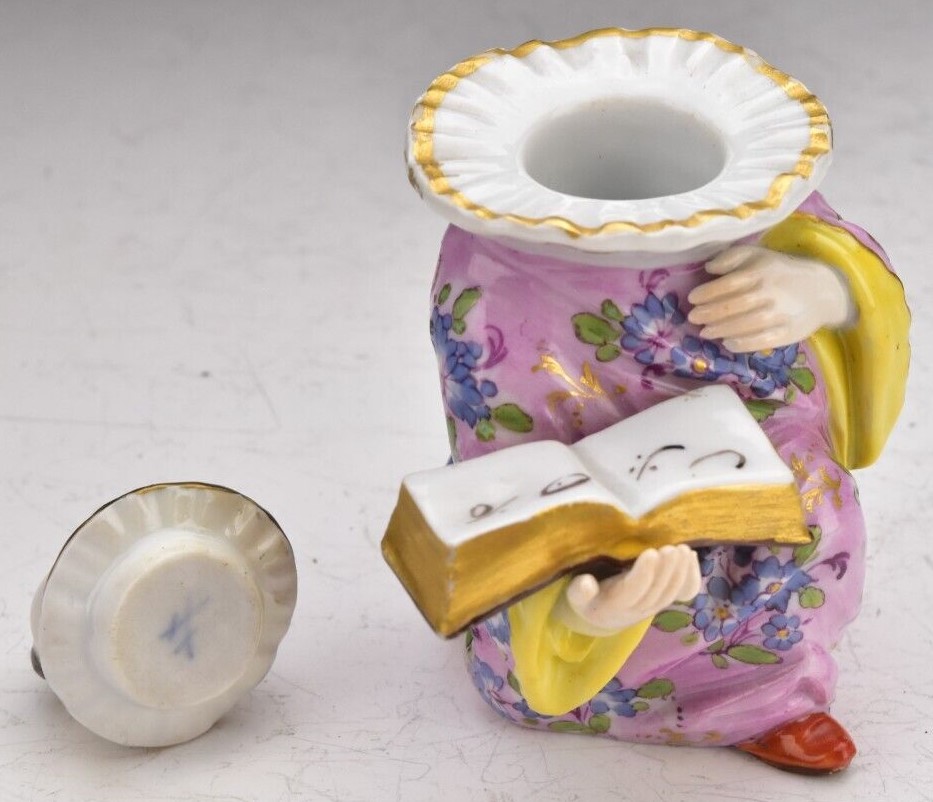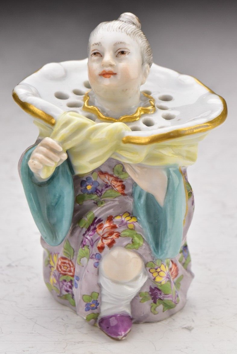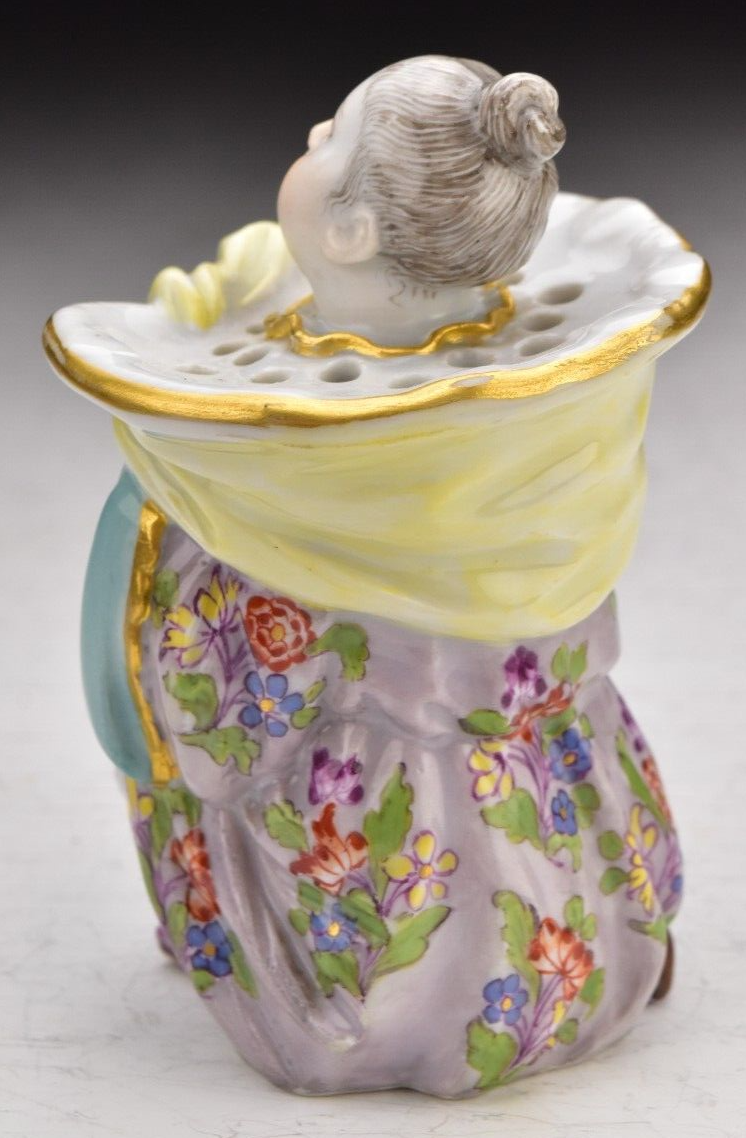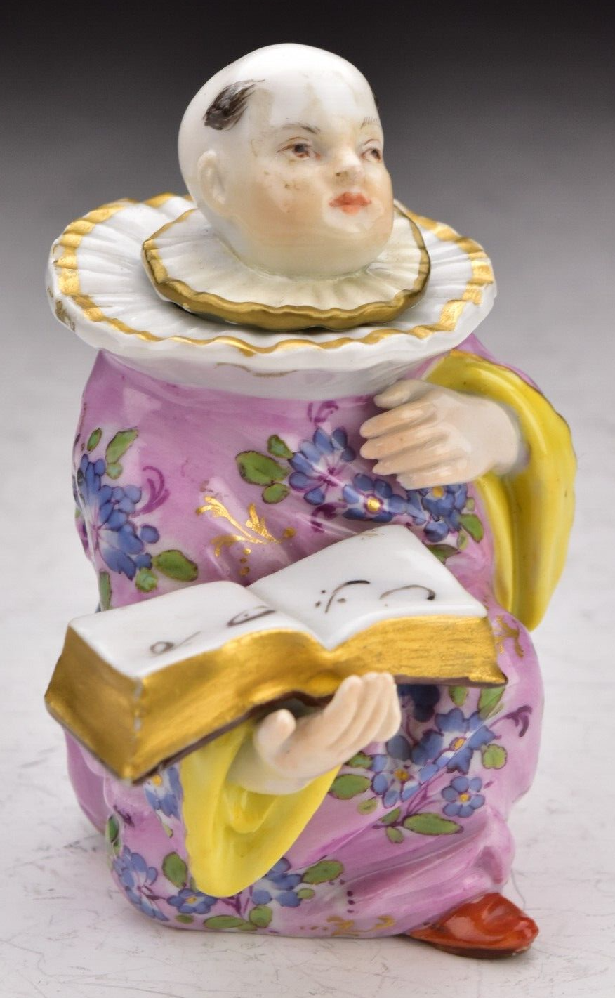 A hand painted Meissen porcelain figural inkwell and matching sander in the form of a boy and girl decorated in chinoiserie. The boy is an inkwell, his head coming off to access the ink. The girl is a sander, her collar perforated to dispense pounce. The pieces are marked with the Meissen crossed swords.